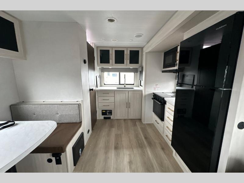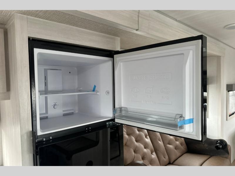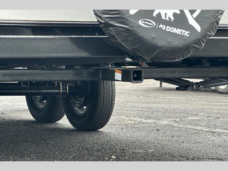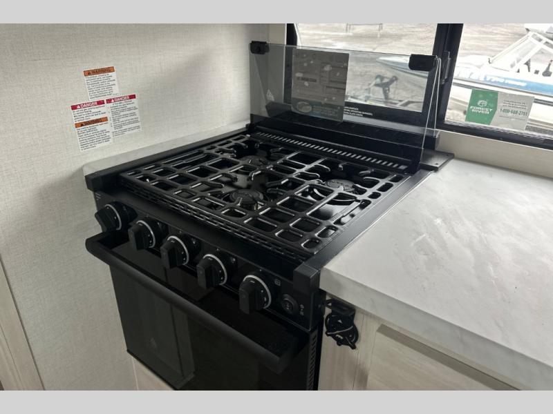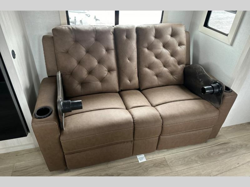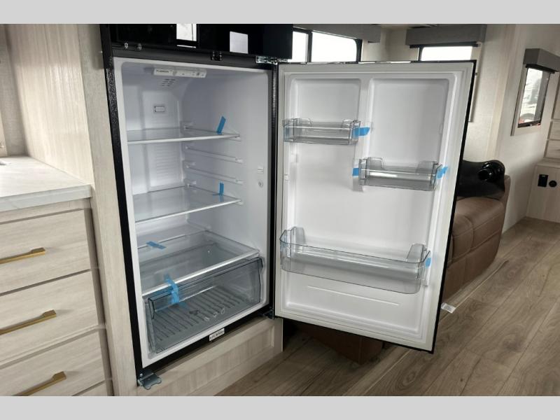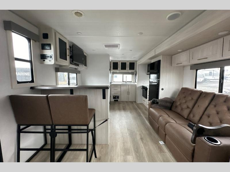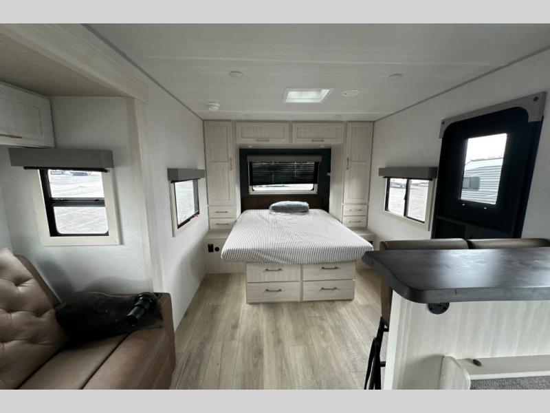 You'll love camping and spending time with loved ones in this spacious travel trailer. The 18' power awning with LED lights can be set up once you arrive at the campground, and you can unload camp gear from the pass-through storage. Head inside to make lunch on the residential range top or in the microwave oven. There is a booth dinette and tri-fold sofa for seating space, plus an additional counter with bar stools beside the dinette. A full bath onboard lets you clean up each day, and the front queen bed is sure to bring a great night's rest. There are also dual wardrobes to keep your space tidy and overhead storage for even more belongings.
