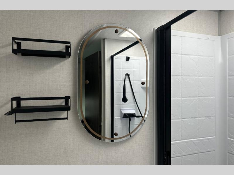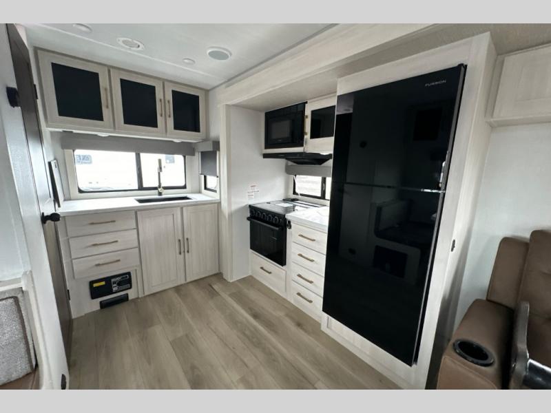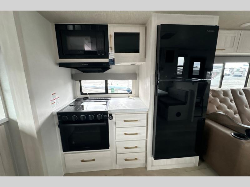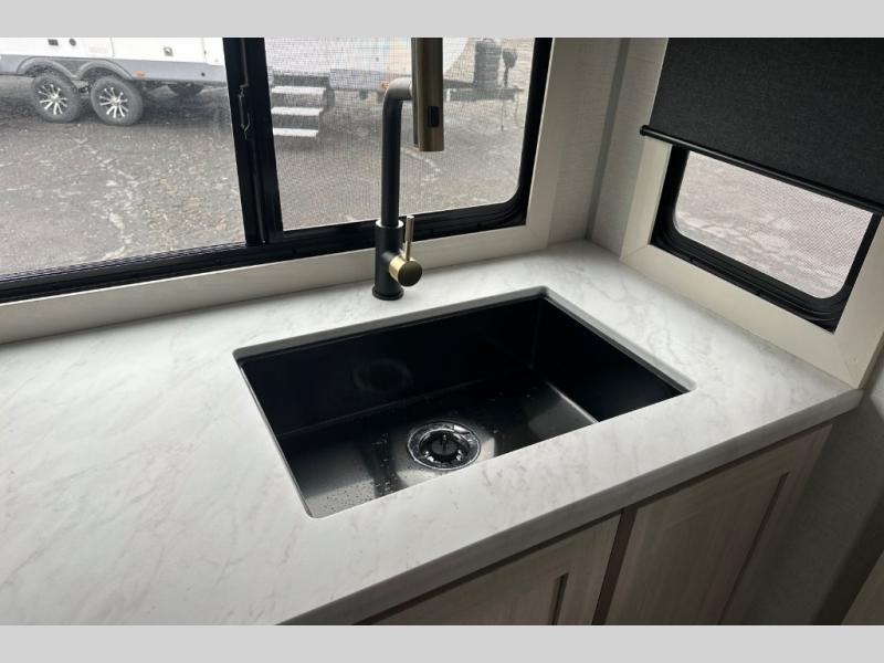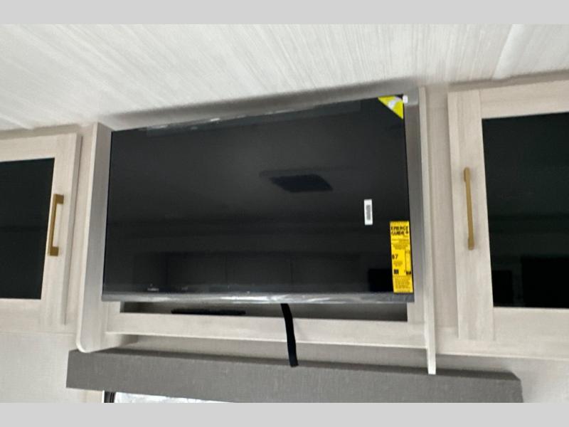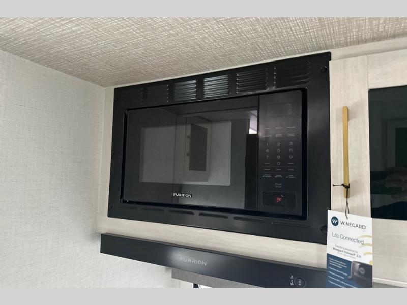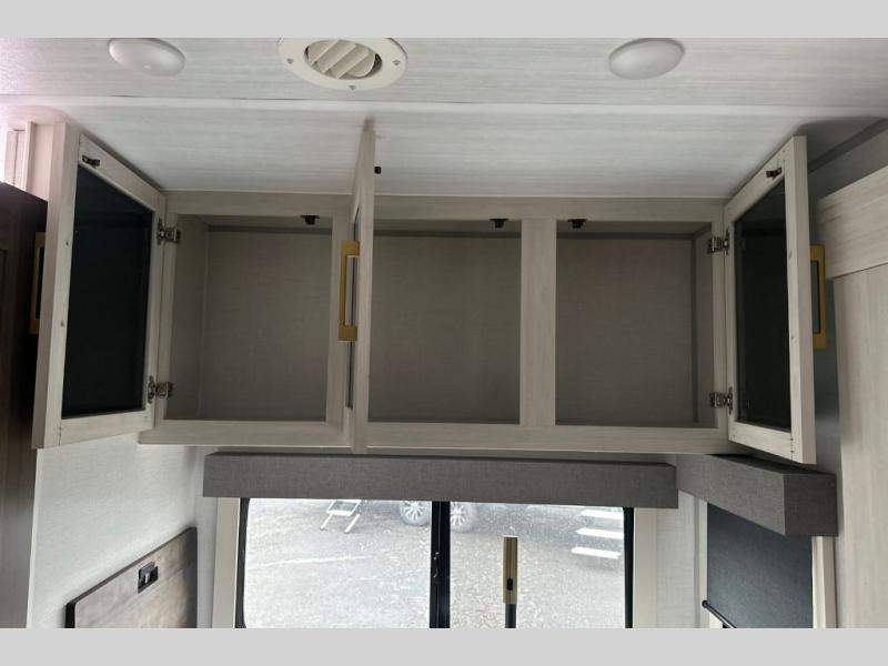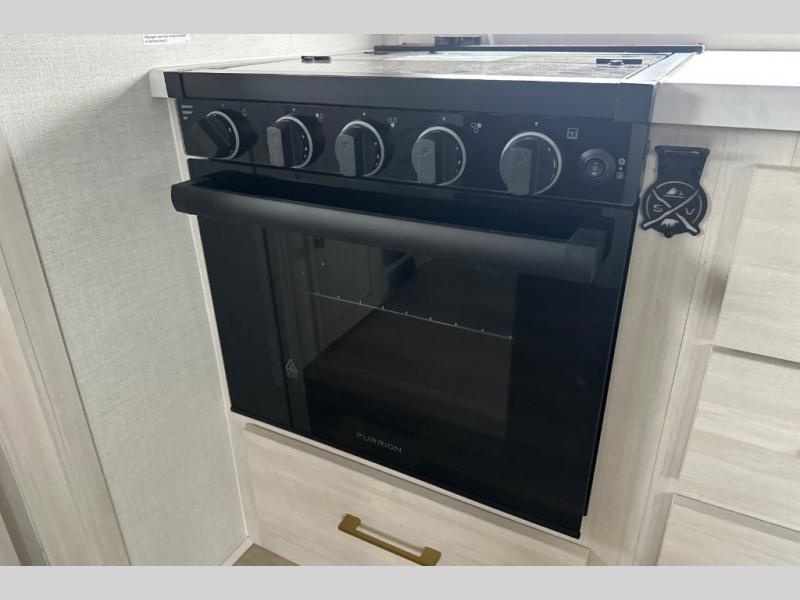 You'll love camping and spending time with loved ones in this spacious travel trailer. The 18' power awning with LED lights can be set up once you arrive at the campground, and you can unload camp gear from the pass-through storage. Head inside to make lunch on the residential range top or in the microwave oven. There is a booth dinette and tri-fold sofa for seating space, plus an additional counter with bar stools beside the dinette. A full bath onboard lets you clean up each day, and the front queen bed is sure to bring a great night's rest. There are also dual wardrobes to keep your space tidy and overhead storage for even more belongings.