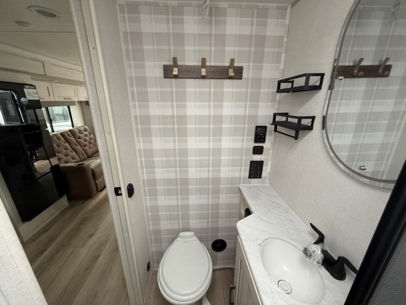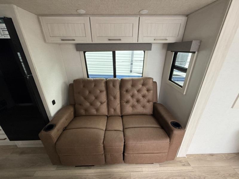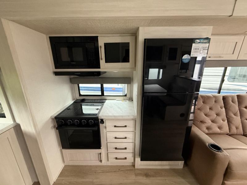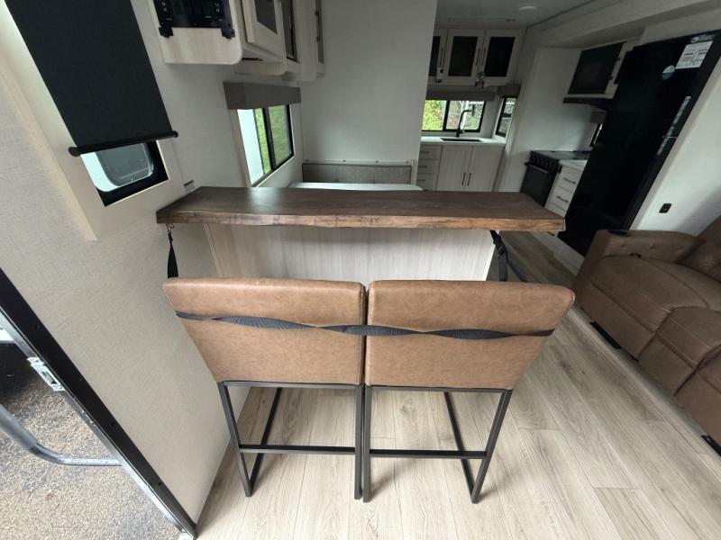 You'll love camping and spending time with loved ones in this spacious travel trailer. The 18' power awning with LED lights can be set up once you arrive at the campground, and you can unload camp gear from the pass-through storage. Head inside to make lunch on the residential range top or in the microwave oven. There is a booth dinette and tri-fold sofa for seating space, plus an additional counter with bar stools beside the dinette. A full bath onboard lets you clean up each day, and the front queen bed is sure to bring a great night's rest. There are also dual wardrobes to keep your space tidy and overhead storage for even more belongings.