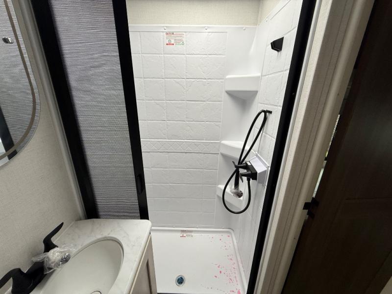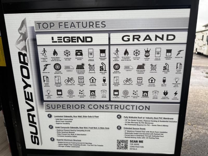 With any Surveyor Legend travel trailer by Forest River you will enjoy quality craftsmanship, convenient amenities, and at-home comforts. The Azdel composite walls provide a longer-lasting trailer, and the power tongue jack with a hitch light will get you back on the road in no-time. There are also Goodyear tires and a tire pressure monitoring system for hassle-free towing. Each model includes the Surveyor Legend Package that comes standard with oversized dinette storage access doors, front slam latch baggage doors, plus an automotive style tinted front windshield. You'll appreciate camping with a tankless water heater for endless hot showers, a 2" accessory hitch to bring bikes along, plus carpet-free interiors and a central vacuum system for easy clean up.