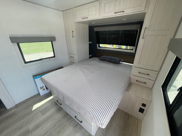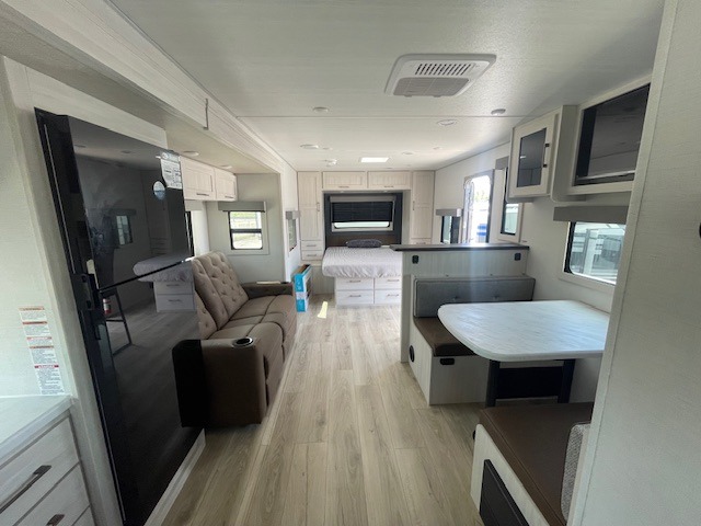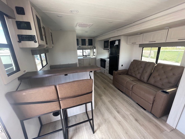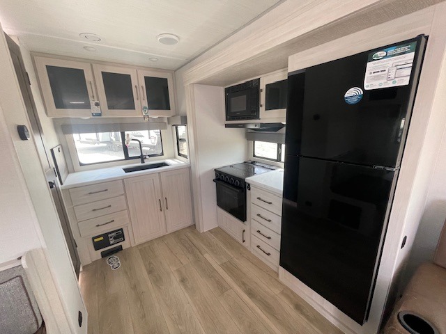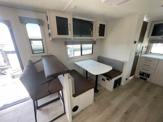You'll love camping and spending time with loved ones in this spacious travel trailer. The 18' power awning with LED lights can be set up once you arrive at the campground, and you can unload camp gear from the pass-through storage. Head inside to make lunch on the residential range top or in the microwave oven. There is a booth dinette and tri-fold sofa for seating space, plus an additional counter with bar stools beside the dinette. A full bath onboard lets you clean up each day, and the front queen bed is sure to bring a great night's rest. There are also dual wardrobes to keep your space tidy and overhead storage for even more belongings.
