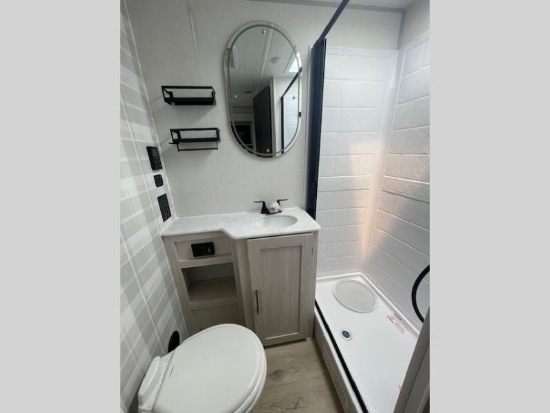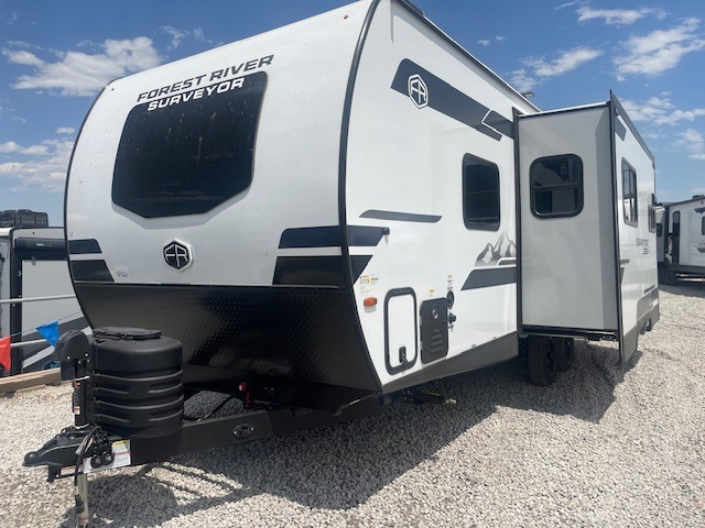 With any Surveyor Legend travel trailer by Forest River you will enjoy quality craftsmanship, convenient amenities, and at-home comforts. The Azdel composite walls provide a longer-lasting trailer, and the power tongue jack with a hitch light will get you back on the road in no-time. There are also Goodyear tires and a tire pressure monitoring system for hassle-free towing. Each model includes the Surveyor Legend Package that comes standard with oversized dinette storage access doors, front slam latch baggage doors, plus an automotive style tinted front windshield. You'll appreciate camping with a tankless water heater for endless hot showers, a 2" accessory hitch to bring bikes along, plus carpet-free interiors and a central vacuum system for easy clean up.