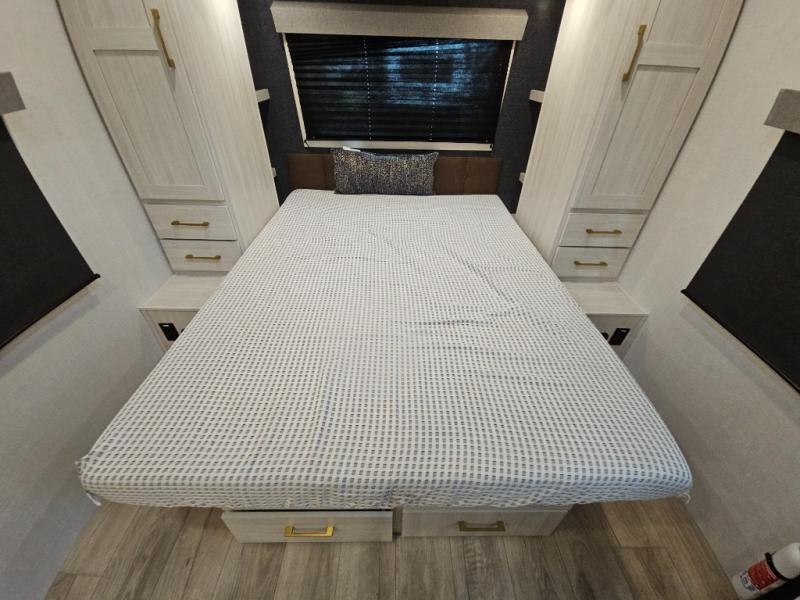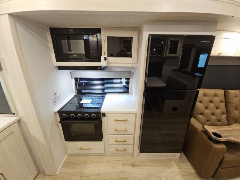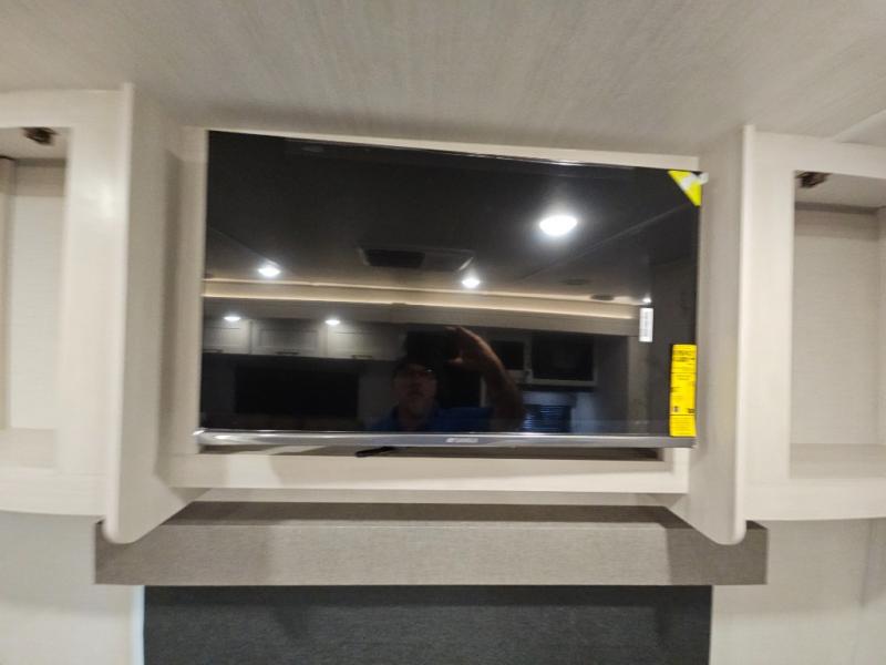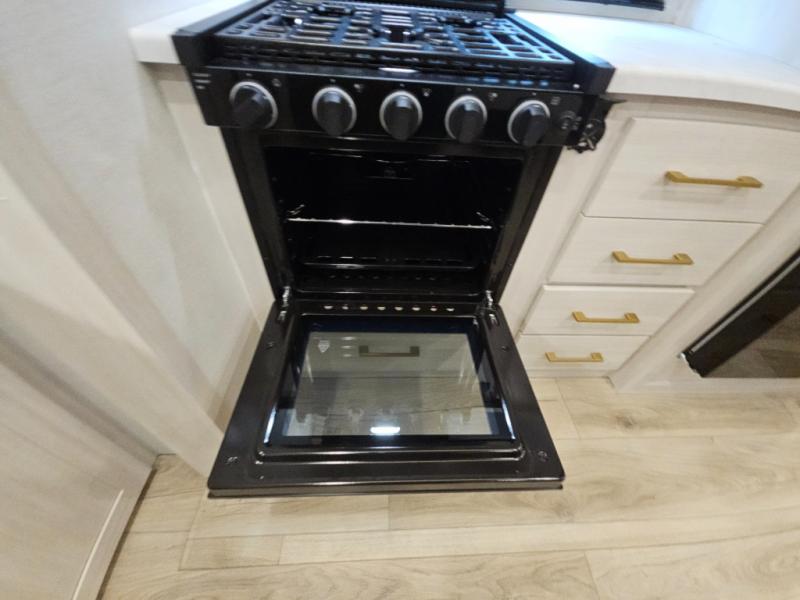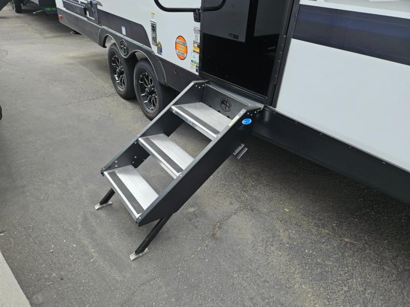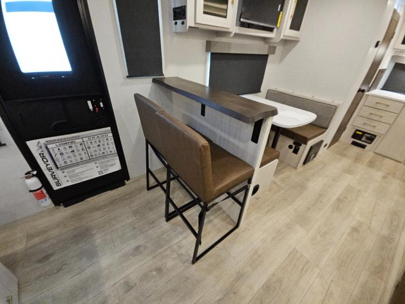 You'll love camping and spending time with loved ones in this spacious travel trailer. The 18' power awning with LED lights can be set up once you arrive at the campground, and you can unload camp gear from the pass-through storage. Head inside to make lunch on the residential range top or in the microwave oven. There is a booth dinette and tri-fold sofa for seating space, plus an additional counter with bar stools beside the dinette. A full bath onboard lets you clean up each day, and the front queen bed is sure to bring a great night's rest. There are also dual wardrobes to keep your space tidy and overhead storage for even more belongings.