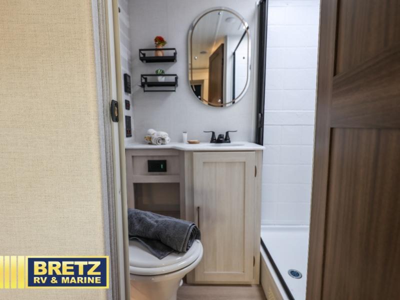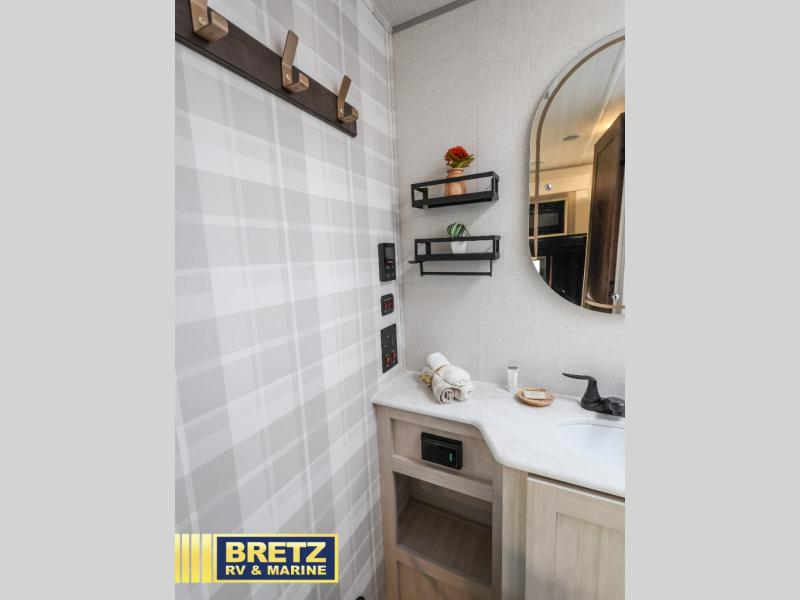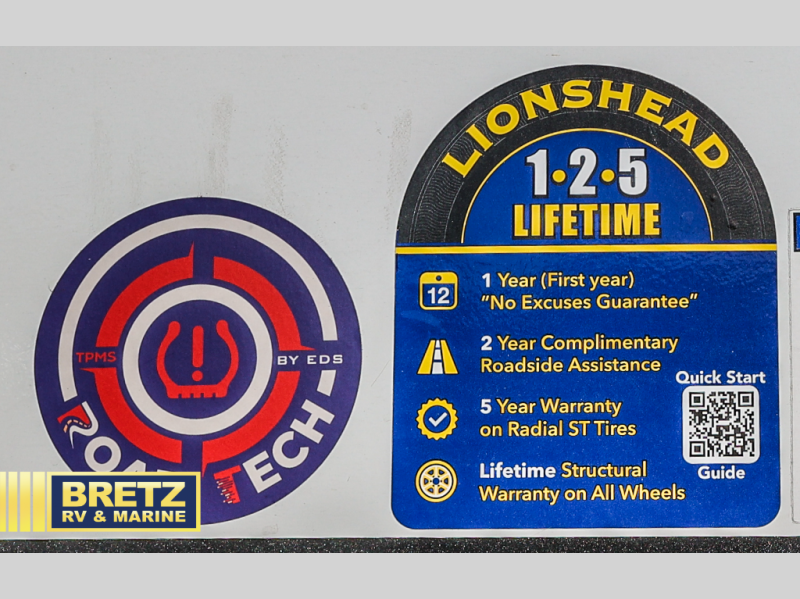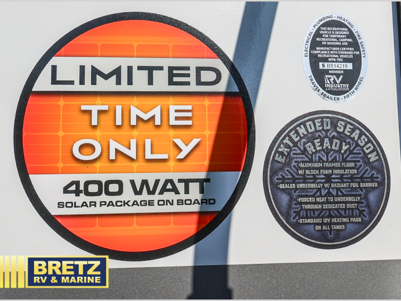 You'll love camping and spending time with loved ones in this spacious travel trailer. The 18' power awning with LED lights can be set up once you arrive at the campground, and you can unload camp gear from the pass-through storage. Head inside to make lunch on the residential range top or in the microwave oven. There is a booth dinette and tri-fold sofa for seating space, plus an additional counter with bar stools beside the dinette. A full bath onboard lets you clean up each day, and the front queen bed is sure to bring a great night's rest. There are also dual wardrobes to keep your space tidy and overhead storage for even more belongings.