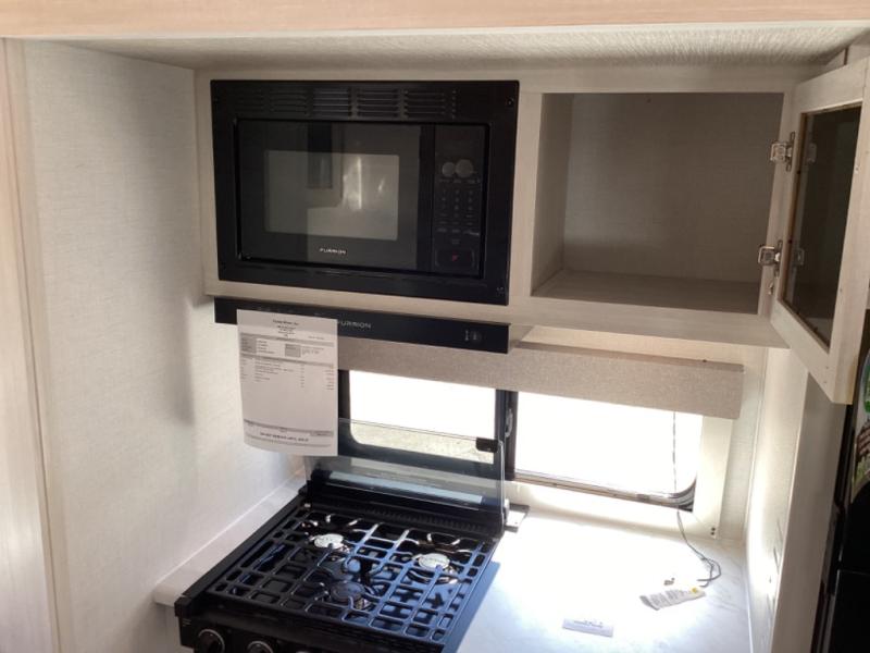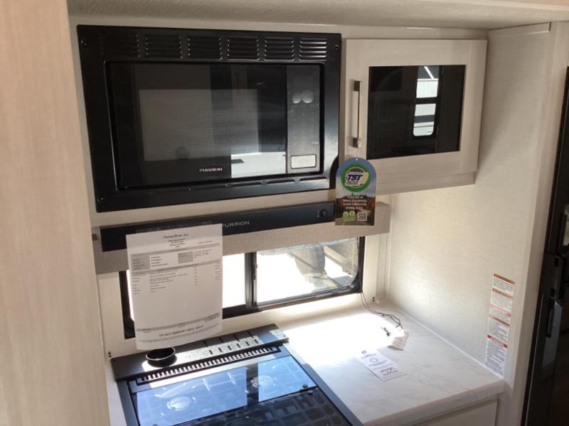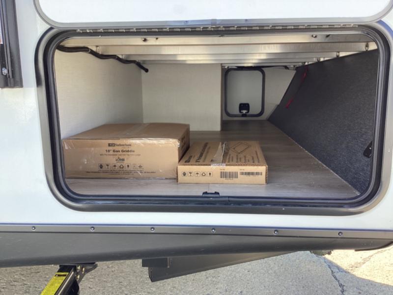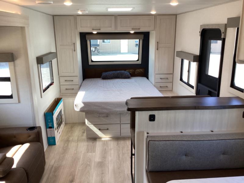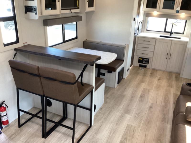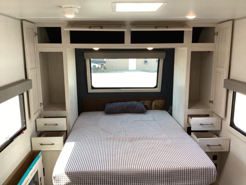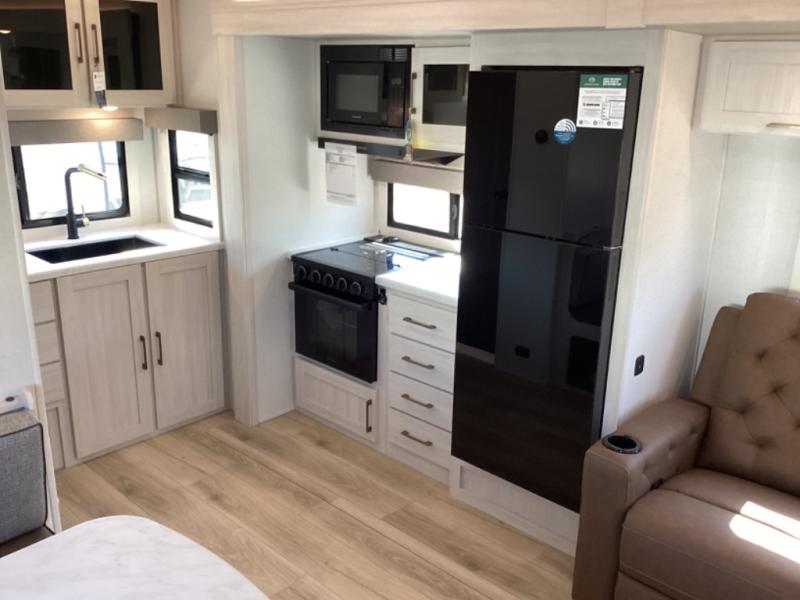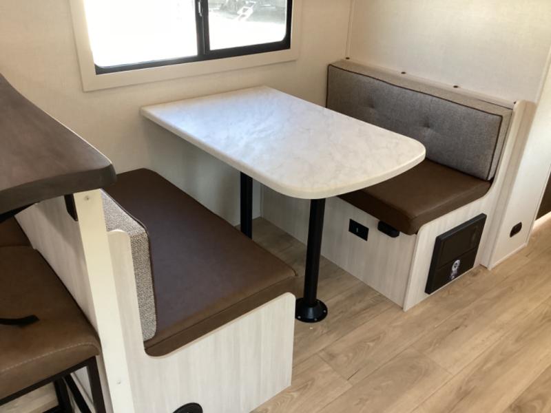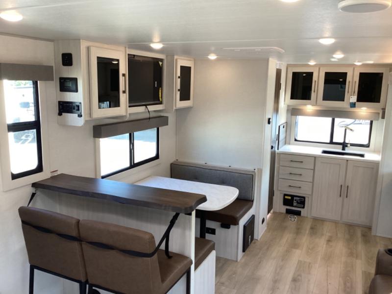 You'll love camping and spending time with loved ones in this spacious travel trailer. The 18' power awning with LED lights can be set up once you arrive at the campground, and you can unload camp gear from the pass-through storage. Head inside to make lunch on the residential range top or in the microwave oven. There is a booth dinette and tri-fold sofa for seating space, plus an additional counter with bar stools beside the dinette. A full bath onboard lets you clean up each day, and the front queen bed is sure to bring a great night's rest. There are also dual wardrobes to keep your space tidy and overhead storage for even more belongings.