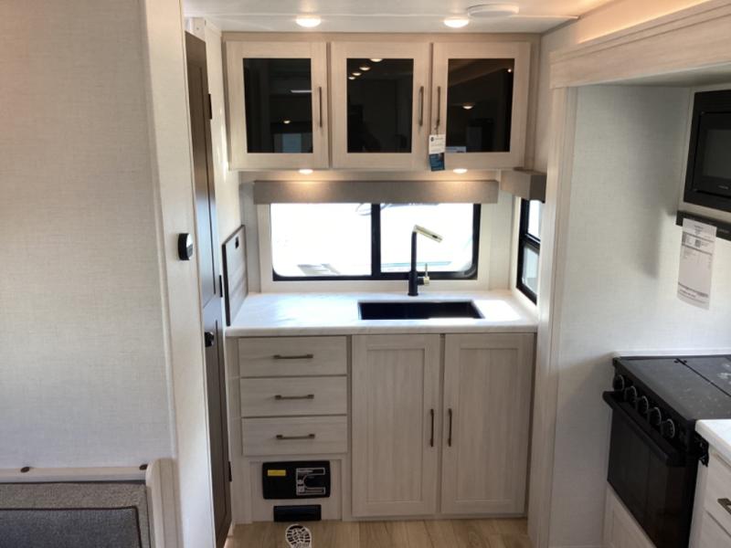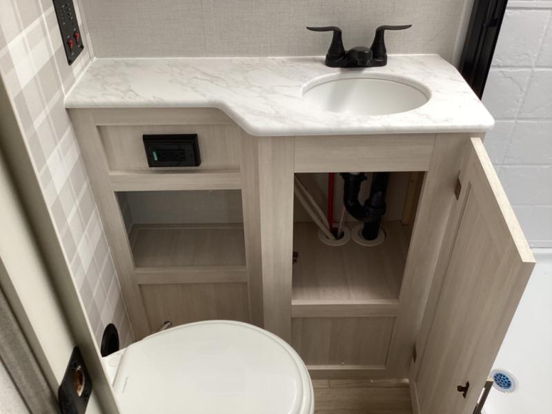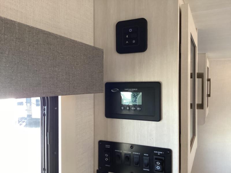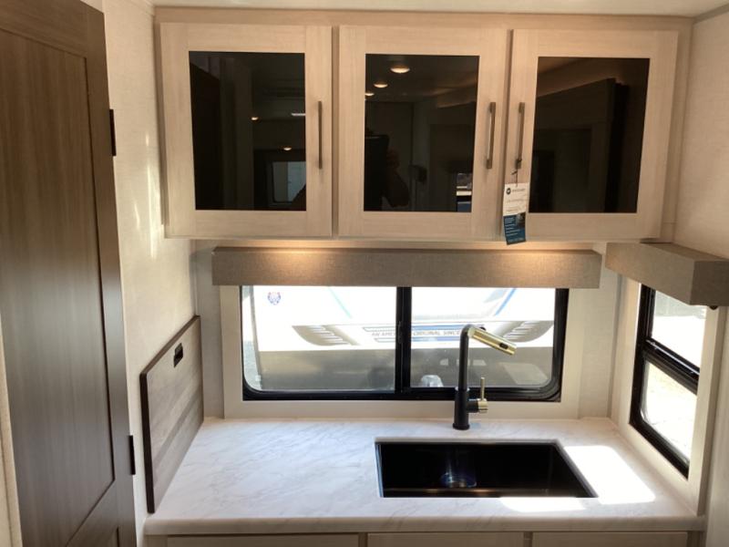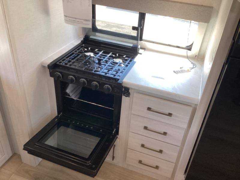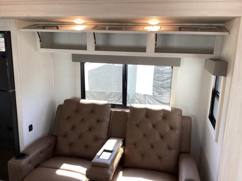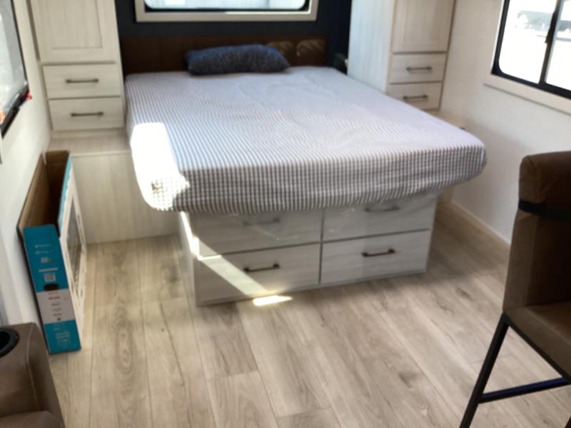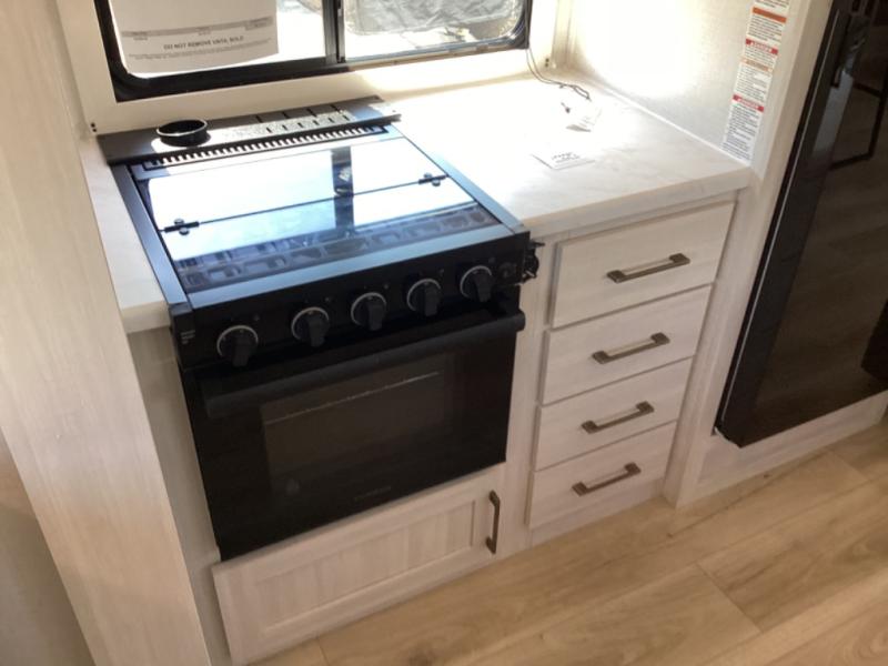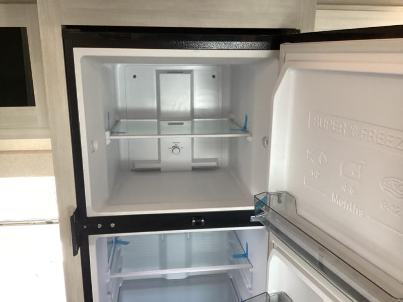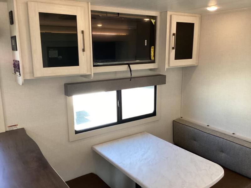 You'll love camping and spending time with loved ones in this spacious travel trailer. The 18' power awning with LED lights can be set up once you arrive at the campground, and you can unload camp gear from the pass-through storage. Head inside to make lunch on the residential range top or in the microwave oven. There is a booth dinette and tri-fold sofa for seating space, plus an additional counter with bar stools beside the dinette. A full bath onboard lets you clean up each day, and the front queen bed is sure to bring a great night's rest. There are also dual wardrobes to keep your space tidy and overhead storage for even more belongings.