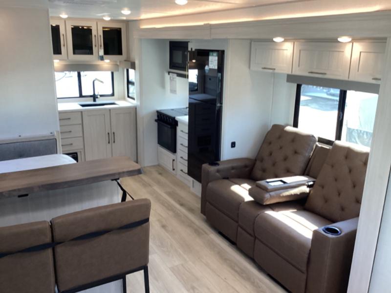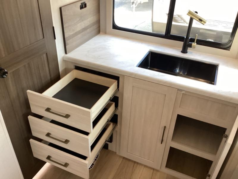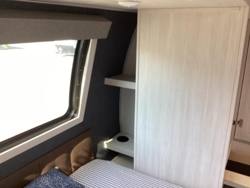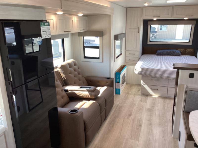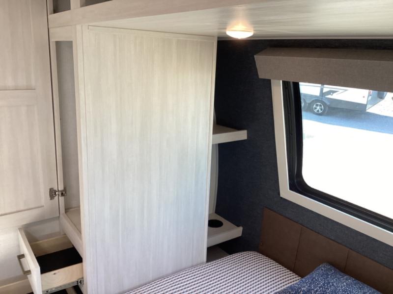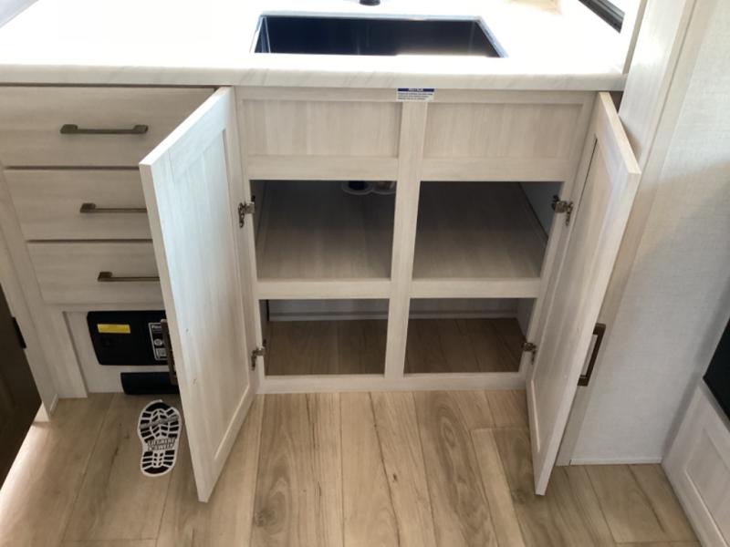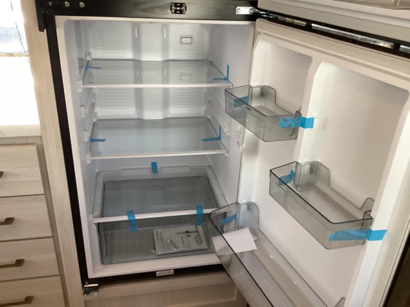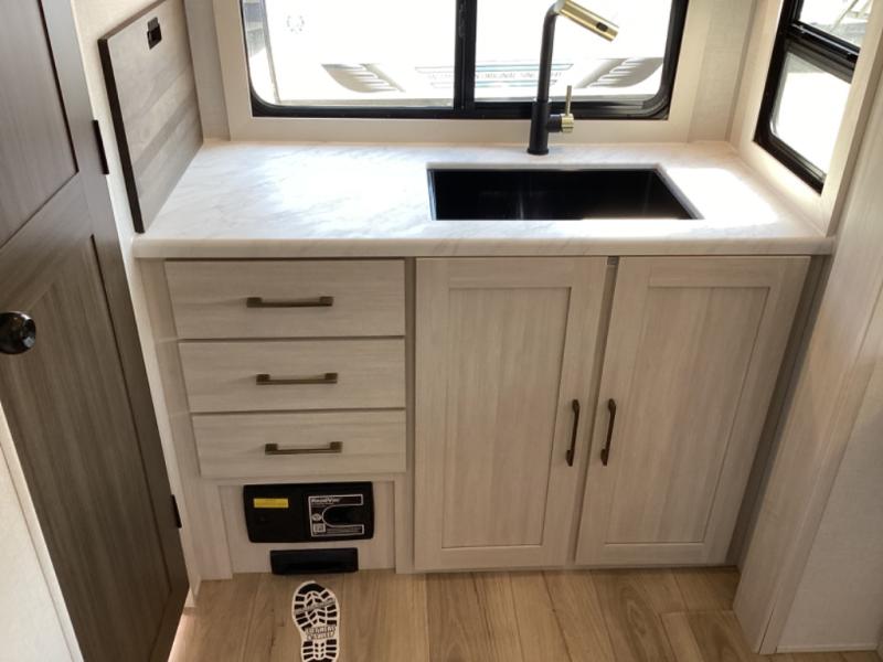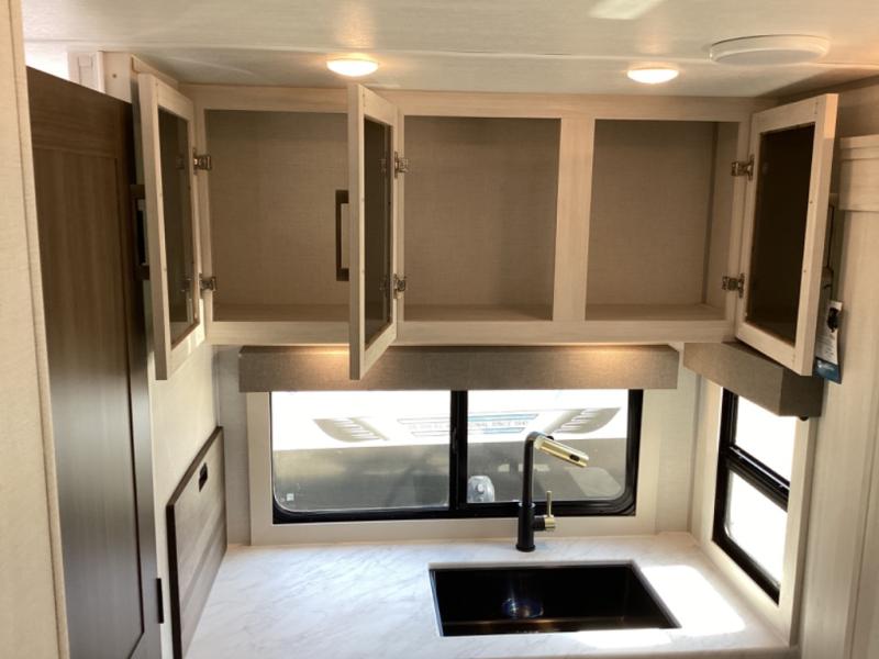 You'll love camping and spending time with loved ones in this spacious travel trailer. The 18' power awning with LED lights can be set up once you arrive at the campground, and you can unload camp gear from the pass-through storage. Head inside to make lunch on the residential range top or in the microwave oven. There is a booth dinette and tri-fold sofa for seating space, plus an additional counter with bar stools beside the dinette. A full bath onboard lets you clean up each day, and the front queen bed is sure to bring a great night's rest. There are also dual wardrobes to keep your space tidy and overhead storage for even more belongings.