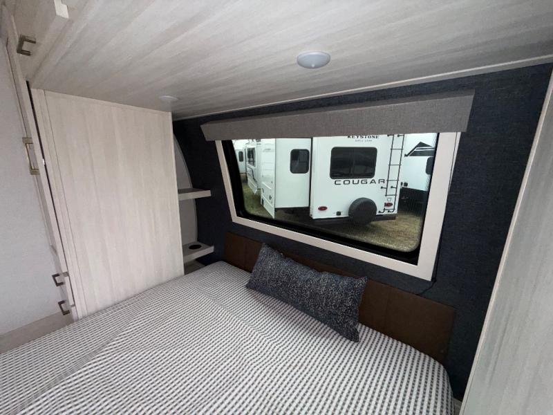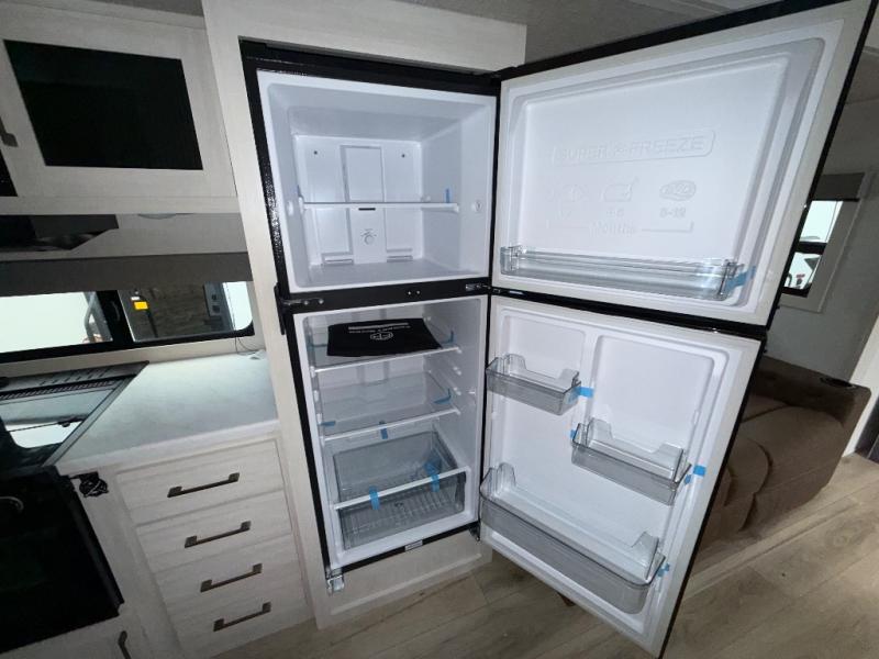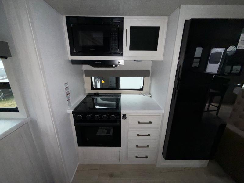 You'll love camping and spending time with loved ones in this spacious travel trailer. The 18' power awning with LED lights can be set up once you arrive at the campground, and you can unload camp gear from the pass-through storage. Head inside to make lunch on the residential range top or in the microwave oven. There is a booth dinette and tri-fold sofa for seating space, plus an additional counter with bar stools beside the dinette. A full bath onboard lets you clean up each day, and the front queen bed is sure to bring a great night's rest. There are also dual wardrobes to keep your space tidy and overhead storage for even more belongings.