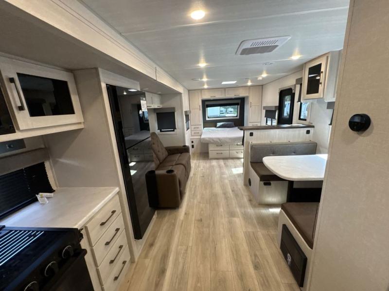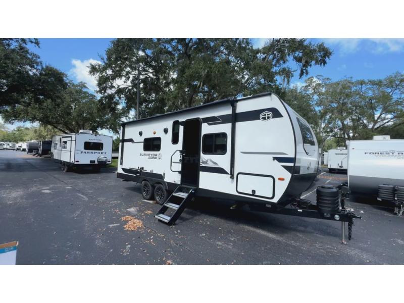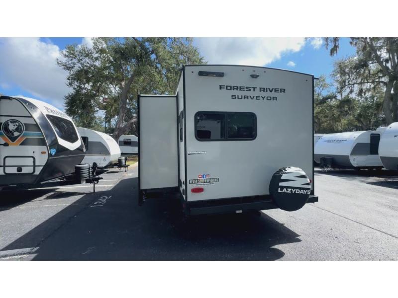With any Surveyor Legend travel trailer by Forest River you will enjoy quality craftsmanship, convenient amenities, and at-home comforts. The Azdel composite walls provide a longer-lasting trailer, and the power tongue jack with a hitch light will get you back on the road in no-time. There are also Goodyear tires and a tire pressure monitoring system for hassle-free towing. Each model includes the Surveyor Legend Package that comes standard with oversized dinette storage access doors, front slam latch baggage doors, plus an automotive style tinted front windshield. You'll appreciate camping with a tankless water heater for endless hot showers, a 2" accessory hitch to bring bikes along, plus carpet-free interiors and a central vacuum system for easy clean up.