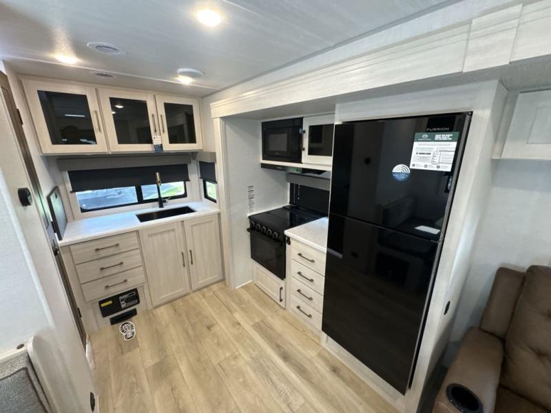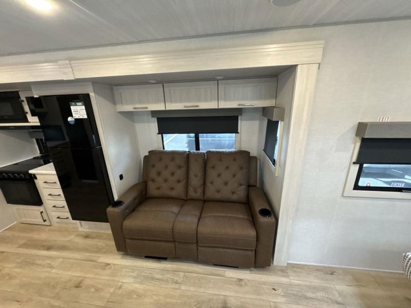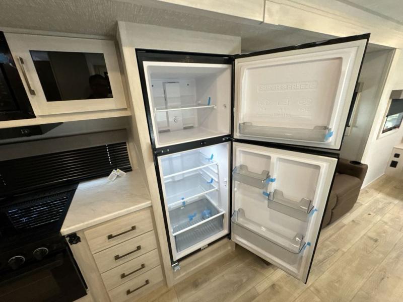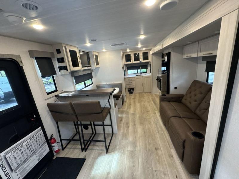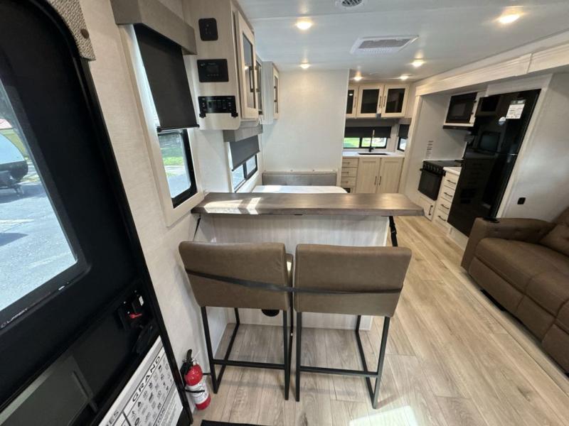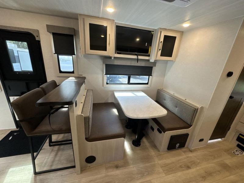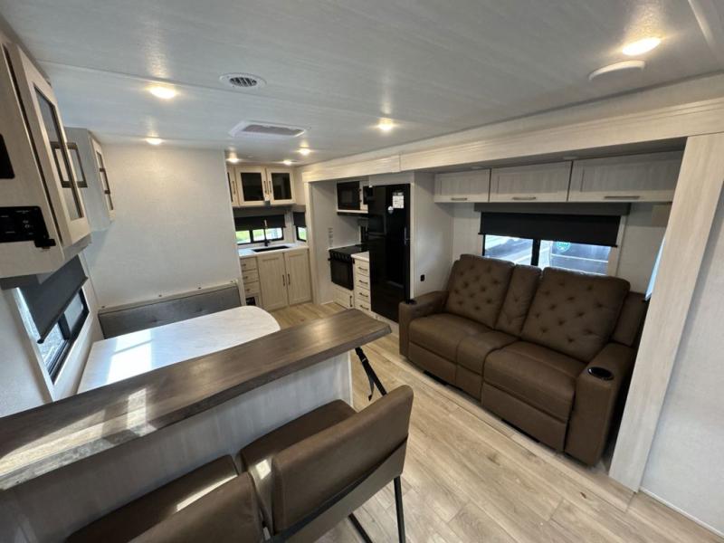 You'll love camping and spending time with loved ones in this spacious travel trailer. The 18' power awning with LED lights can be set up once you arrive at the campground, and you can unload camp gear from the pass-through storage. Head inside to make lunch on the residential range top or in the microwave oven. There is a booth dinette and tri-fold sofa for seating space, plus an additional counter with bar stools beside the dinette. A full bath onboard lets you clean up each day, and the front queen bed is sure to bring a great night's rest. There are also dual wardrobes to keep your space tidy and overhead storage for even more belongings.