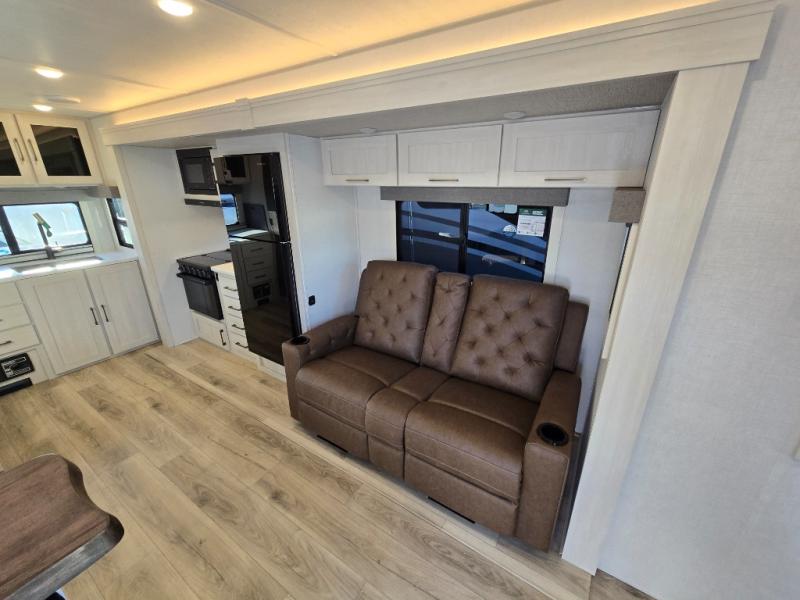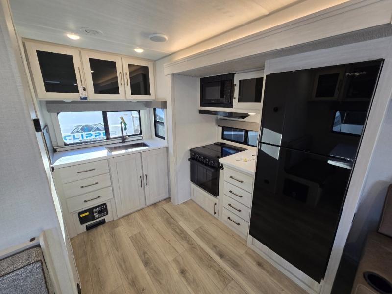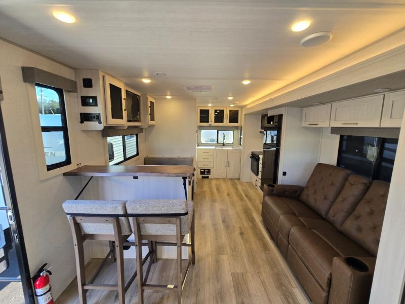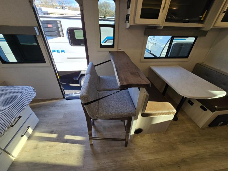 You'll love camping and spending time with loved ones in this spacious travel trailer. The 18' power awning with LED lights can be set up once you arrive at the campground, and you can unload camp gear from the pass-through storage. Head inside to make lunch on the residential range top or in the microwave oven. There is a booth dinette and tri-fold sofa for seating space, plus an additional counter with bar stools beside the dinette. A full bath onboard lets you clean up each day, and the front queen bed is sure to bring a great night's rest. There are also dual wardrobes to keep your space tidy and overhead storage for even more belongings.