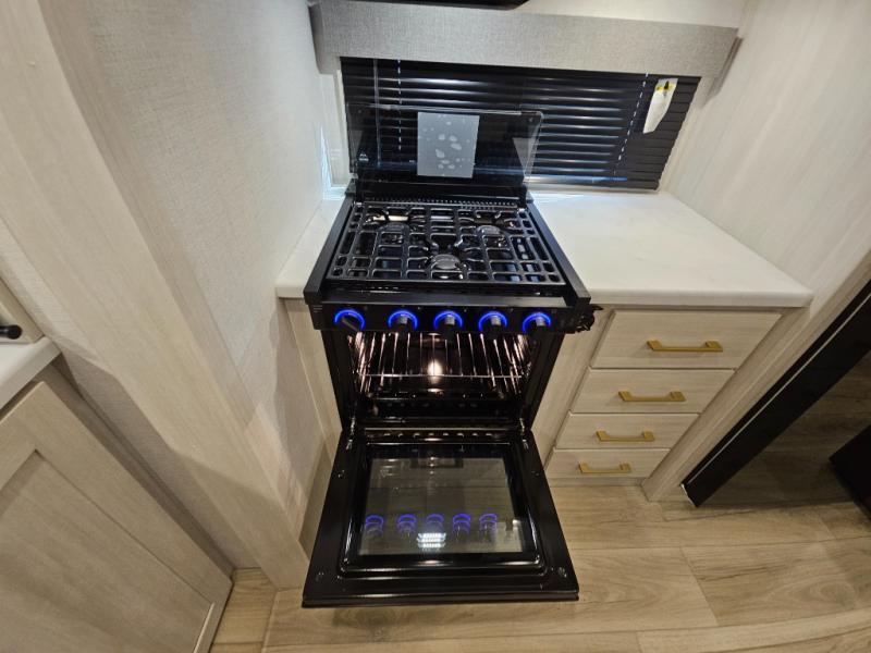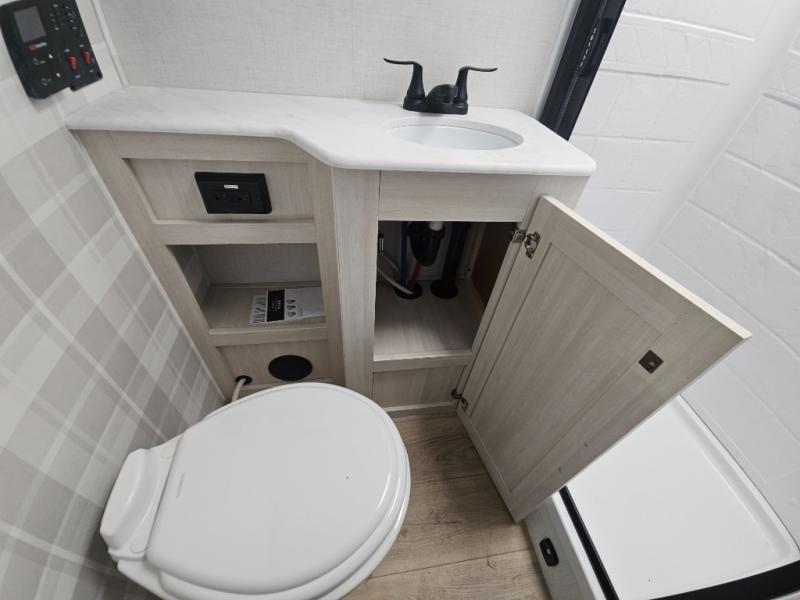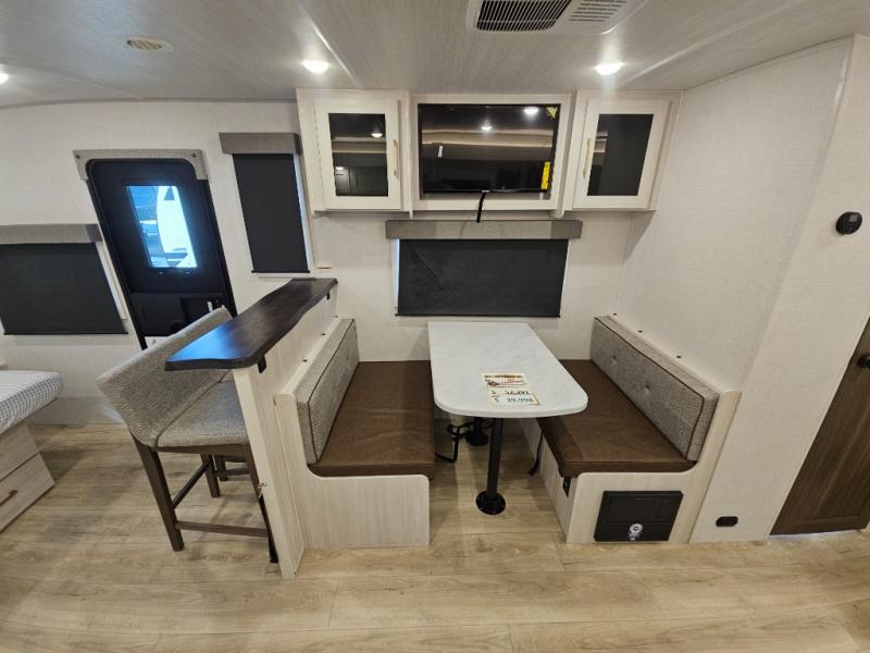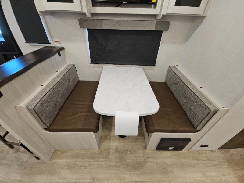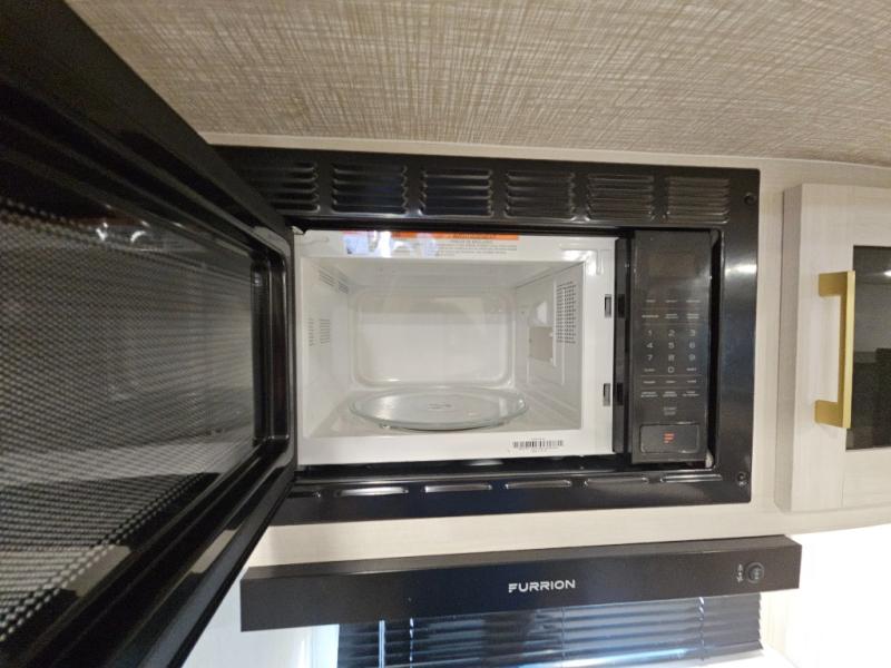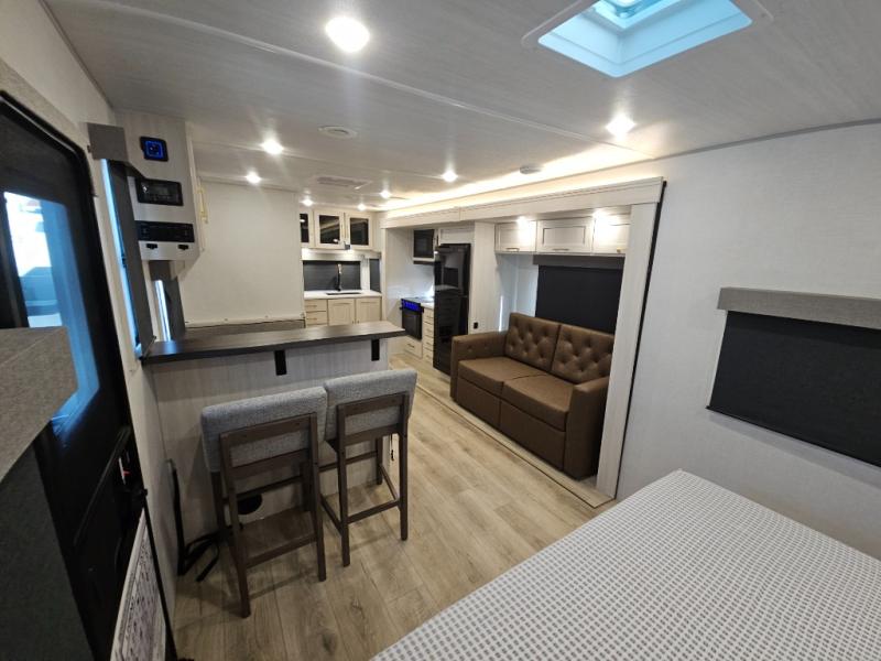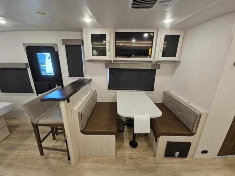 You'll love camping and spending time with loved ones in this spacious travel trailer. The 18' power awning with LED lights can be set up once you arrive at the campground, and you can unload camp gear from the pass-through storage. Head inside to make lunch on the residential range top or in the microwave oven. There is a booth dinette and tri-fold sofa for seating space, plus an additional counter with bar stools beside the dinette. A full bath onboard lets you clean up each day, and the front queen bed is sure to bring a great night's rest. There are also dual wardrobes to keep your space tidy and overhead storage for even more belongings.