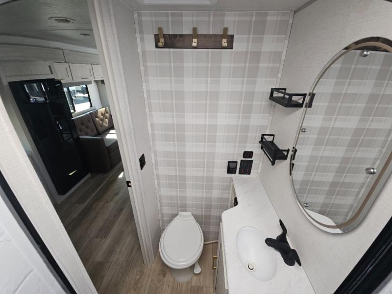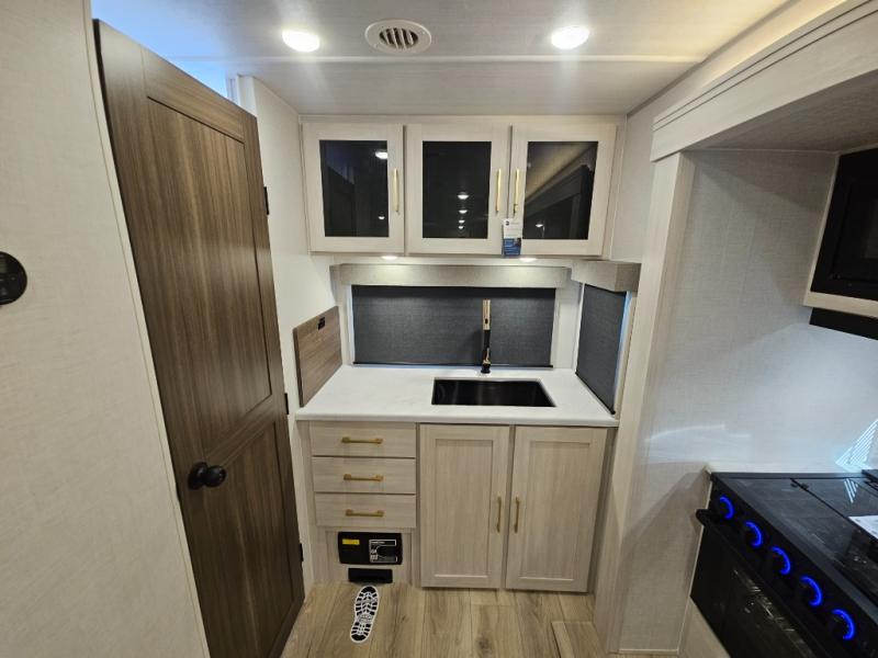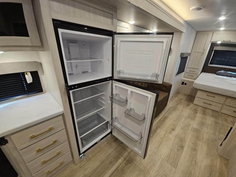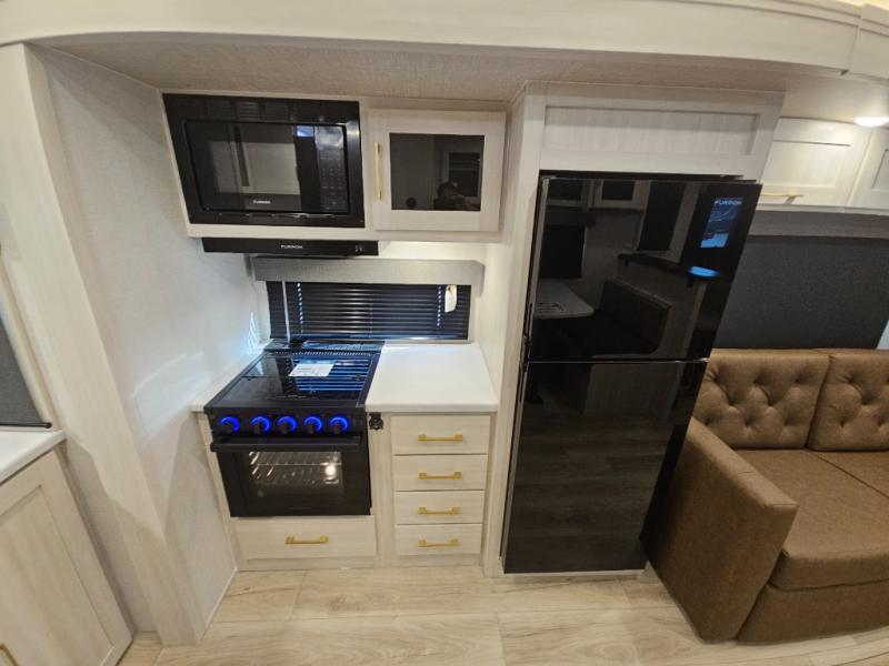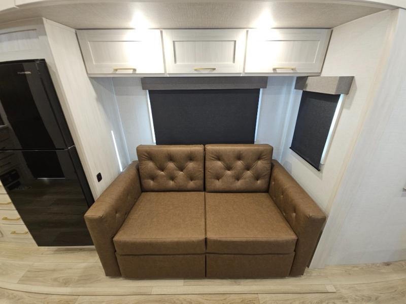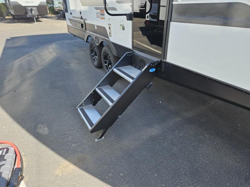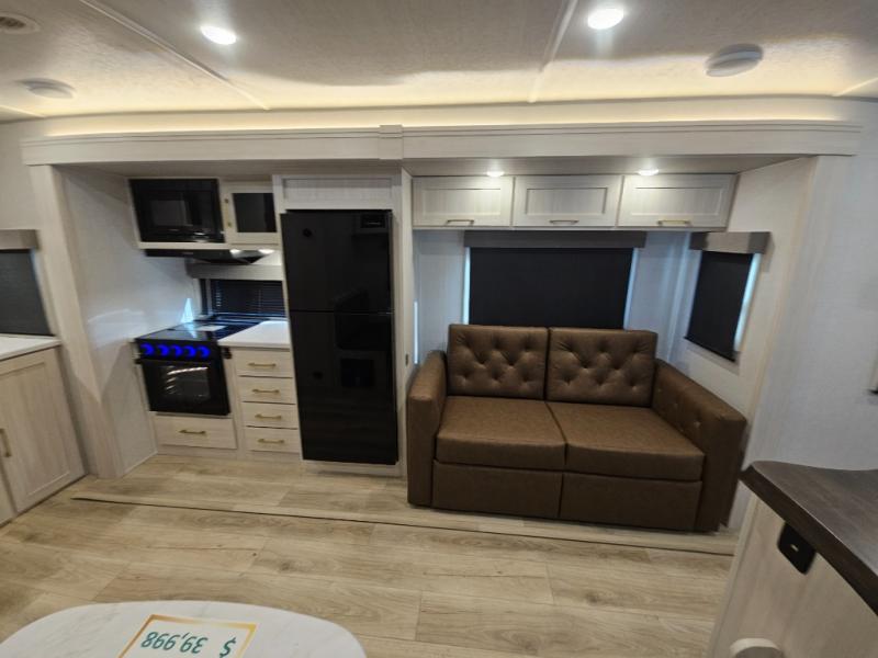 You'll love camping and spending time with loved ones in this spacious travel trailer. The 18' power awning with LED lights can be set up once you arrive at the campground, and you can unload camp gear from the pass-through storage. Head inside to make lunch on the residential range top or in the microwave oven. There is a booth dinette and tri-fold sofa for seating space, plus an additional counter with bar stools beside the dinette. A full bath onboard lets you clean up each day, and the front queen bed is sure to bring a great night's rest. There are also dual wardrobes to keep your space tidy and overhead storage for even more belongings.