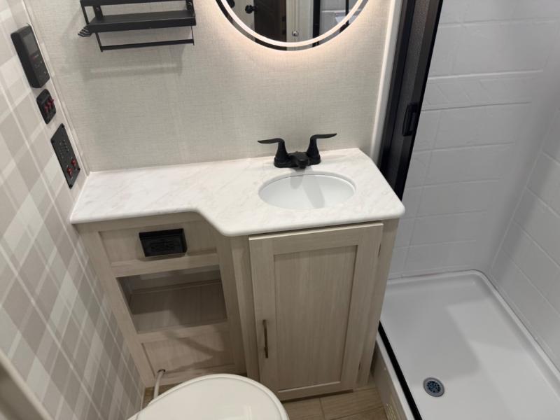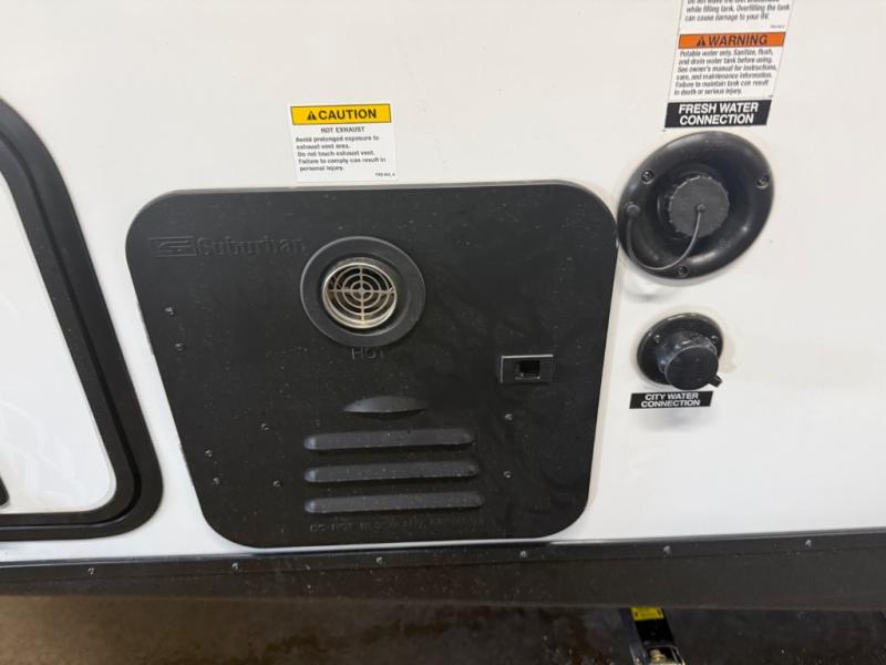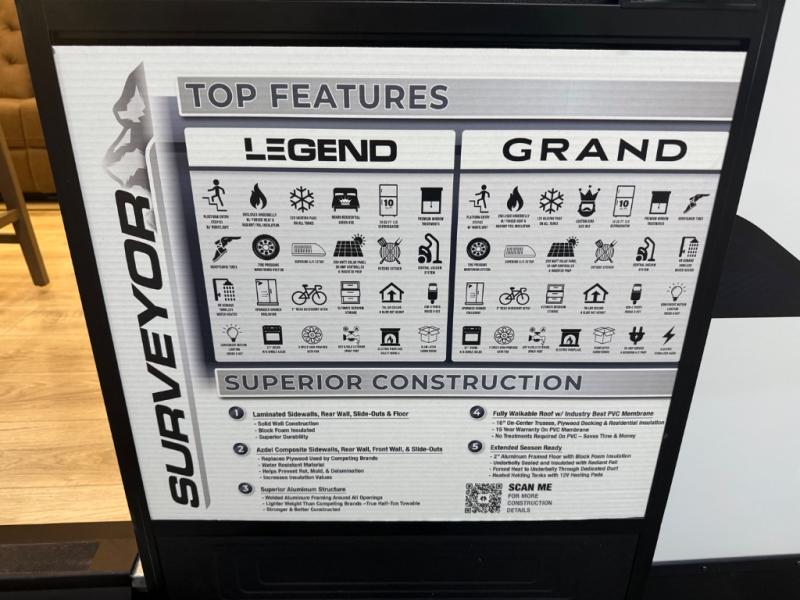With any Surveyor Legend travel trailer by Forest River you will enjoy quality craftsmanship, convenient amenities, and at-home comforts. The Azdel composite walls provide a longer-lasting trailer, and the power tongue jack with hitch light makes getting back on the road quick and easy. There are also Goodyear® tires and a tire pressure monitoring system (TPMS) for more confident, hassle-free towing. Each model is built with thoughtful details like slam-latch exterior baggage doors and an automotive-style tinted front windshield that gives the front cap a sleek look while letting in natural light. You’ll appreciate camping with a tankless water heater for endless hot showers, a 2" rear accessory hitch to bring bikes or extra gear along, plus a central vacuum system that helps keep your easy-to-clean interior looking fresh.