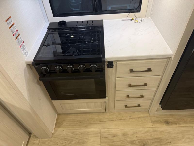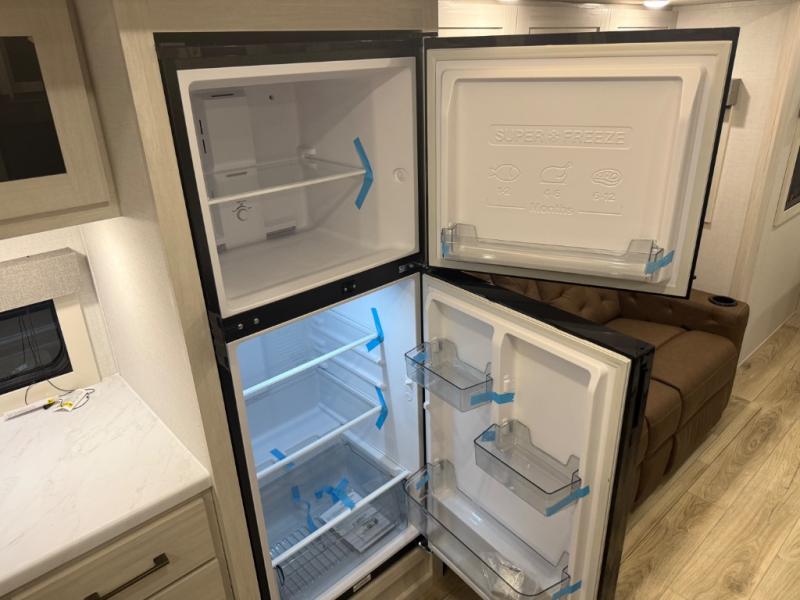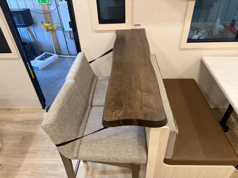 You'll love camping and spending time with loved ones in this spacious travel trailer. The 18' power awning with LED lights can be set up once you arrive at the campground, and you can unload camp gear from the pass-through storage. Head inside to make lunch on the residential range top or in the microwave oven. There is a booth dinette and tri-fold sofa for seating space, plus an additional counter with bar stools beside the dinette. A full bath onboard lets you clean up each day, and the front queen bed is sure to bring a great night's rest. There are also dual wardrobes to keep your space tidy and overhead storage for even more belongings.