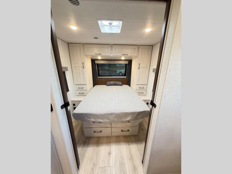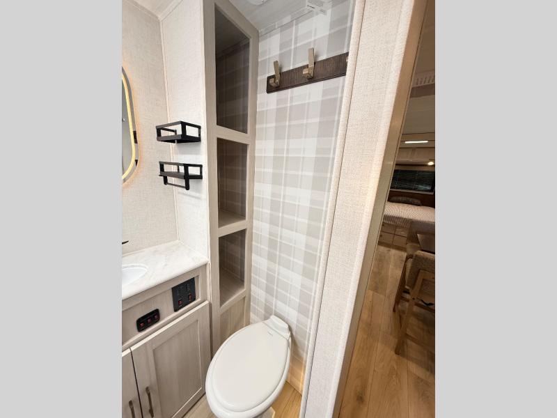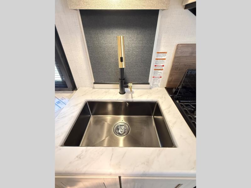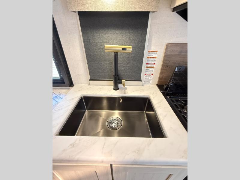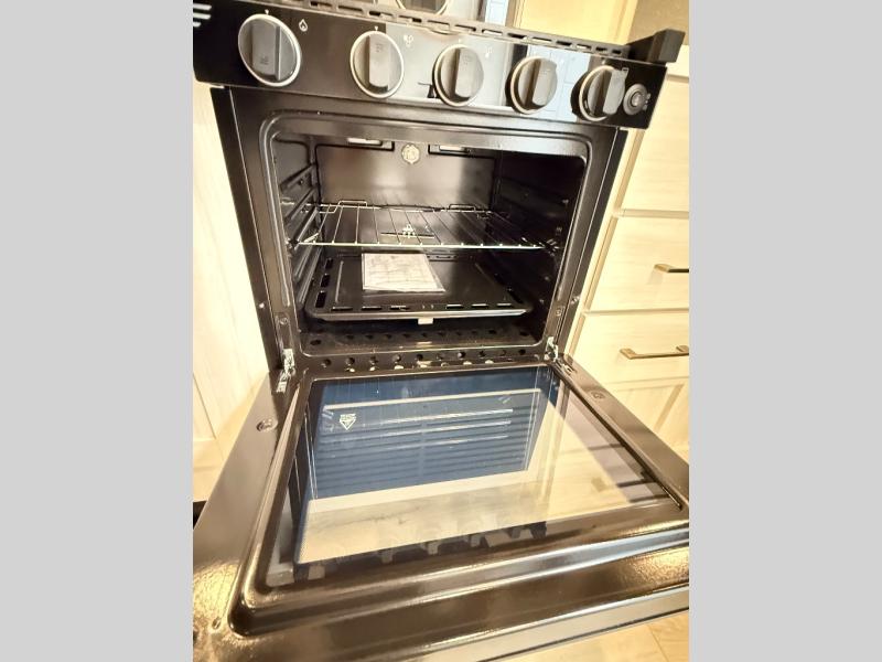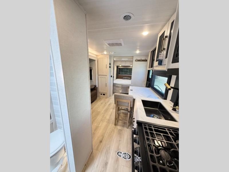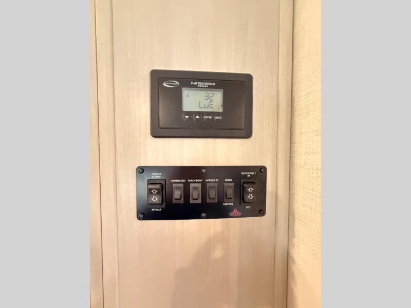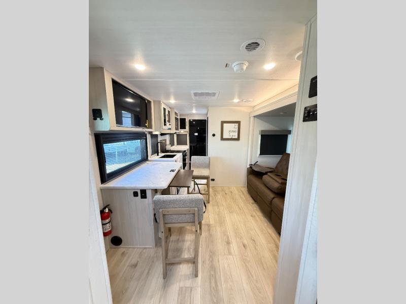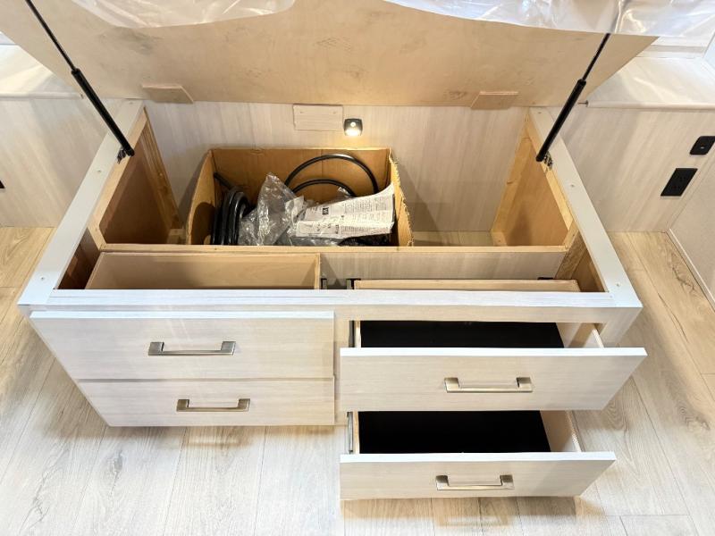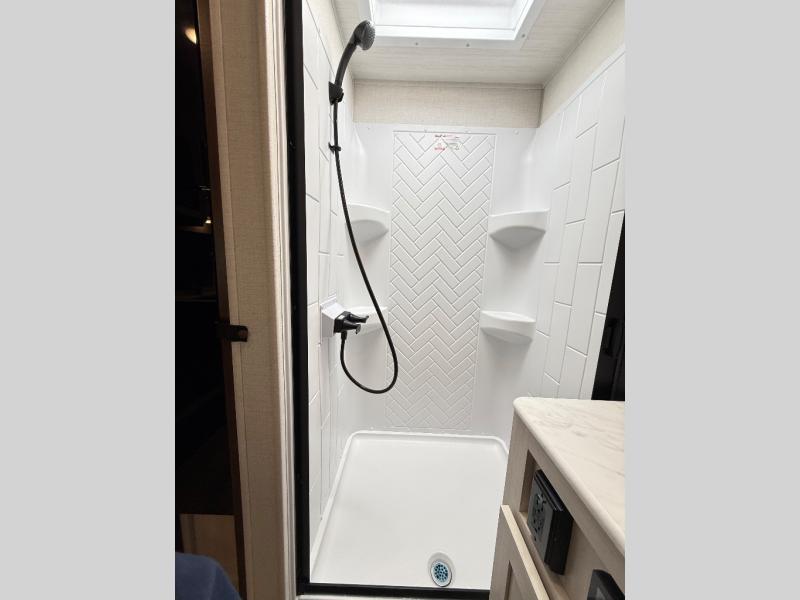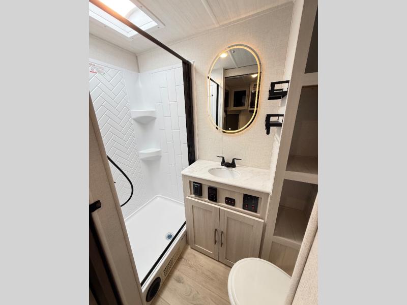 Head to your local state park for fun weekends in this couple's trailer. The chef of your group will have their choice to cook indoors on the three burner cooktop, or outdoors on the gas griddle. There is also an outdoor kitchen with a sink, a refrigerator, and a shelf to store spices. Each day you can clean up in the full bath with an upgraded slow-close shower door and a linen closet for clean towels.