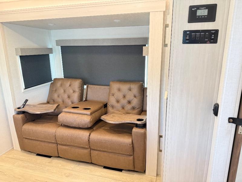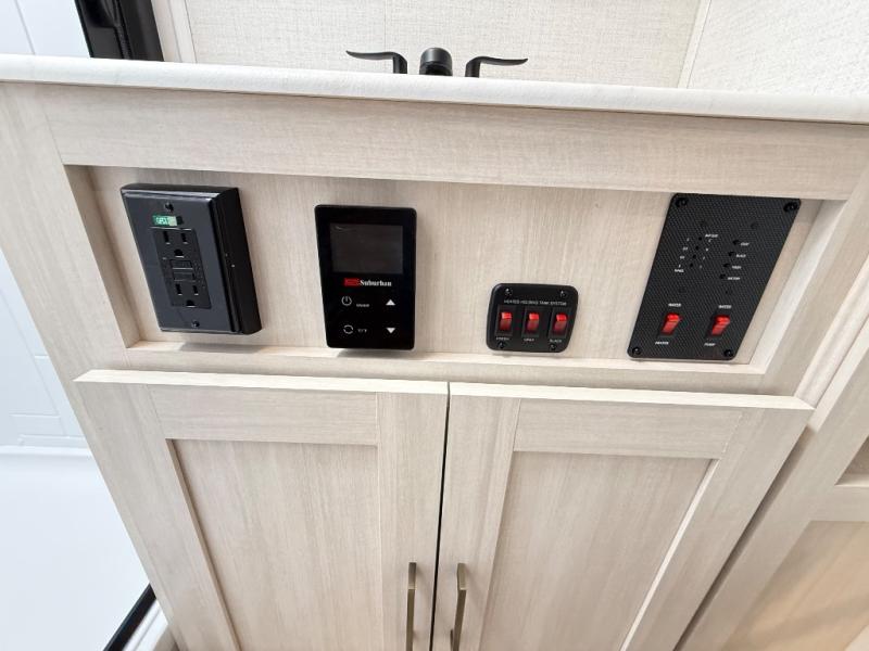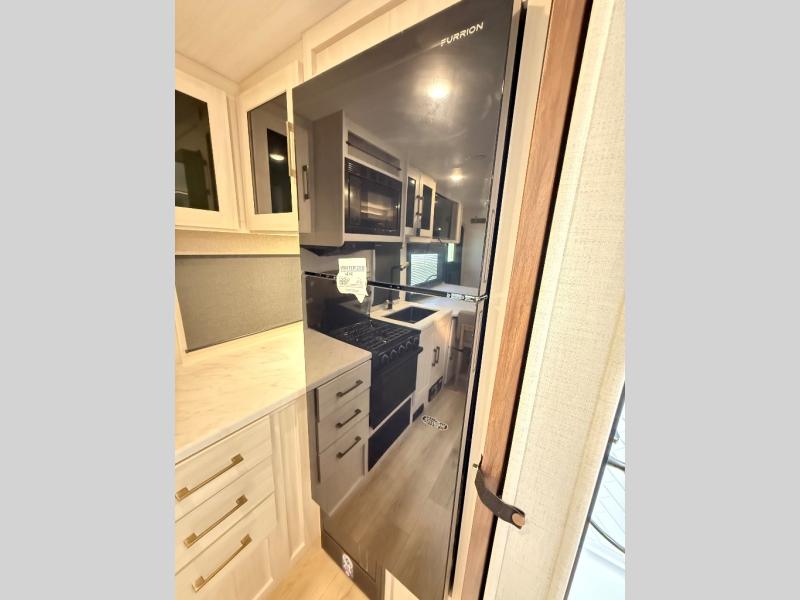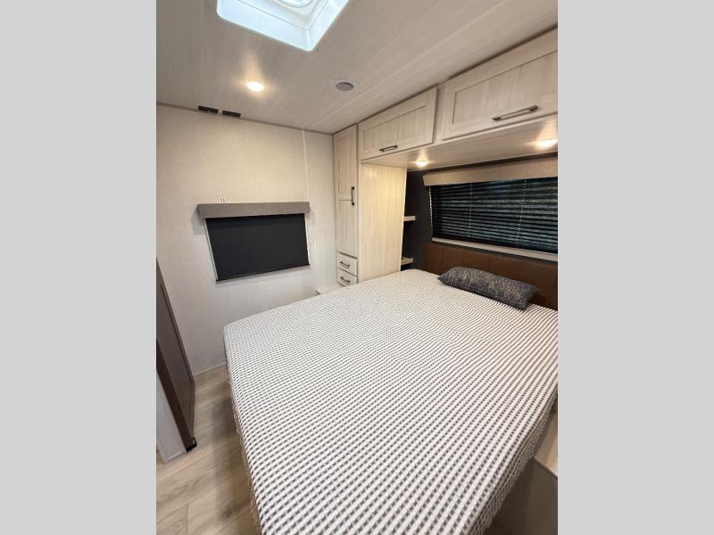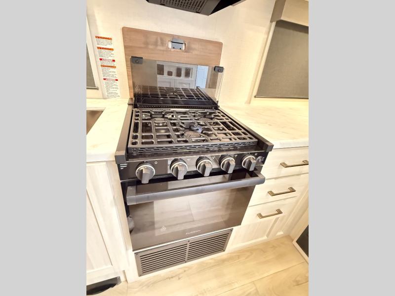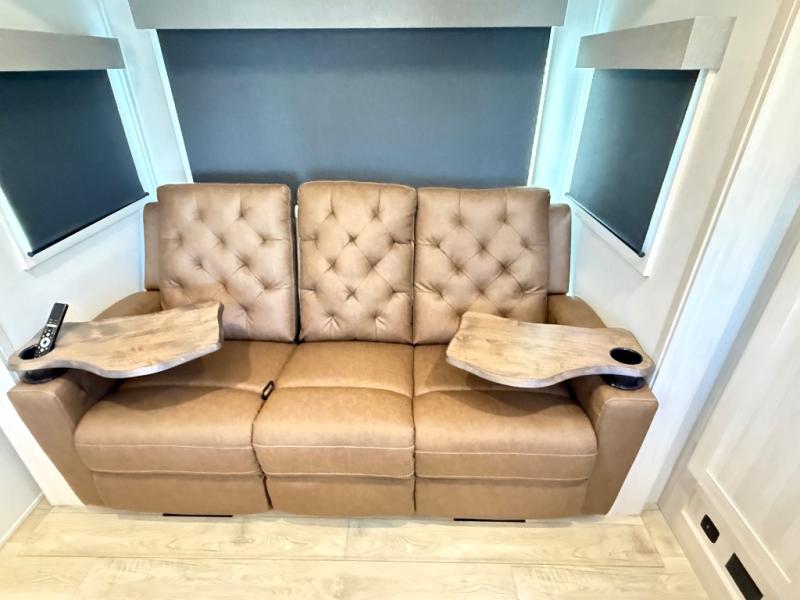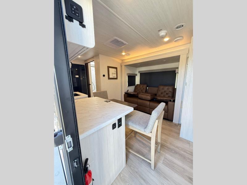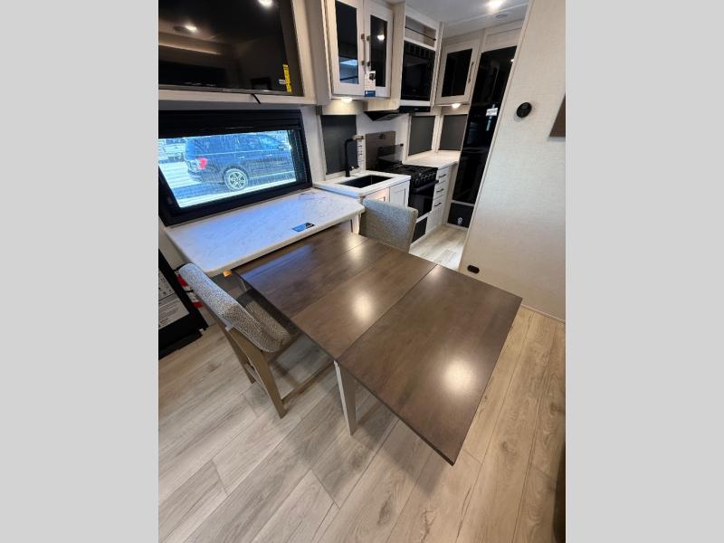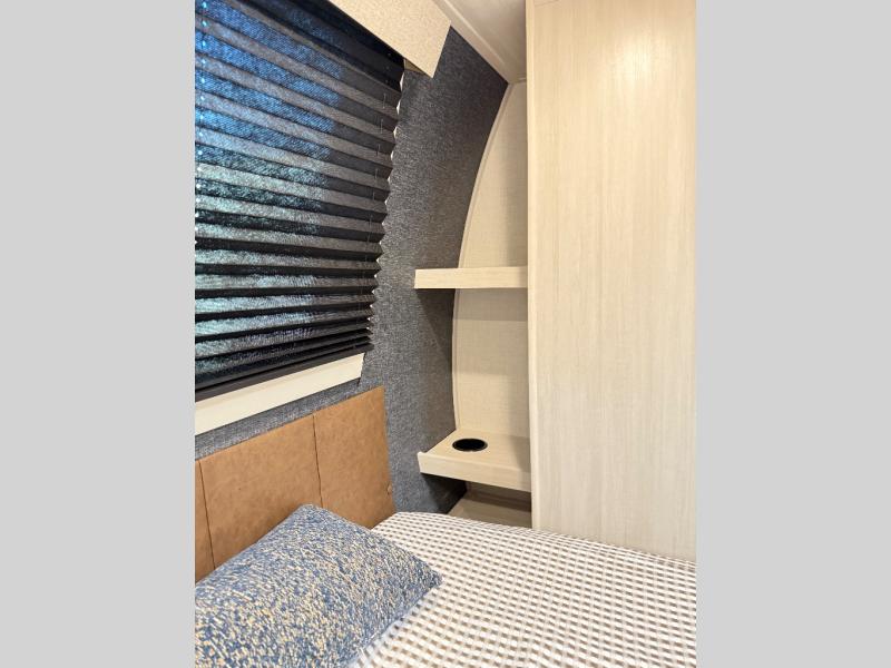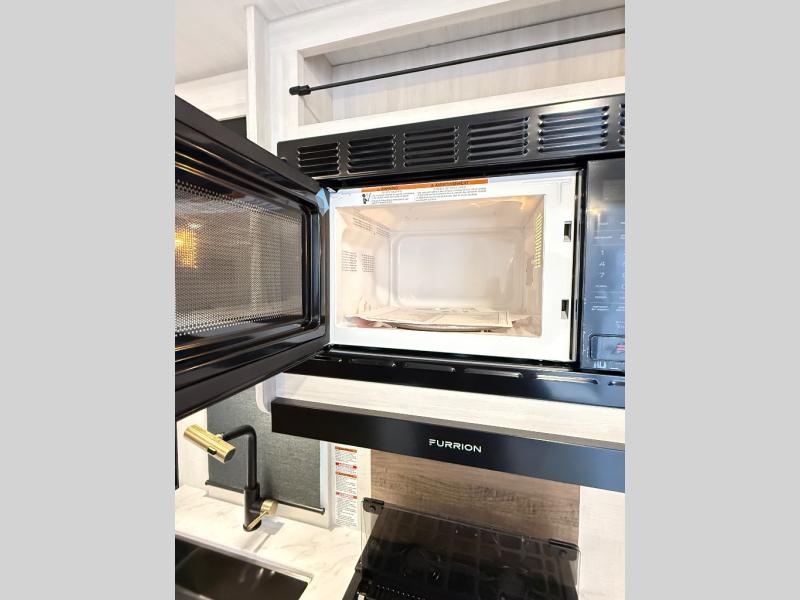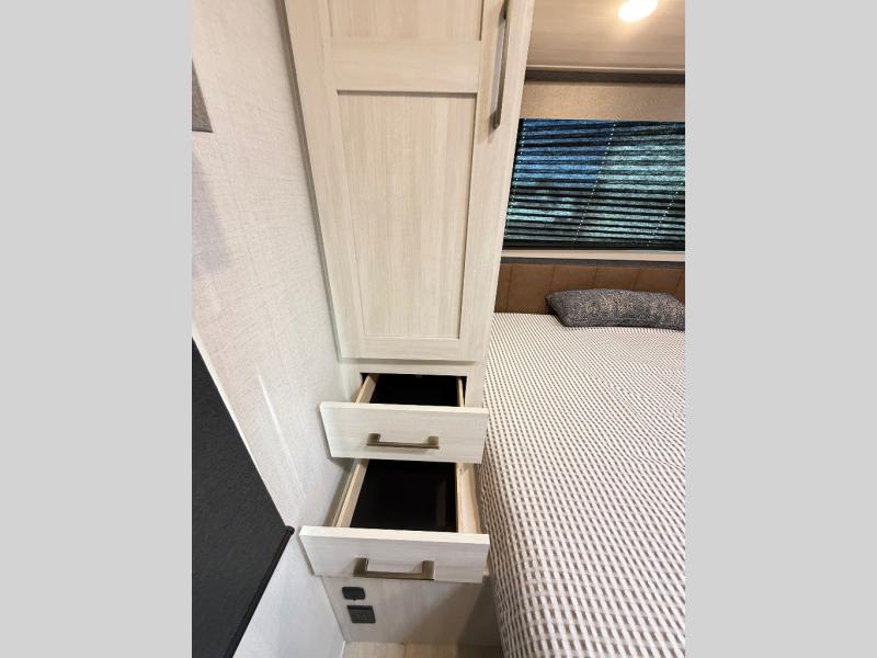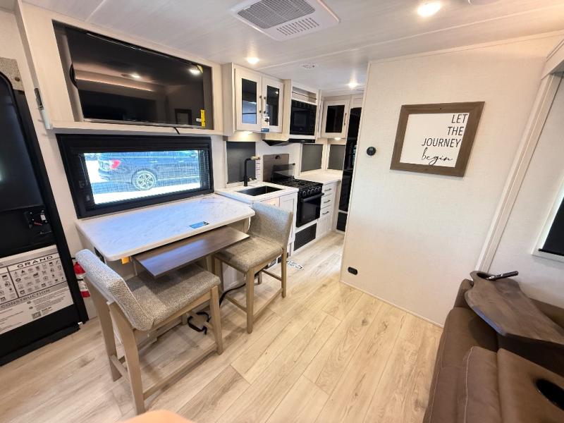 Head to your local state park for fun weekends in this couple's trailer. The chef of your group will have their choice to cook indoors on the three burner cooktop, or outdoors on the gas griddle. There is also an outdoor kitchen with a sink, a refrigerator, and a shelf to store spices. Each day you can clean up in the full bath with an upgraded slow-close shower door and a linen closet for clean towels.