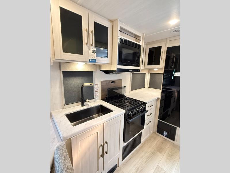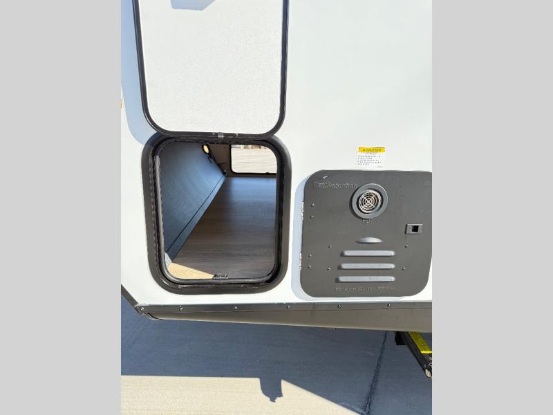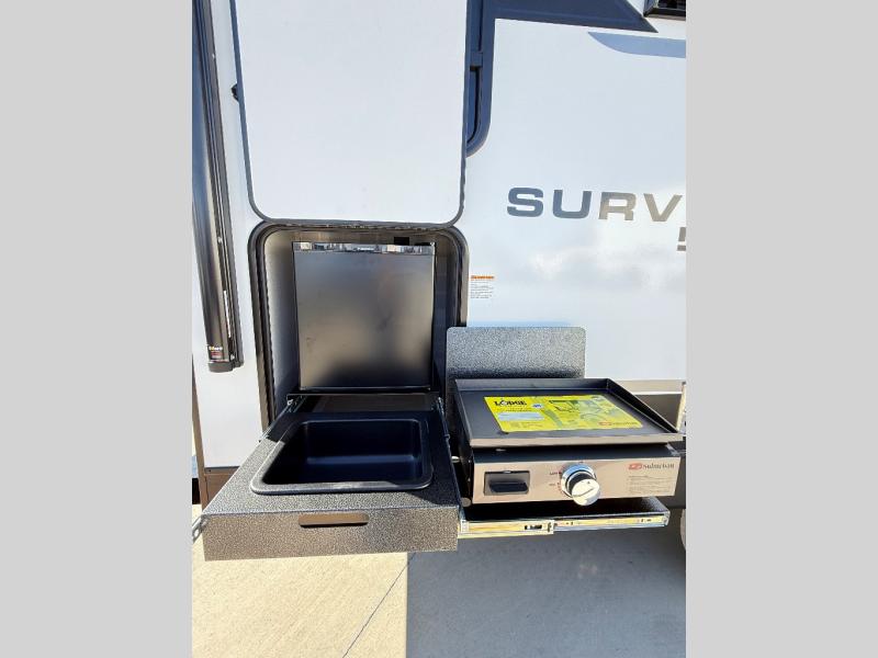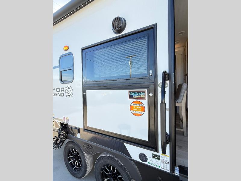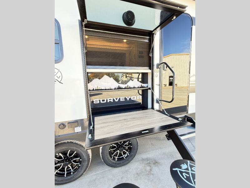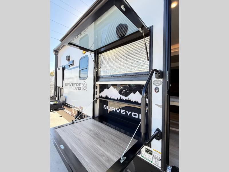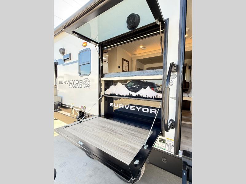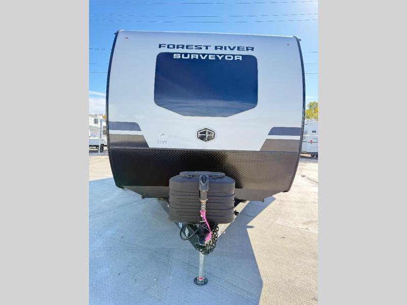 With any Surveyor Legend travel trailer by Forest River you will enjoy quality craftsmanship, convenient amenities, and at-home comforts. The Azdel composite walls provide a longer-lasting trailer, and the power tongue jack with a hitch light will get you back on the road in no-time. There are also Goodyear tires and a tire pressure monitoring system for hassle-free towing. Each model includes the Surveyor Legend Package that comes standard with oversized dinette storage access doors, front slam latch baggage doors, plus an automotive style tinted front windshield. You'll appreciate camping with a tankless water heater for endless hot showers, a 2" accessory hitch to bring bikes along, plus carpet-free interiors and a central vacuum system for easy clean up.