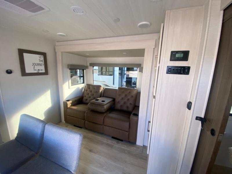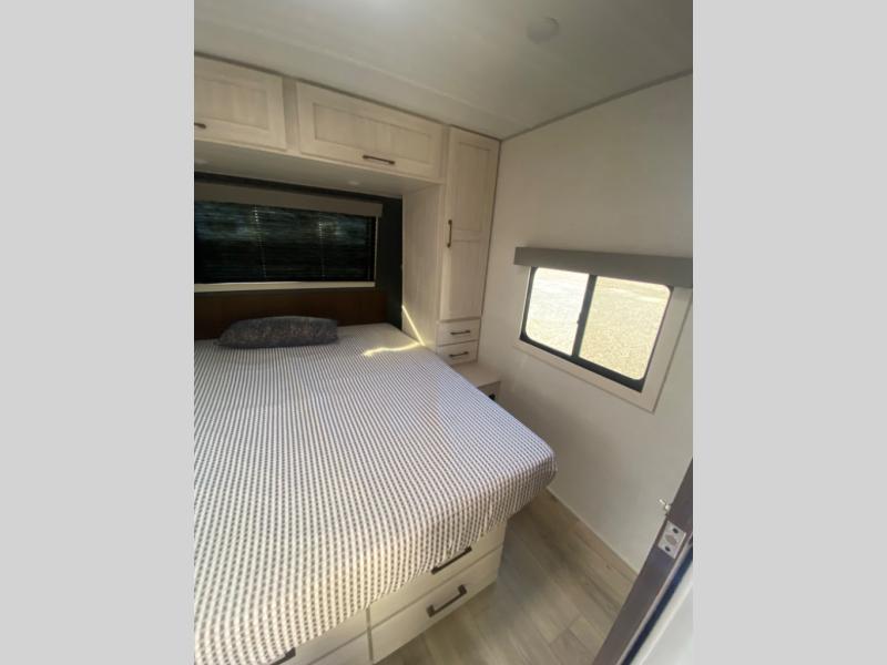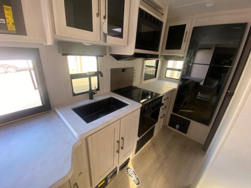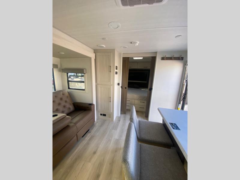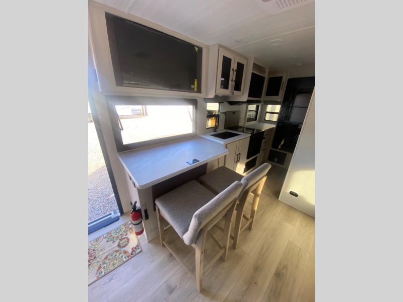 This 27' travel trailer features a rear kitchen with a 10 cu. ft. 12V refrigerator and stovetop. The front private bedroom includes a queen bed with dual wardrobes and overhead storage. The living area offers a tri-fold sofa and a versatile Bar 2 Table feature. Exterior amenities include an 18' power awning with LED lights, TrailGate outdoor bar, and pass-through storage.