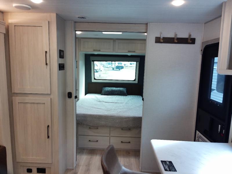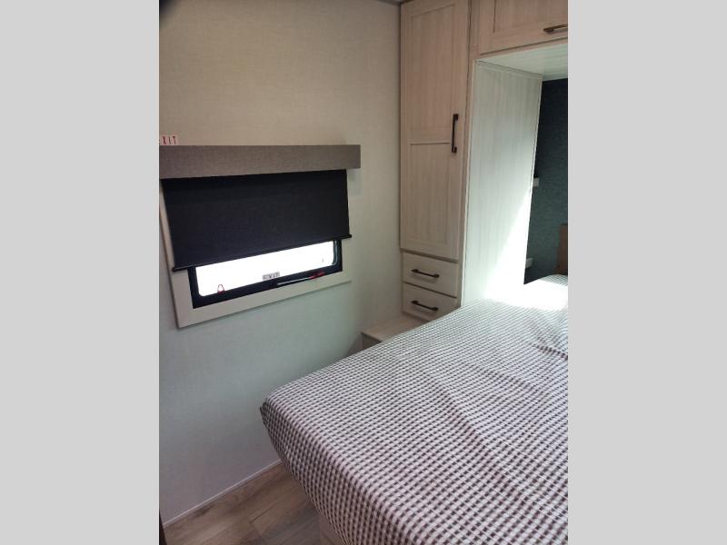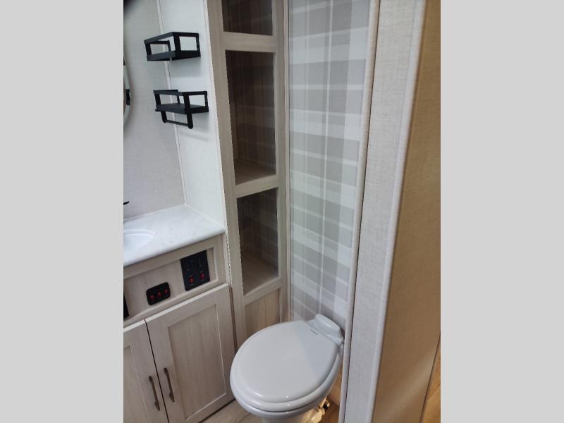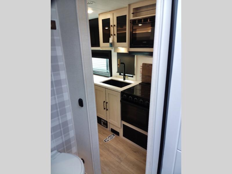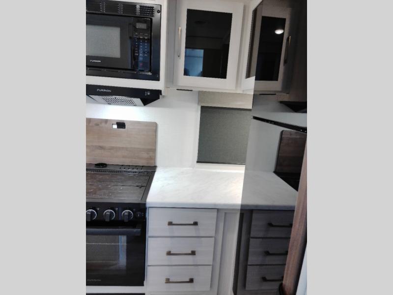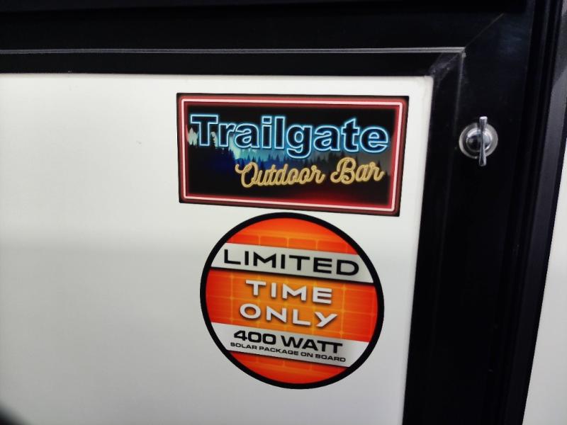 Head to your local state park for fun weekends in this cute couple's trailer. You can sleep at the queen-size bed each night, and you have two wardrobes on either side for storage. The chef of your group will have their choice to cook indoors on the three burner cooktop. There is also an outdoor kitchen with a sink, a refrigerator, and a shelf to store spices. You can also find more ways to enjoy nature, and why not even have some drinks at the exterior bar. Each day you can clean up in the full bath with an upgraded slow-close shower door and a linen closet for clean towels.