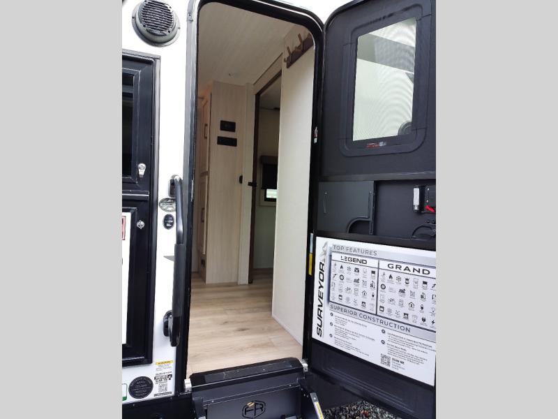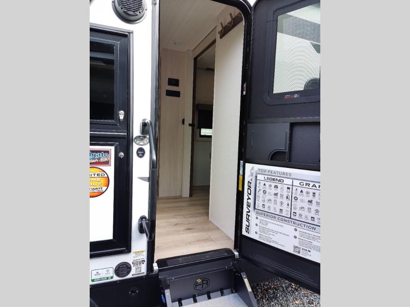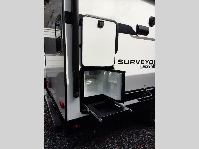 With any Surveyor Legend travel trailer by Forest River you will enjoy quality craftsmanship, convenient amenities, and at-home comforts. The Azdel composite walls provide a longer-lasting trailer, and the power tongue jack with a hitch light will get you back on the road in no-time. There are also Goodyear tires and a tire pressure monitoring system for hassle-free towing. Each model includes the Surveyor Legend Package that comes standard with oversized dinette storage access doors, front slam latch baggage doors, plus an automotive style tinted front windshield. You'll appreciate camping with a tankless water heater for endless hot showers, a 2" accessory hitch to bring bikes along, plus carpet-free interiors and a central vacuum system for easy clean up.