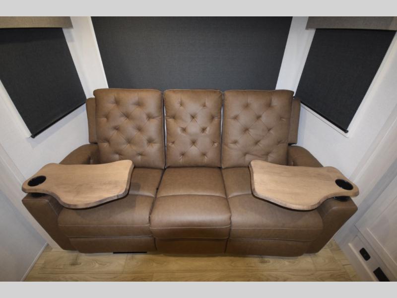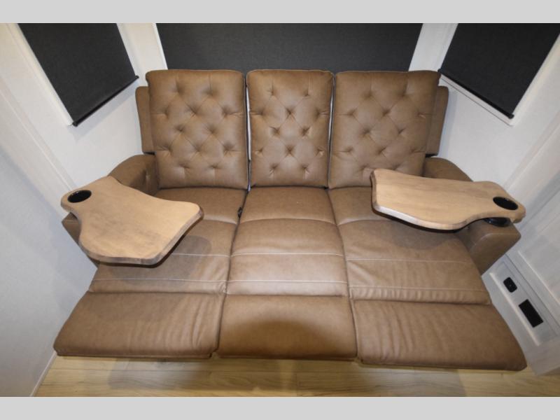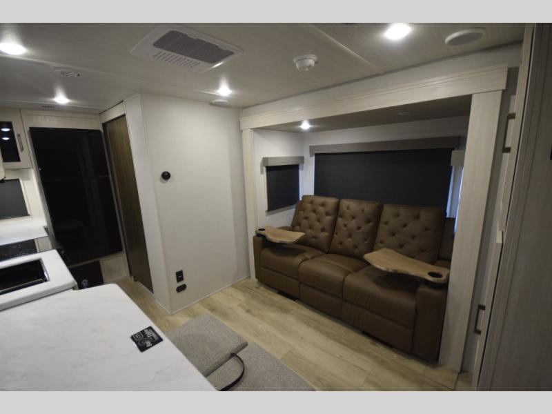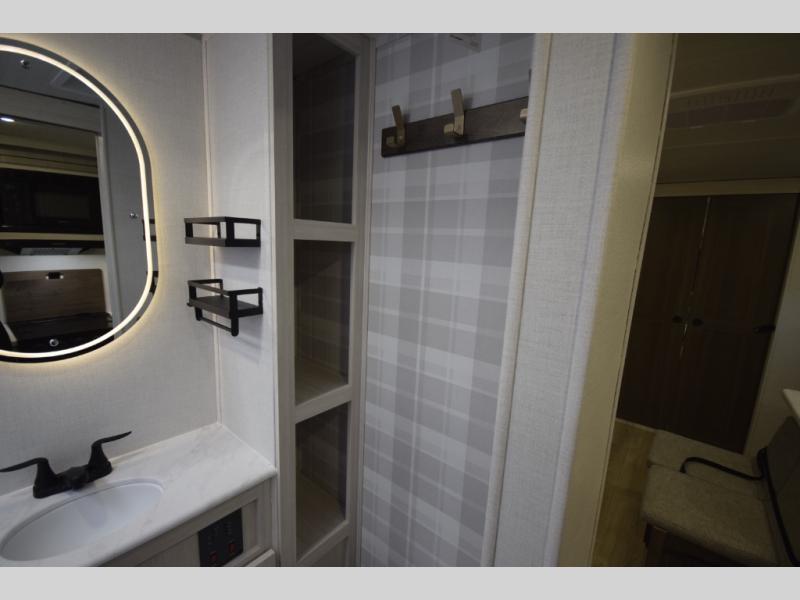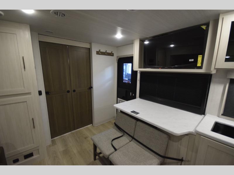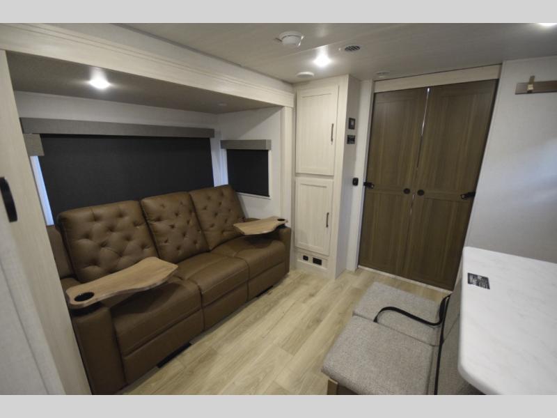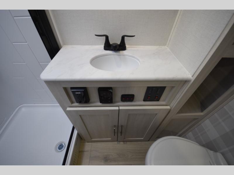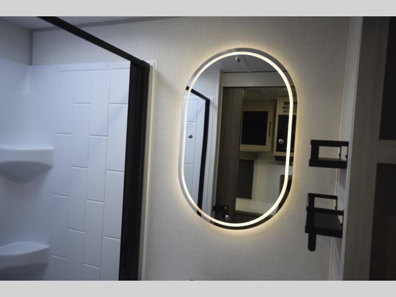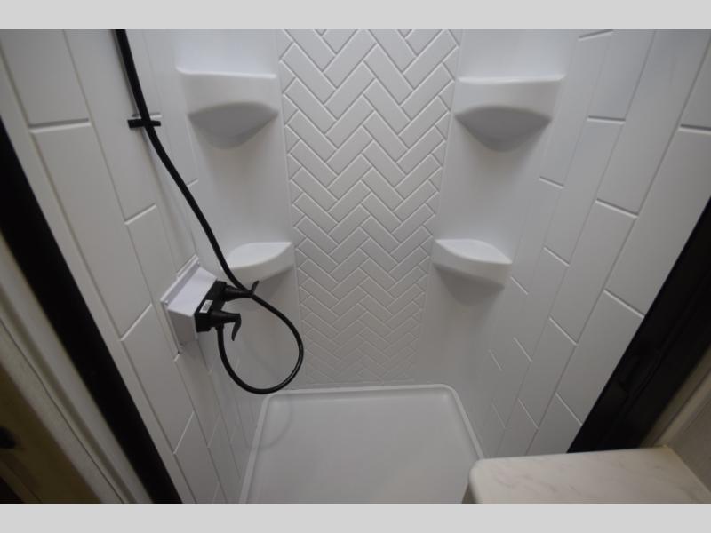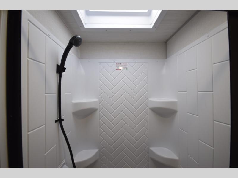 Refresh and recharge in the full bathroom, featuring an upgraded slow-close shower door and a linen closet to keep towels and essentials neatly stored. Every detail is designed to make life on the road feel effortless and enjoyable.