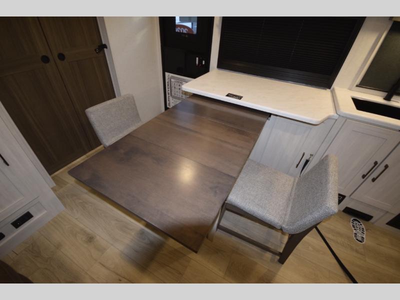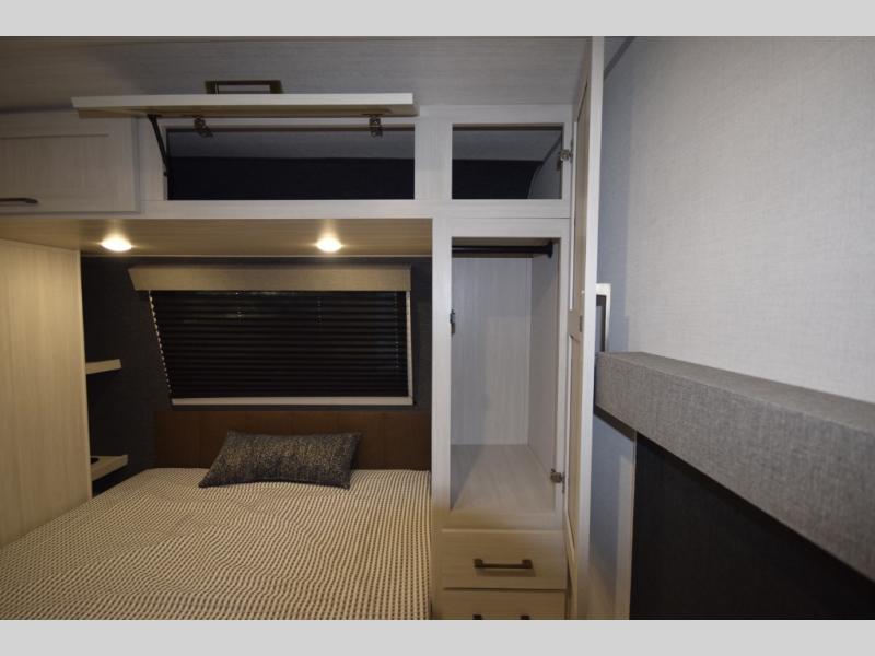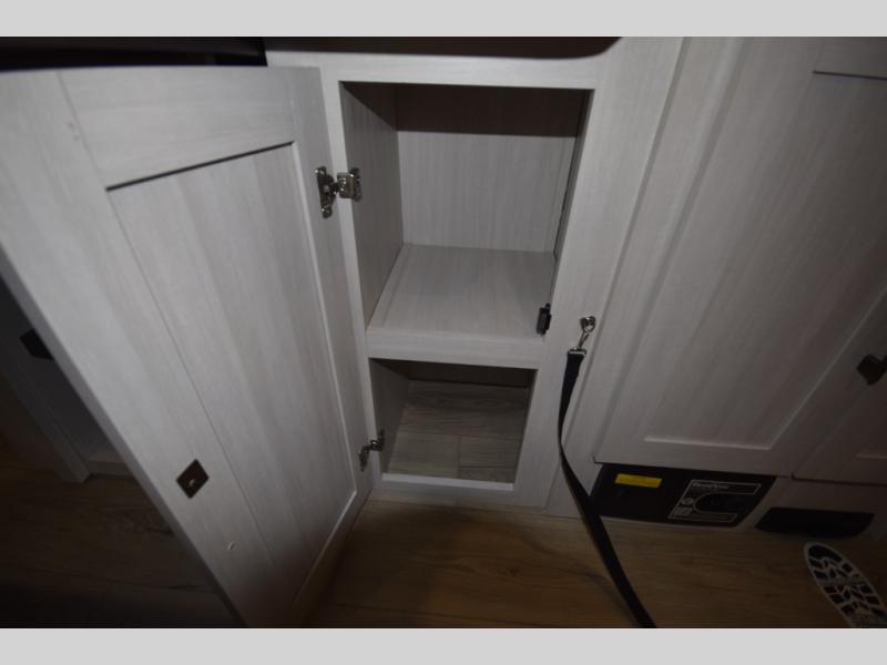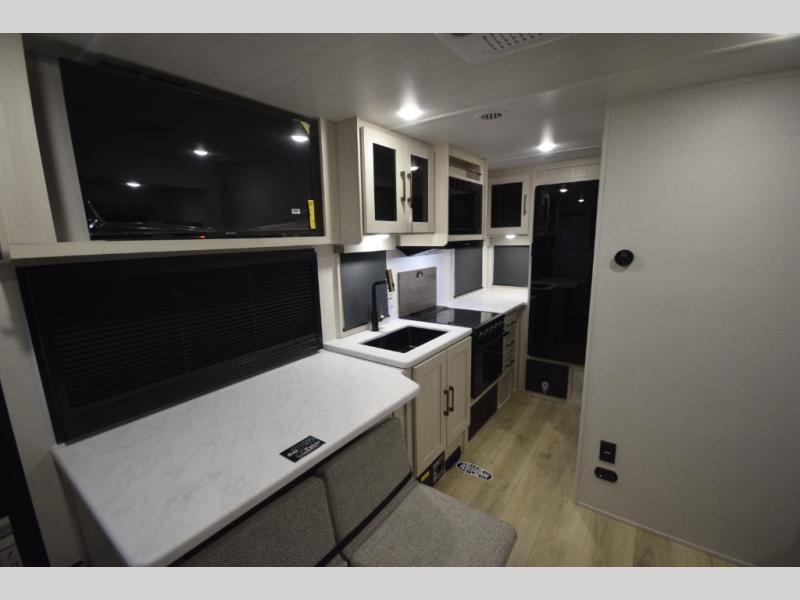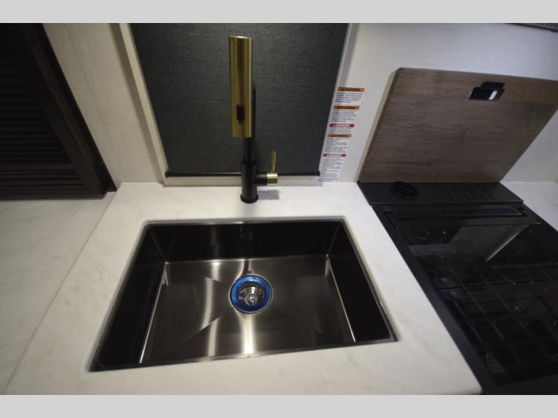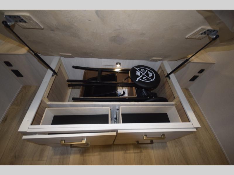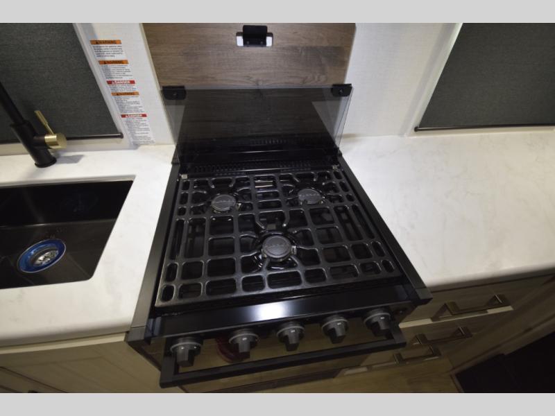 After a day of hiking, biking, or exploring, unwind in the front queen-size bed, complete with dual wardrobes that keep your clothing and gear organized and within reach. The rear kitchen layout gives the chef in your crew the freedom to cook up memorable meals on the three-burner cooktop, while the outdoor kitchen adds even more fun with a sink, refrigerator, and spice shelf—perfect for cooking under the open sky. Kick back with friends at the exterior bar and soak in the campground atmosphere.
