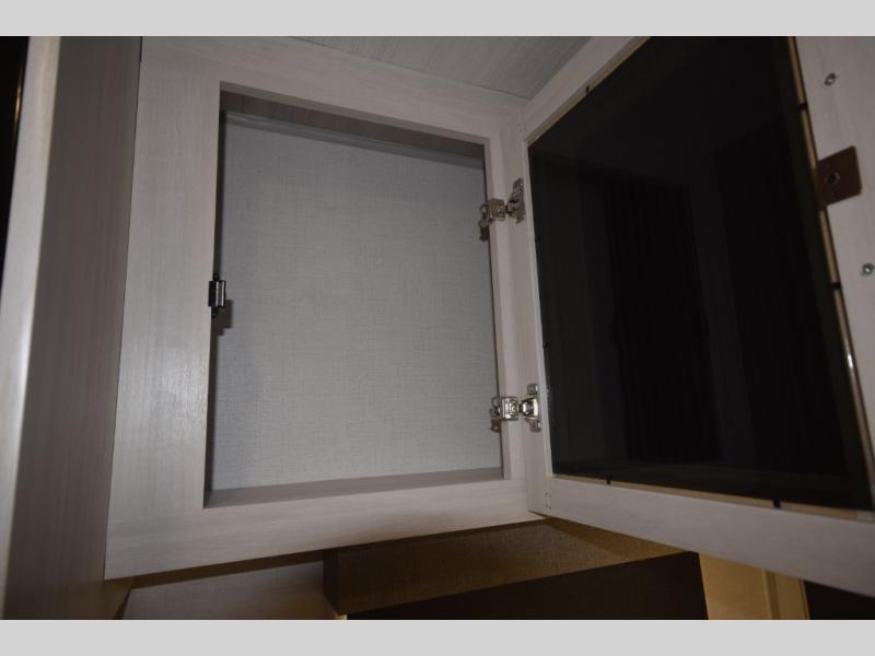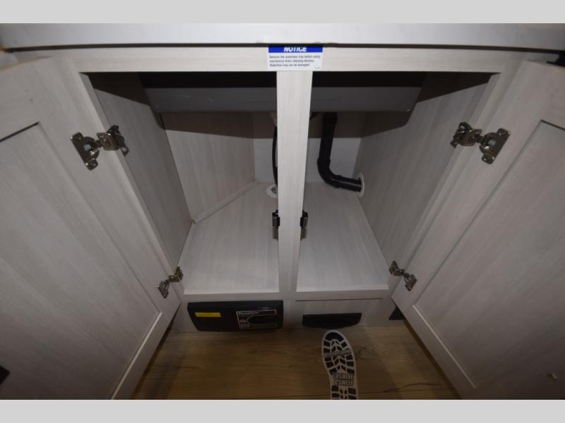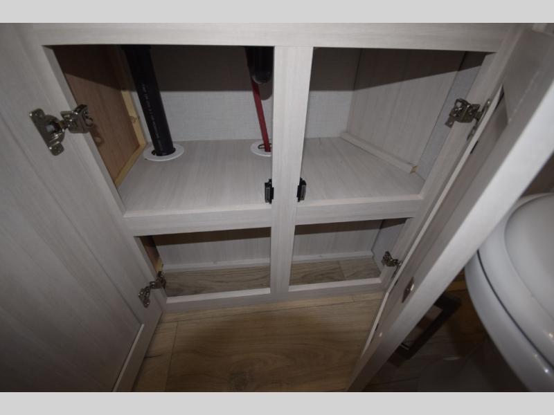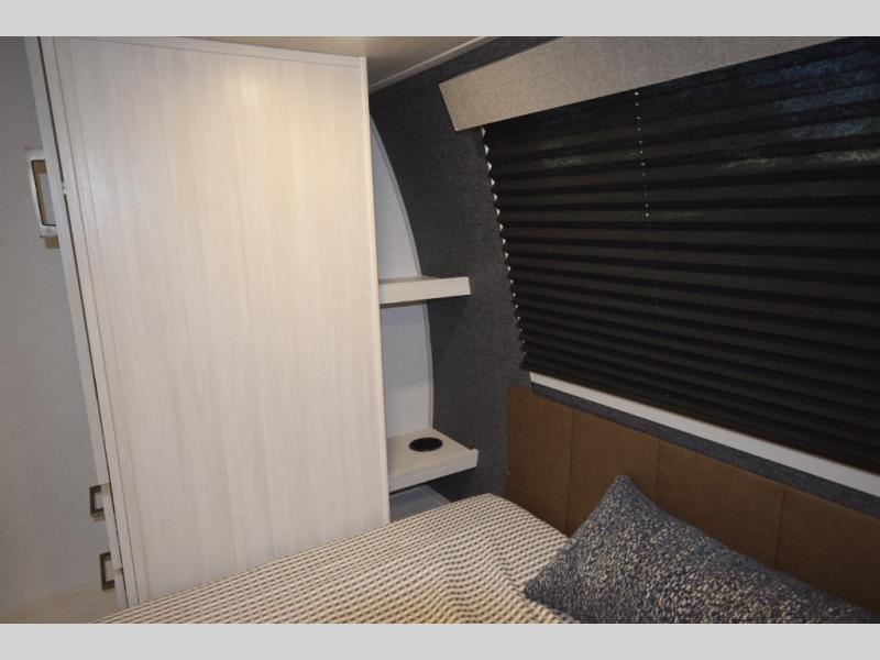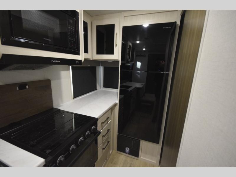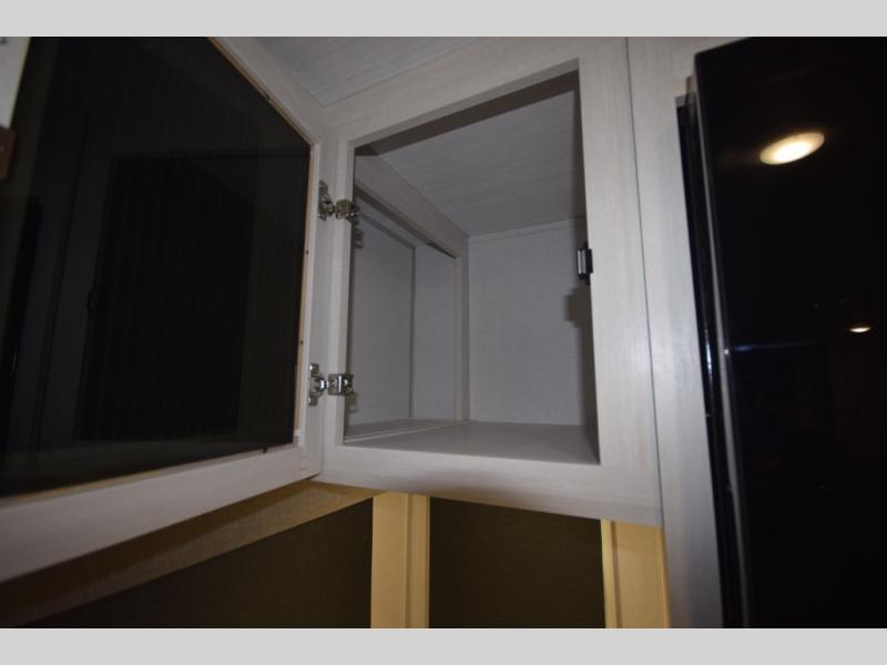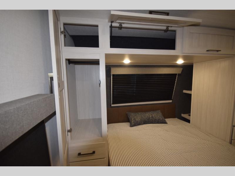 After a day of hiking, biking, or exploring, unwind in the front queen-size bed, complete with dual wardrobes that keep your clothing and gear organized and within reach. The rear kitchen layout gives the chef in your crew the freedom to cook up memorable meals on the three-burner cooktop, while the outdoor kitchen adds even more fun with a sink, refrigerator, and spice shelf—perfect for cooking under the open sky. Kick back with friends at the exterior bar and soak in the campground atmosphere.