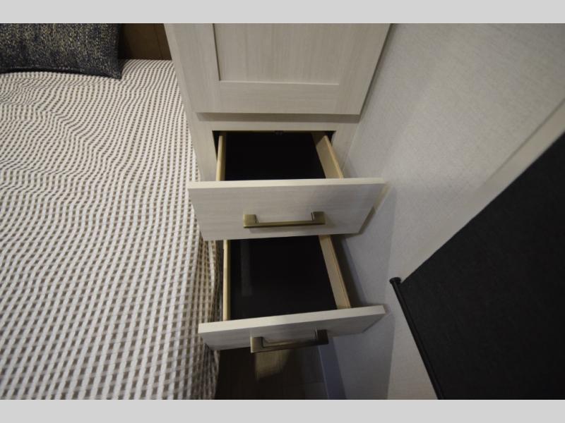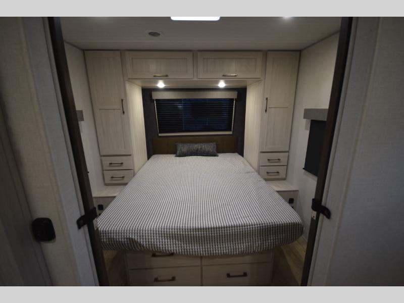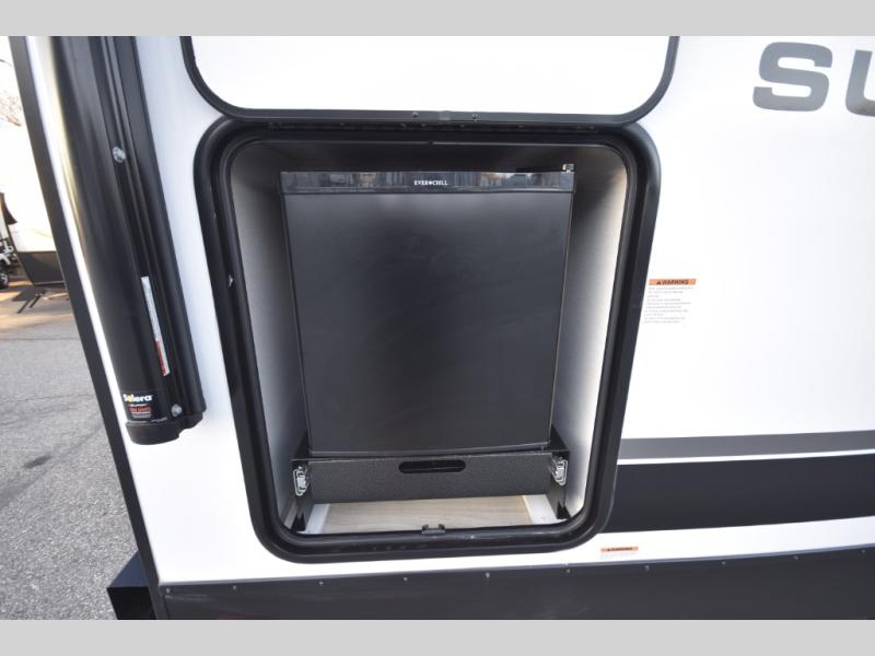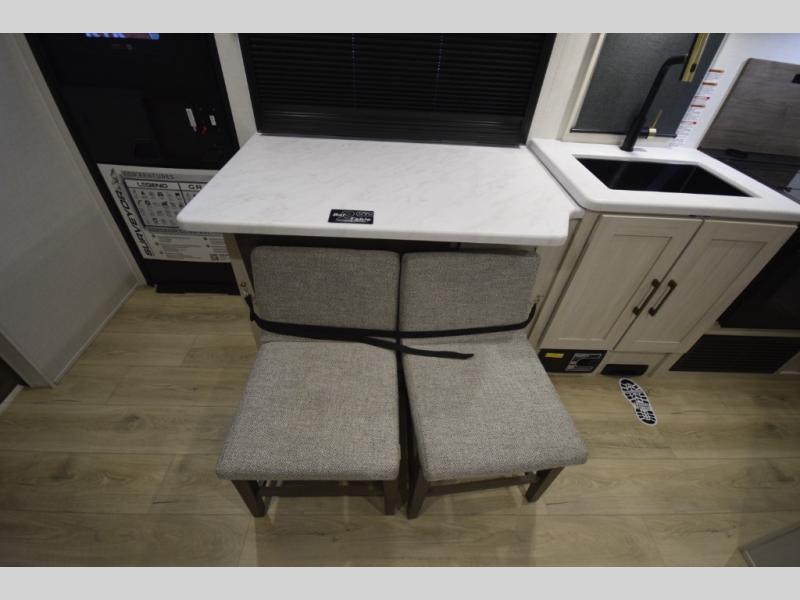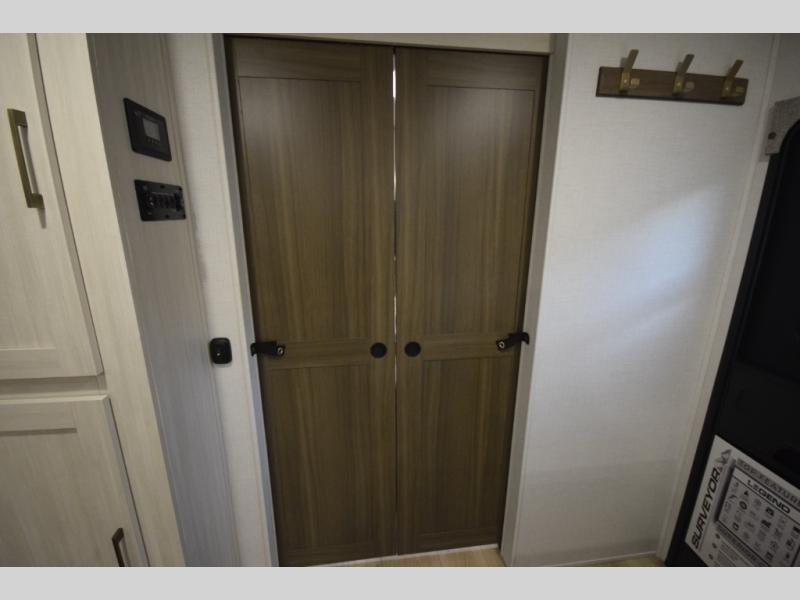 The standard Surveyor Legend Package elevates your camping experience with oversized dinette storage access doors, front slam-latch baggage doors, and an automotive-style tinted front windshield. Enjoy endless hot showers thanks to the tankless water heater, bring your bikes along using the 2-inch accessory hitch, and appreciate the carpet-free interior and central vacuum system for fast, stress-free cleanup.