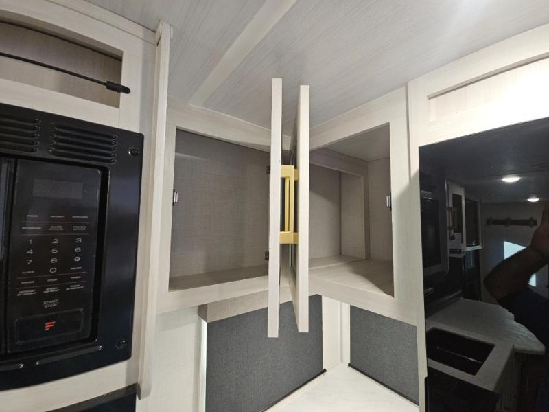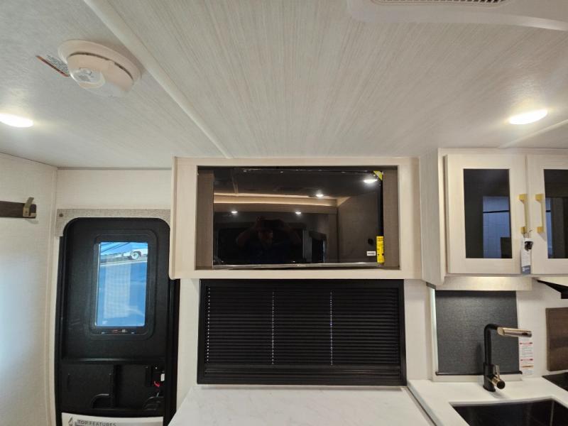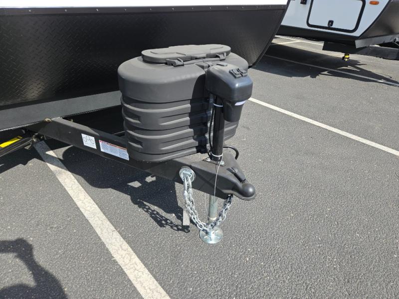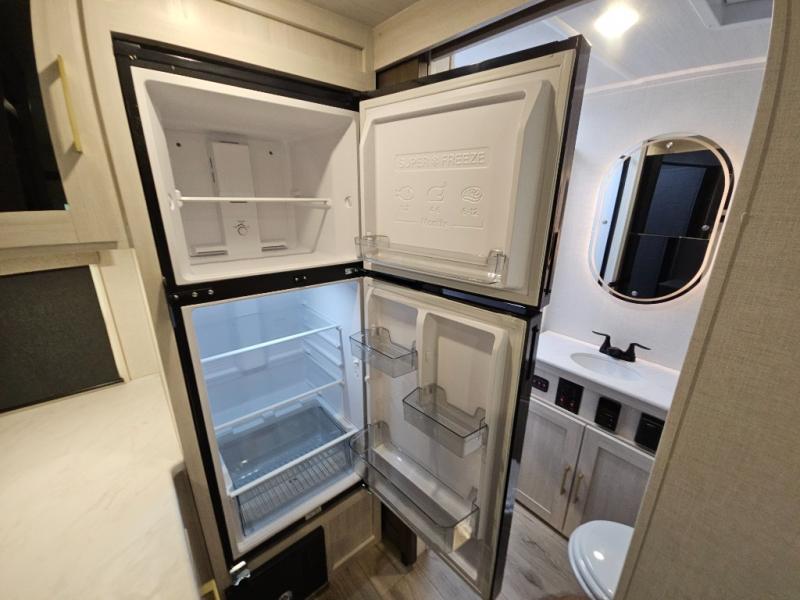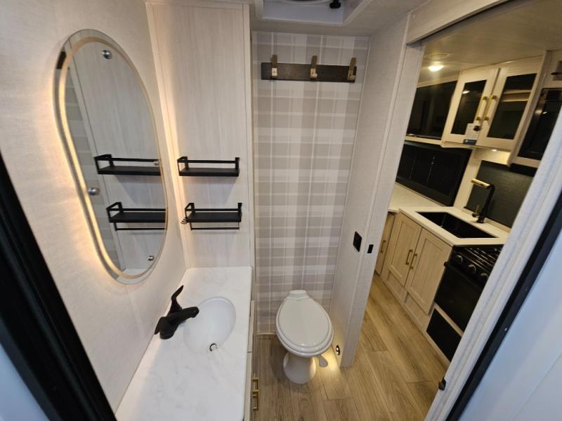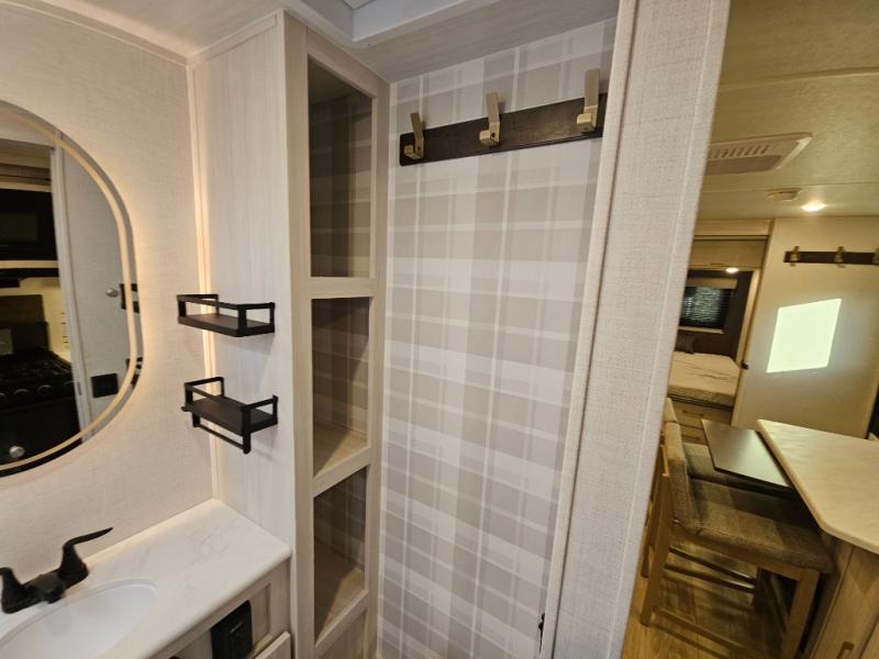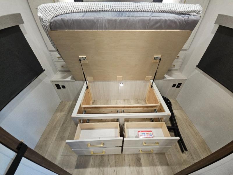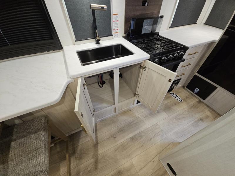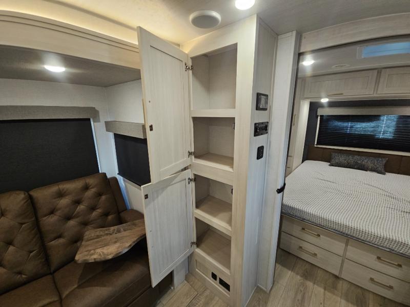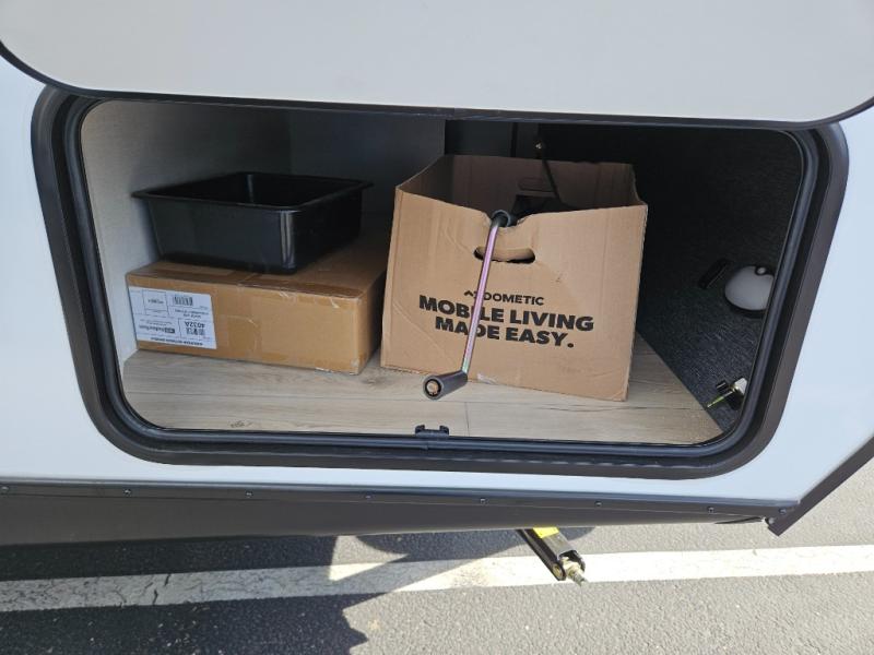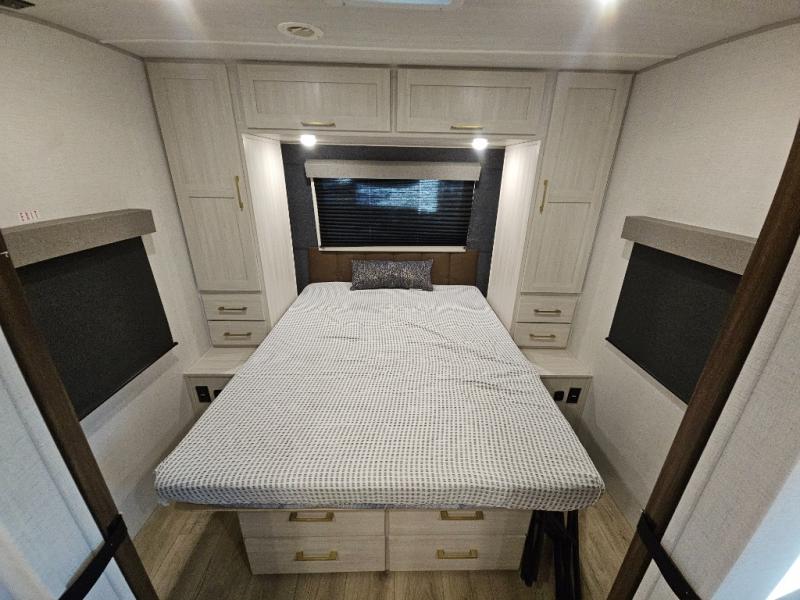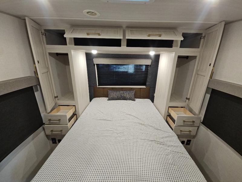 Head to your local state park for fun weekends in this cute couple's trailer. You can sleep at the queen-size bed each night, and you have two wardrobes on either side for storage. The chef of your group will have their choice to cook indoors on the three burner cooktop. There is also an outdoor kitchen with a sink, a refrigerator, and a shelf to store spices. You can also find more ways to enjoy nature, and why not even have some drinks at the exterior bar. Each day you can clean up in the full bath with an upgraded slow-close shower door and a linen closet for clean towels.