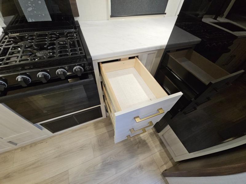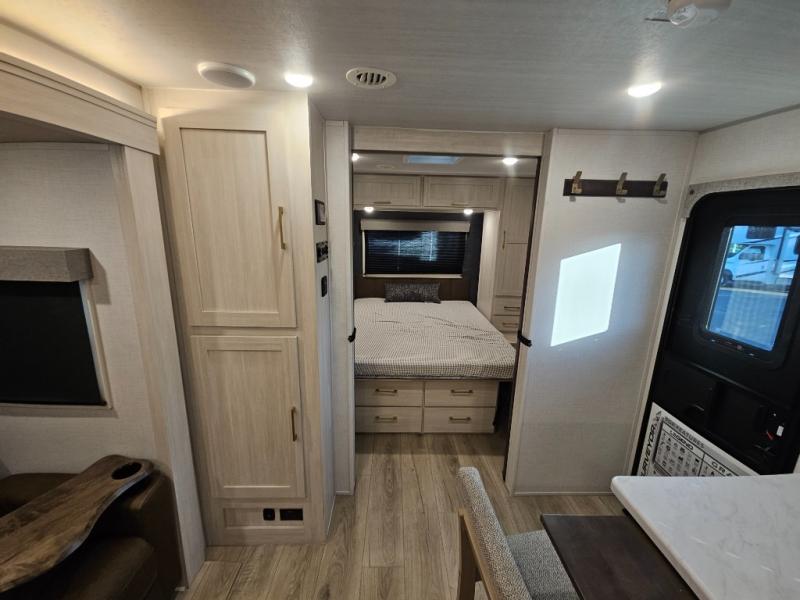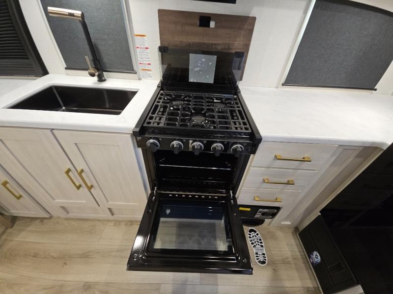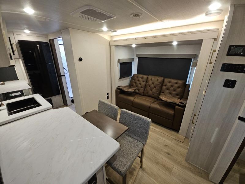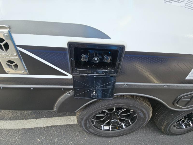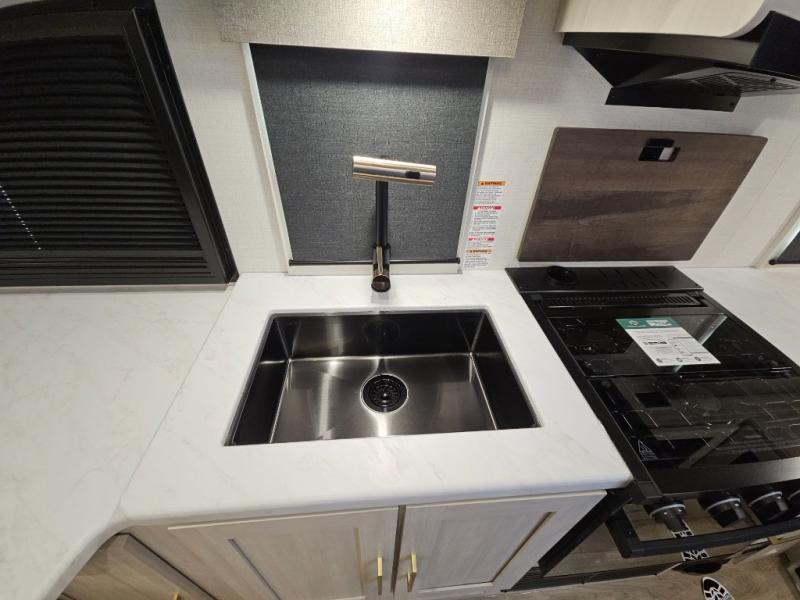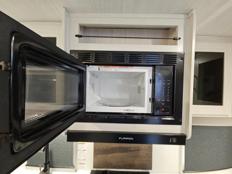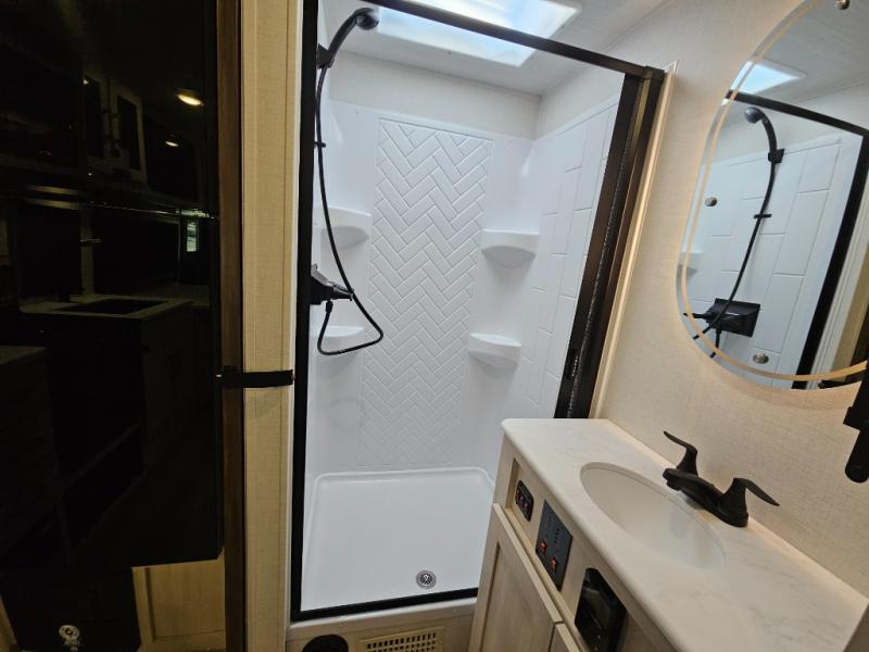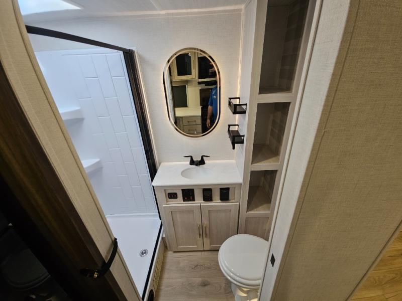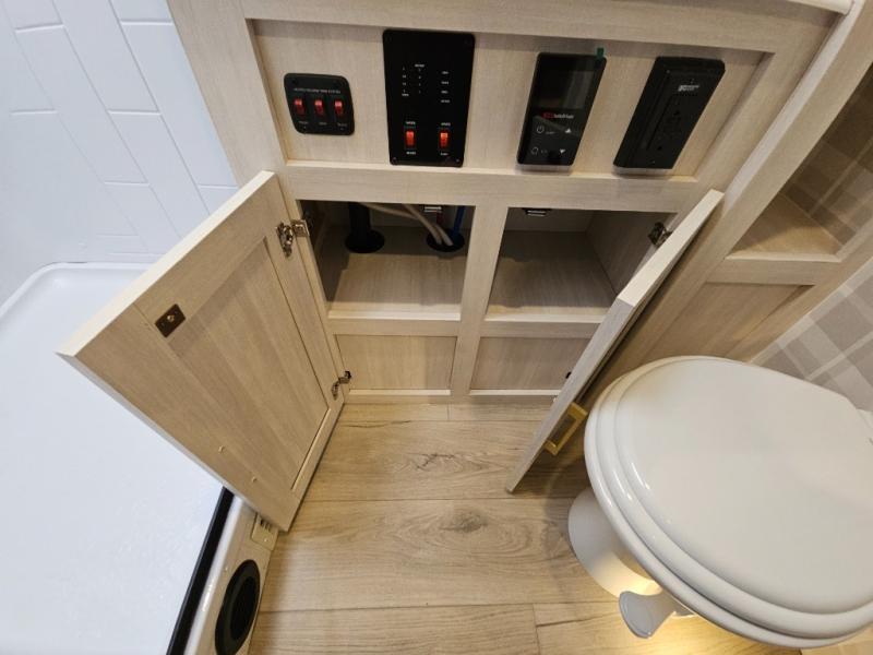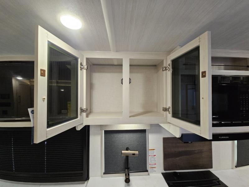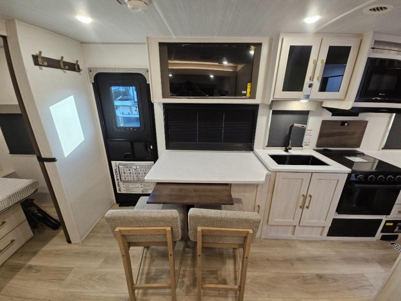Head to your local state park for fun weekends in this cute couple's trailer. You can sleep at the queen-size bed each night, and you have two wardrobes on either side for storage. The chef of your group will have their choice to cook indoors on the three burner cooktop. There is also an outdoor kitchen with a sink, a refrigerator, and a shelf to store spices. You can also find more ways to enjoy nature, and why not even have some drinks at the exterior bar. Each day you can clean up in the full bath with an upgraded slow-close shower door and a linen closet for clean towels.