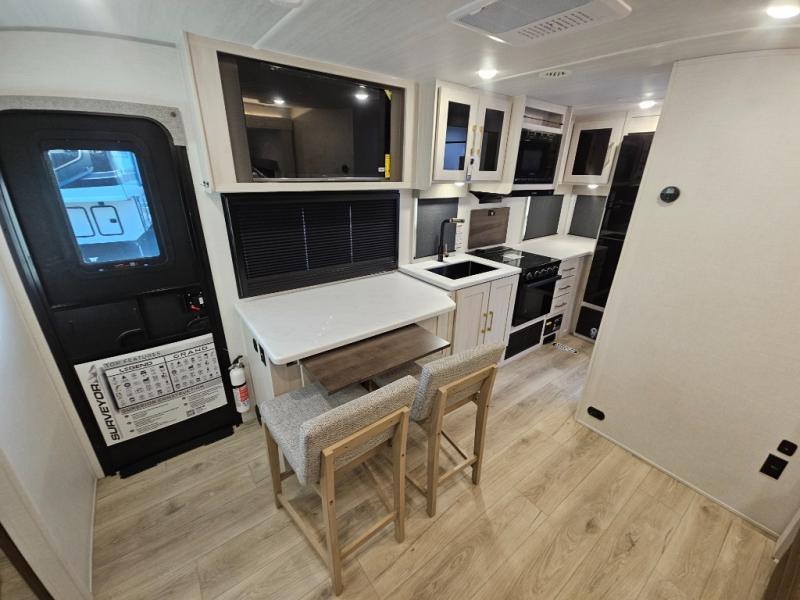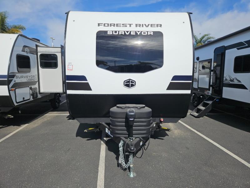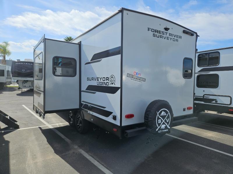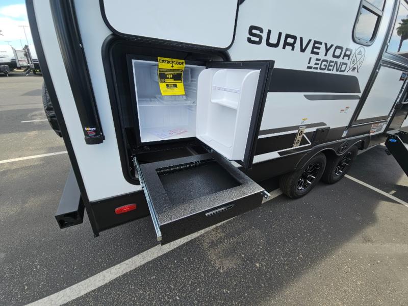 With any Surveyor Legend travel trailer by Forest River you will enjoy quality craftsmanship, convenient amenities, and at-home comforts. The Azdel composite walls provide a longer-lasting trailer, and the power tongue jack with hitch light makes getting back on the road quick and easy. There are also Goodyear® tires and a tire pressure monitoring system (TPMS) for more confident, hassle-free towing. Each model is built with thoughtful details like slam-latch exterior baggage doors and an automotive-style tinted front windshield that gives the front cap a sleek look while letting in natural light. You’ll appreciate camping with a tankless water heater for endless hot showers, a 2" rear accessory hitch to bring bikes or extra gear along, plus a central vacuum system that helps keep your easy-to-clean interior looking fresh.