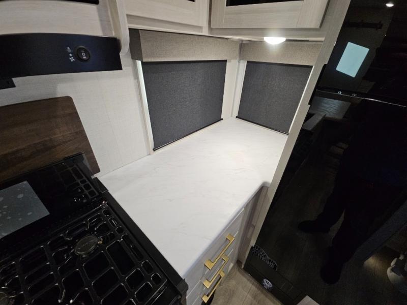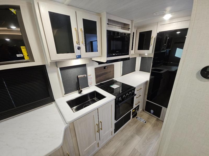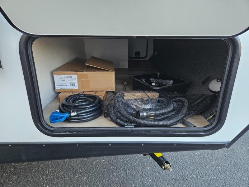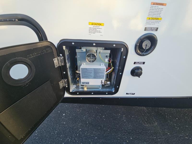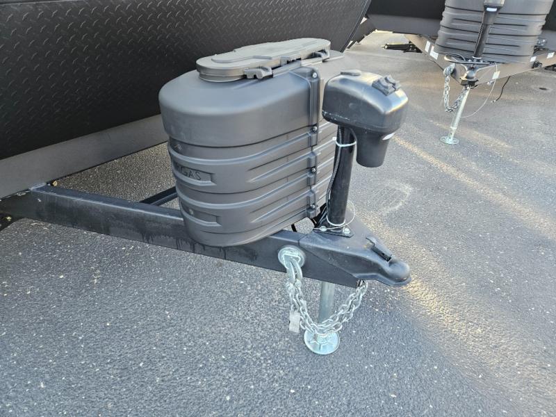 Head to your local state park for fun weekends in this cute couple's trailer. You can sleep at the queen-size bed each night, and you have two wardrobes on either side for storage. The chef of your group will have their choice to cook indoors on the three burner cooktop. There is also an outdoor kitchen with a sink, a refrigerator, and a shelf to store spices. You can also find more ways to enjoy nature, and why not even have some drinks at the exterior bar. Each day you can clean up in the full bath with an upgraded slow-close shower door and a linen closet for clean towels.