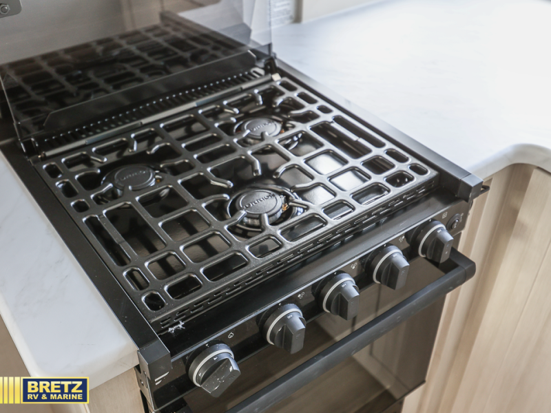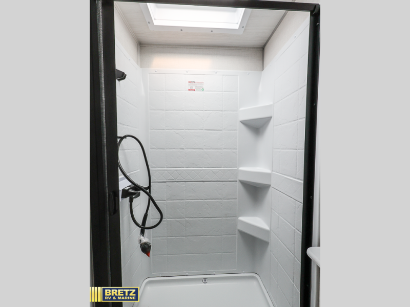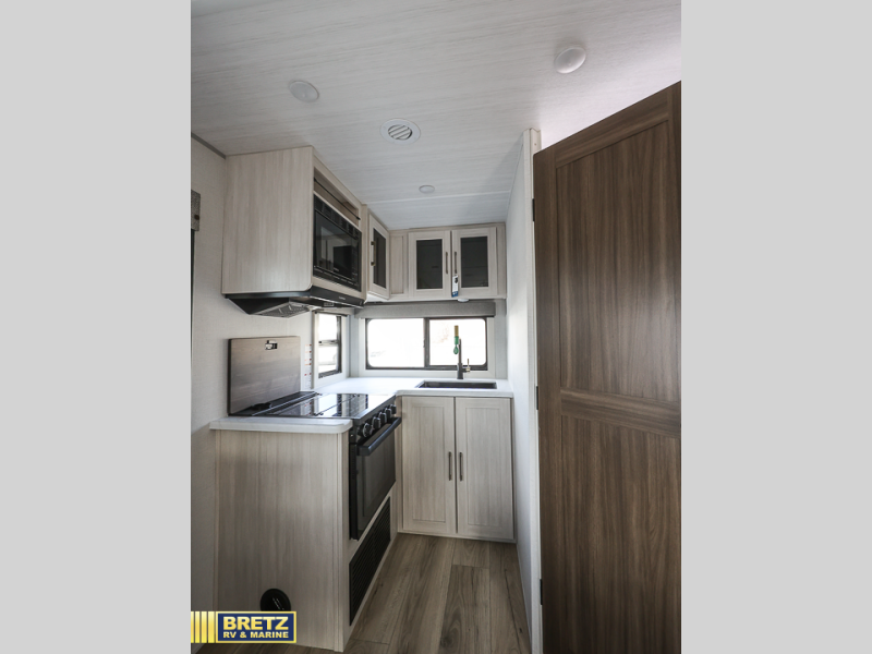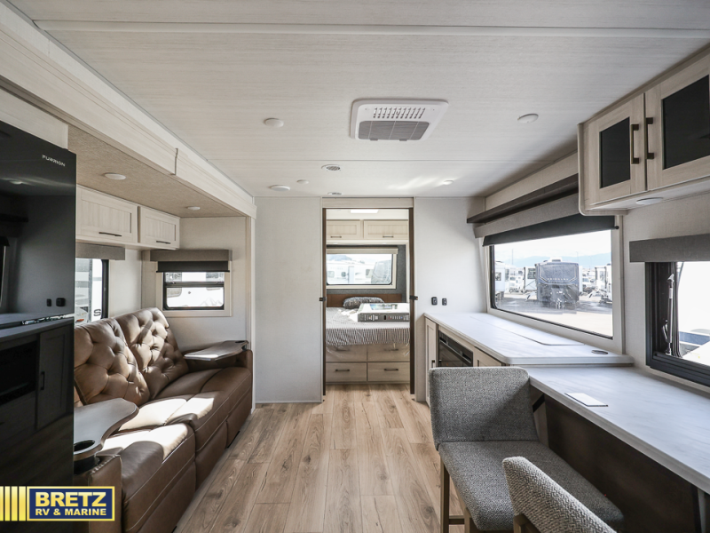 Packed with a lot of comfort into a manageable footprint is what you are getting with this model. Up front, you’ll find a cozy queen bed where you can really stretch out at the end of the day, and when it’s time to unwind, the TV lift brings your entertainment up into view across from the theater seating so you can actually relax instead of craning your neck at an awkward angle. A dedicated pantry gives you real space for dry goods and snacks so the kitchen doesn’t feel cluttered, even on longer trips. Outside, this floorplan really leans into campsite living with a handy outside kitchen that keeps you in the action while you’re cooking.