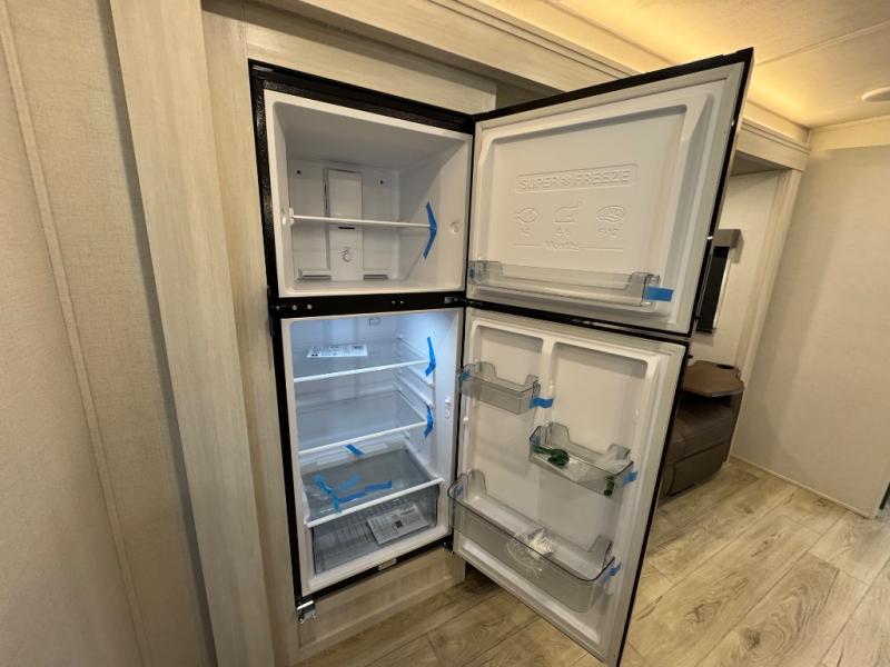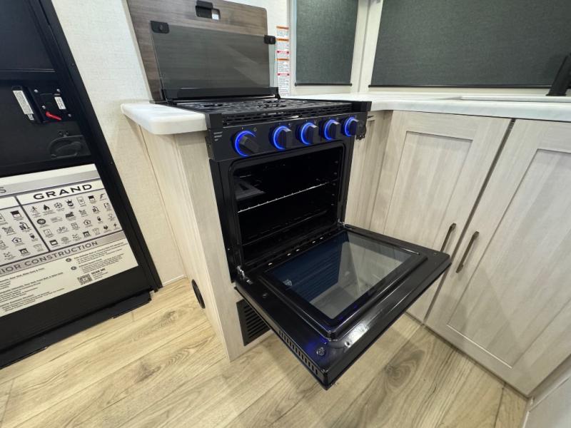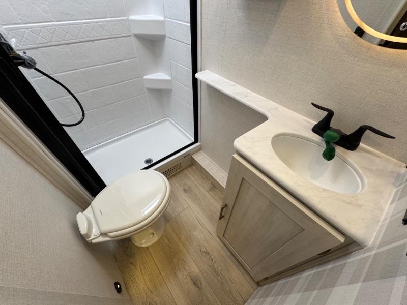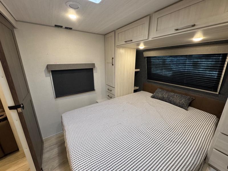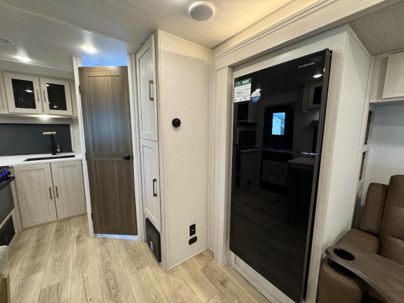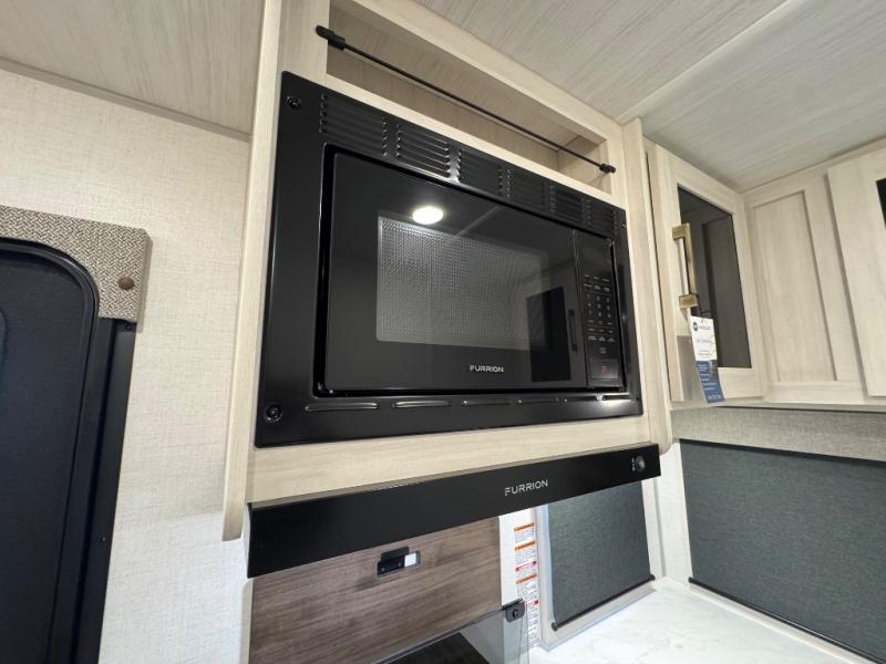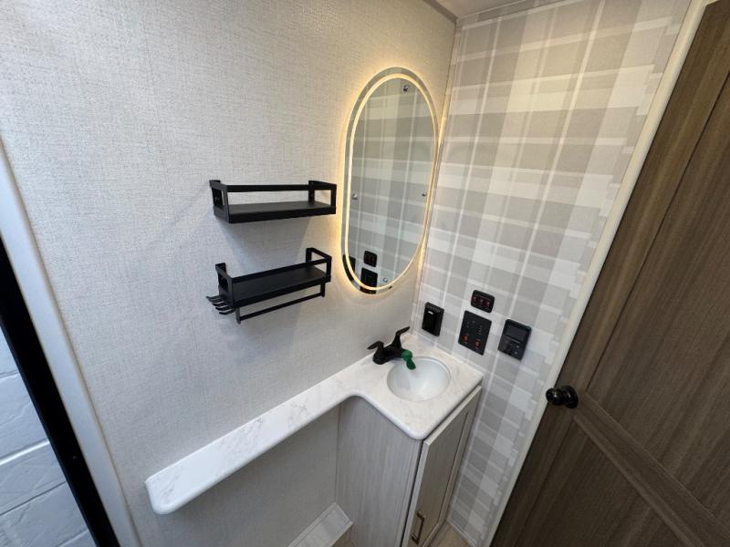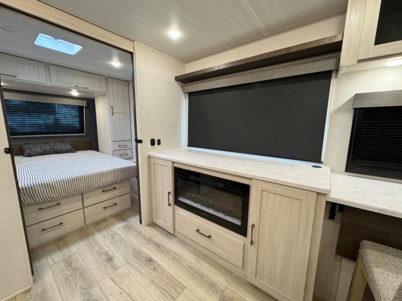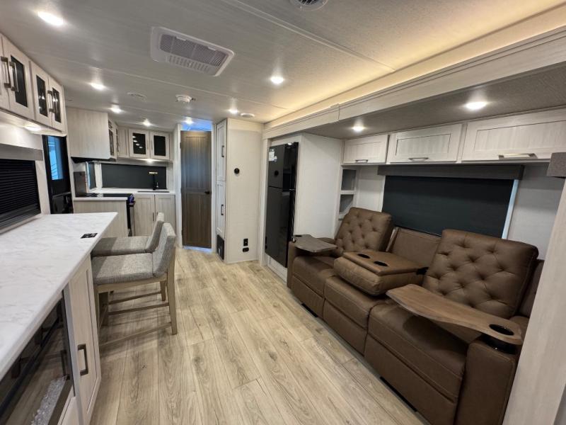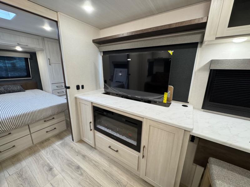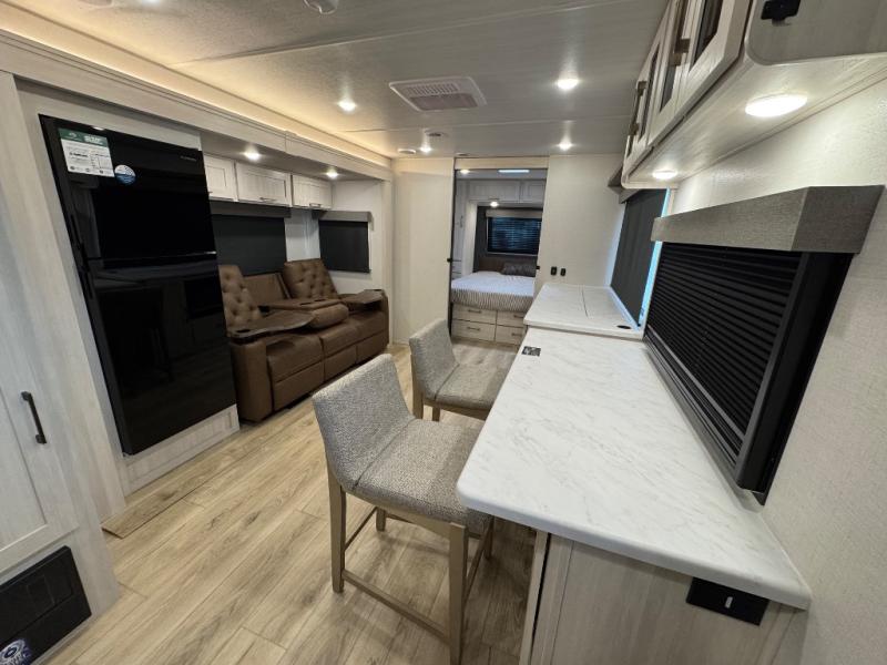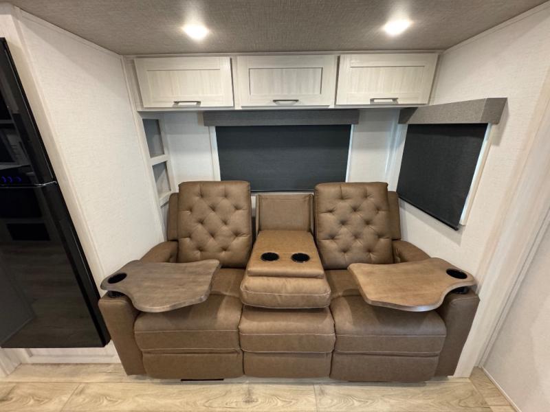 Packed with a lot of comfort into a manageable footprint is what you are getting with this model. Up front, you’ll find a cozy queen bed where you can really stretch out at the end of the day, and when it’s time to unwind, the TV lift brings your entertainment up into view across from the theater seating so you can actually relax instead of craning your neck at an awkward angle. A dedicated pantry gives you real space for dry goods and snacks so the kitchen doesn’t feel cluttered, even on longer trips. Outside, this floorplan really leans into campsite living with a handy outside kitchen that keeps you in the action while you’re cooking.