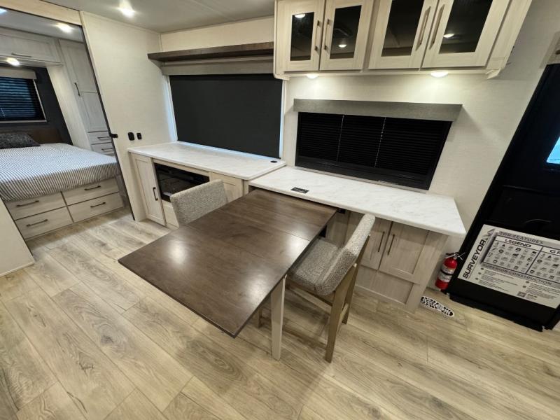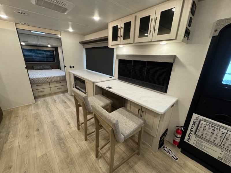 With any Surveyor Legend travel trailer by Forest River you will enjoy quality craftsmanship, convenient amenities, and at-home comforts. The Azdel composite walls provide a longer-lasting trailer, and the power tongue jack with hitch light makes getting back on the road quick and easy. There are also Goodyear® tires and a tire pressure monitoring system (TPMS) for more confident, hassle-free towing. Each model is built with thoughtful details like slam-latch exterior baggage doors and an automotive-style tinted front windshield that gives the front cap a sleek look while letting in natural light. You’ll appreciate camping with a tankless water heater for endless hot showers, a 2" rear accessory hitch to bring bikes or extra gear along, plus a central vacuum system that helps keep your easy-to-clean interior looking fresh.