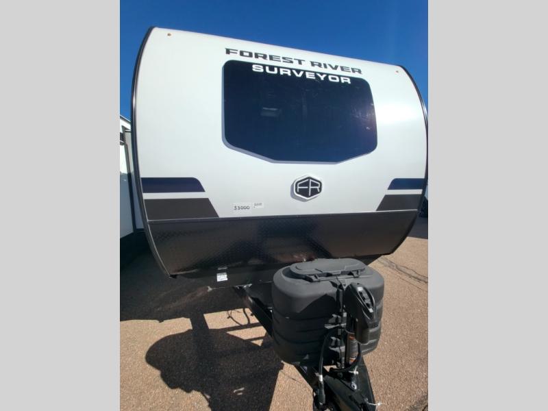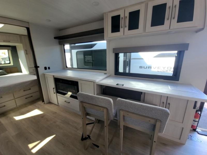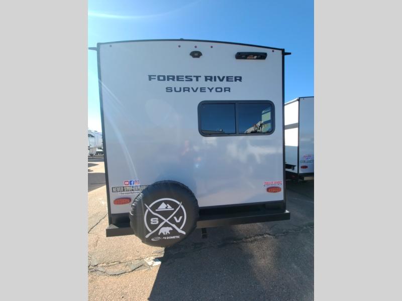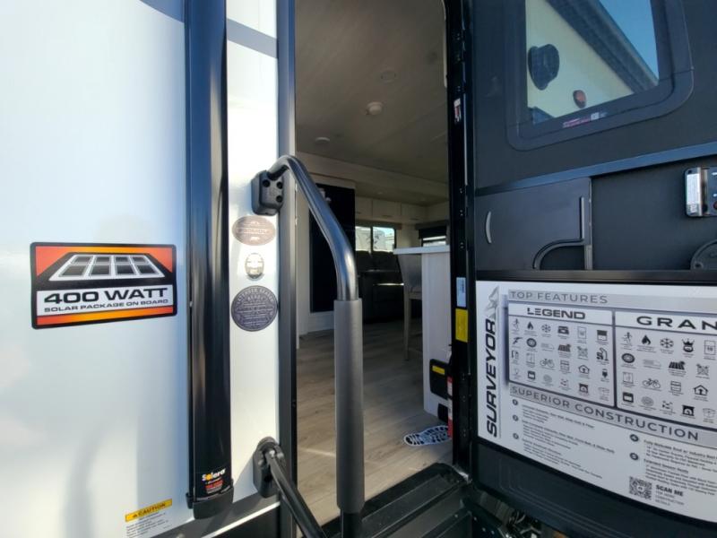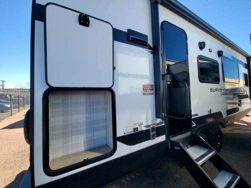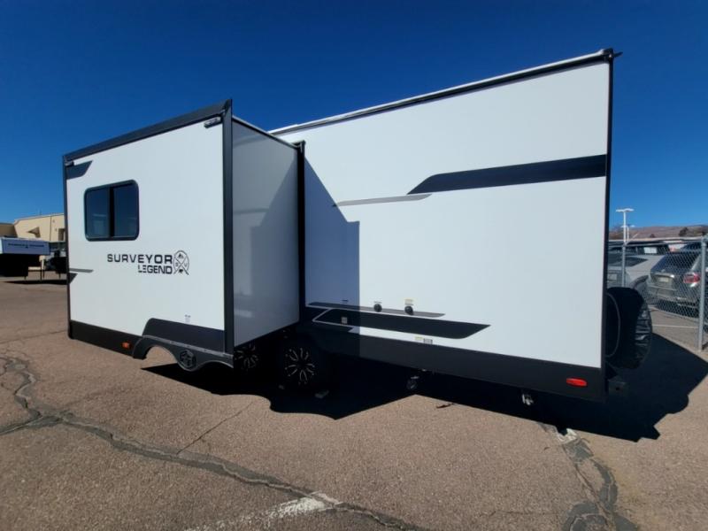 With any Surveyor Legend travel trailer by Forest River you will enjoy quality craftsmanship, convenient amenities, and at-home comforts. The Azdel composite walls provide a longer-lasting trailer, and the power tongue jack with hitch light makes getting back on the road quick and easy. There are also Goodyear® tires and a tire pressure monitoring system (TPMS) for more confident, hassle-free towing. Each model is built with thoughtful details like slam-latch exterior baggage doors and an automotive-style tinted front windshield that gives the front cap a sleek look while letting in natural light. You’ll appreciate camping with a tankless water heater for endless hot showers, a 2" rear accessory hitch to bring bikes or extra gear along, plus a central vacuum system that helps keep your easy-to-clean interior looking fresh.