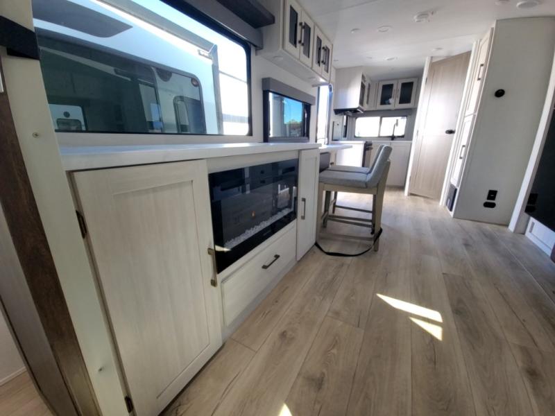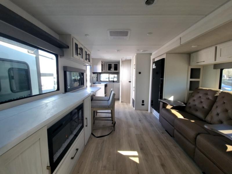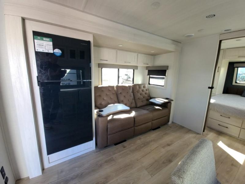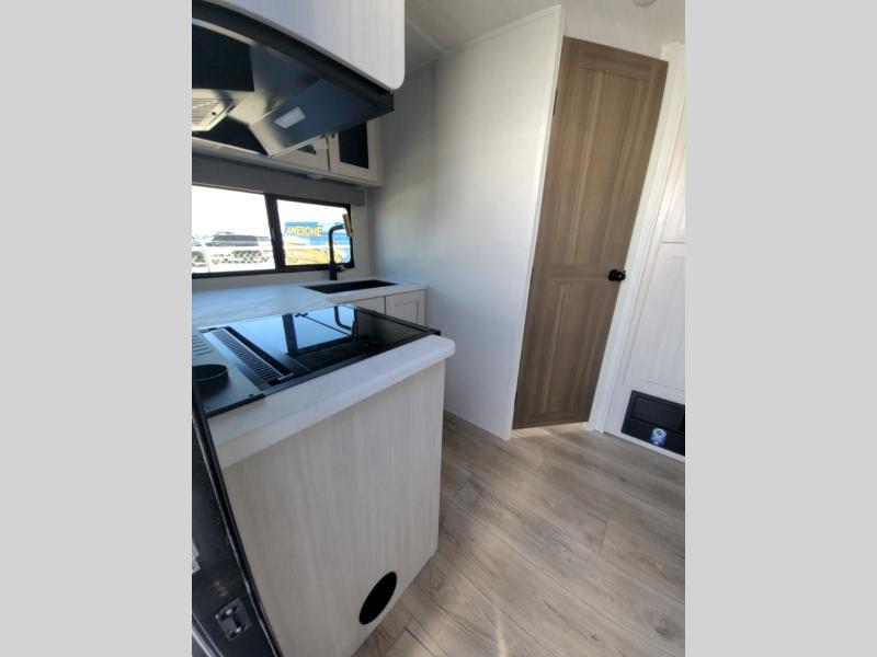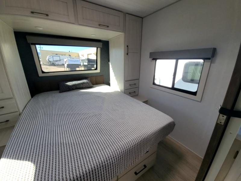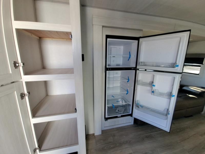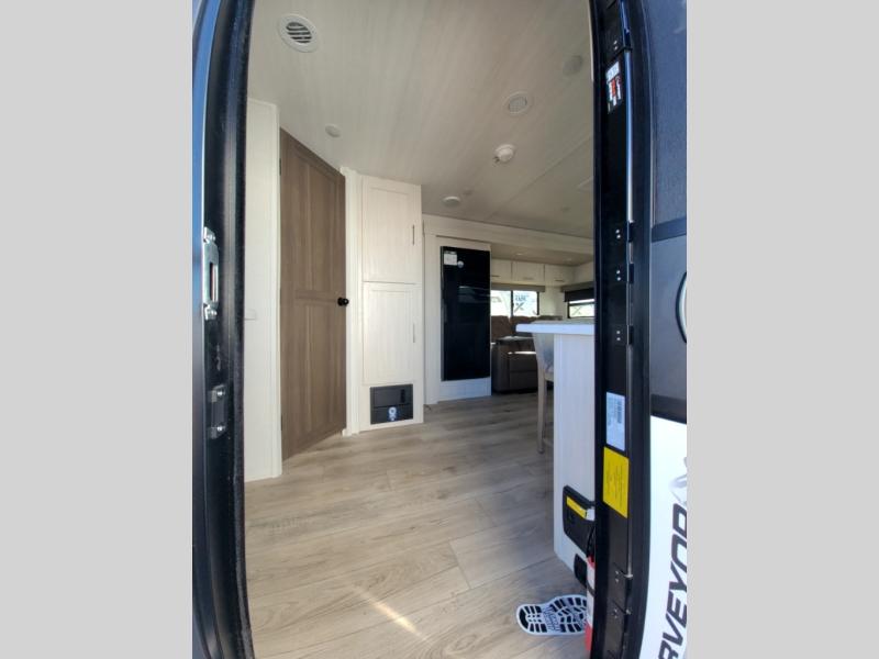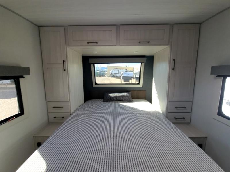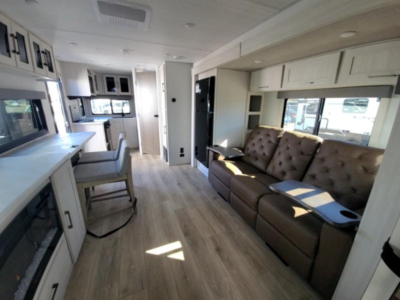 Packed with a lot of comfort into a manageable footprint is what you are getting with this model. Up front, you’ll find a cozy queen bed where you can really stretch out at the end of the day, and when it’s time to unwind, the TV lift brings your entertainment up into view across from the theater seating so you can actually relax instead of craning your neck at an awkward angle. A dedicated pantry gives you real space for dry goods and snacks so the kitchen doesn’t feel cluttered, even on longer trips. Outside, this floorplan really leans into campsite living with a handy outside kitchen that keeps you in the action while you’re cooking.