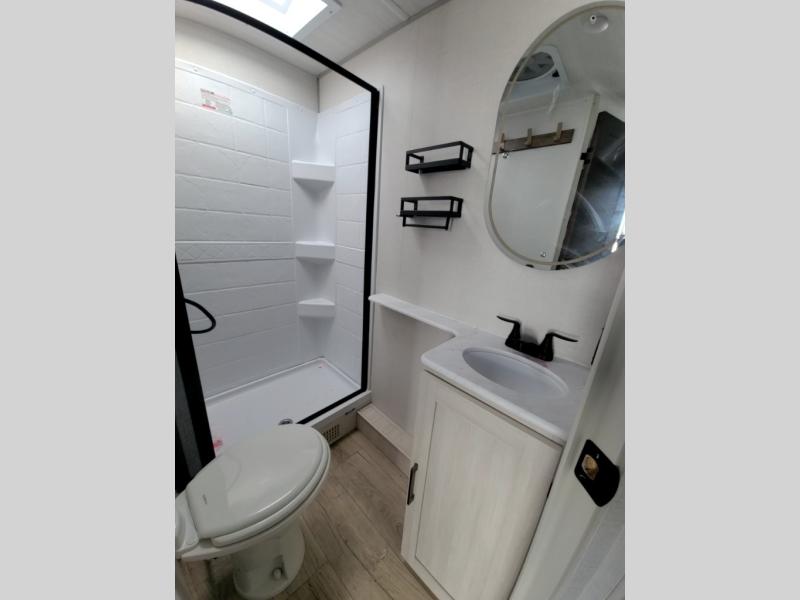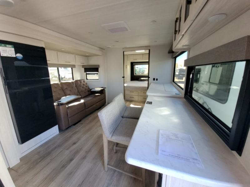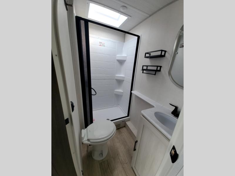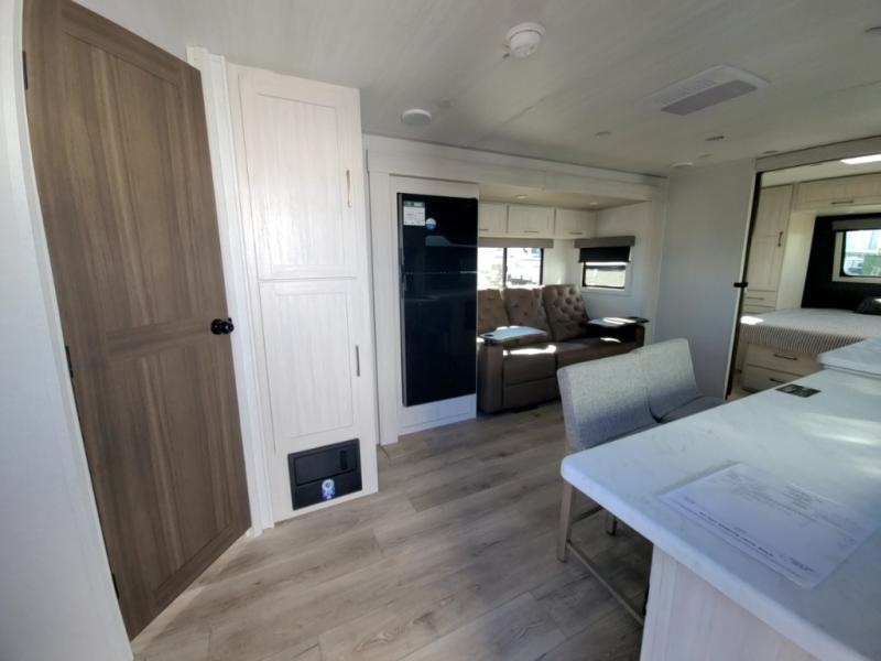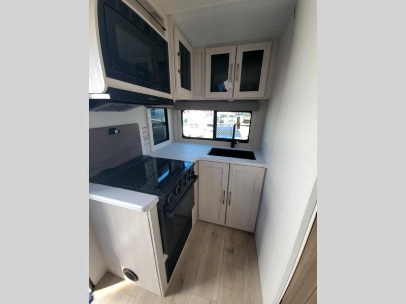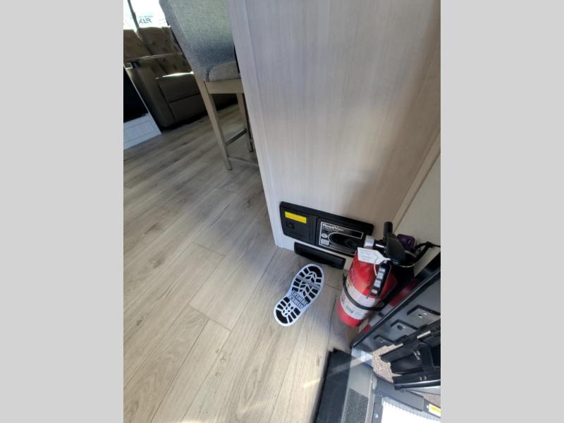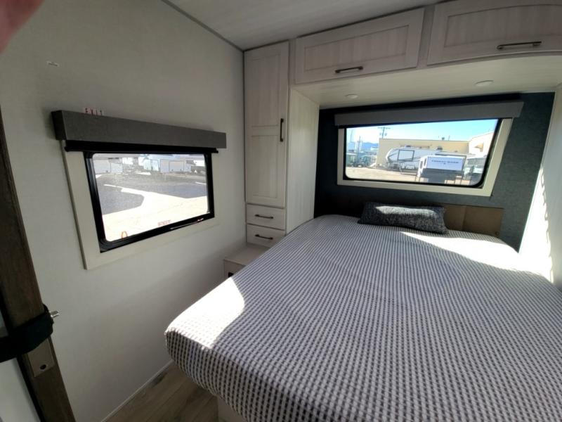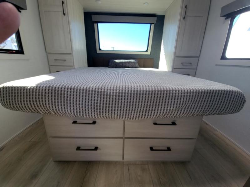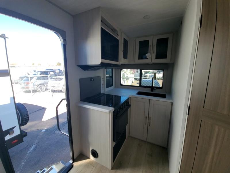 Packed with a lot of comfort into a manageable footprint is what you are getting with this model. Up front, you’ll find a cozy queen bed where you can really stretch out at the end of the day, and when it’s time to unwind, the TV lift brings your entertainment up into view across from the theater seating so you can actually relax instead of craning your neck at an awkward angle. A dedicated pantry gives you real space for dry goods and snacks so the kitchen doesn’t feel cluttered, even on longer trips. Outside, this floorplan really leans into campsite living with a handy outside kitchen that keeps you in the action while you’re cooking.