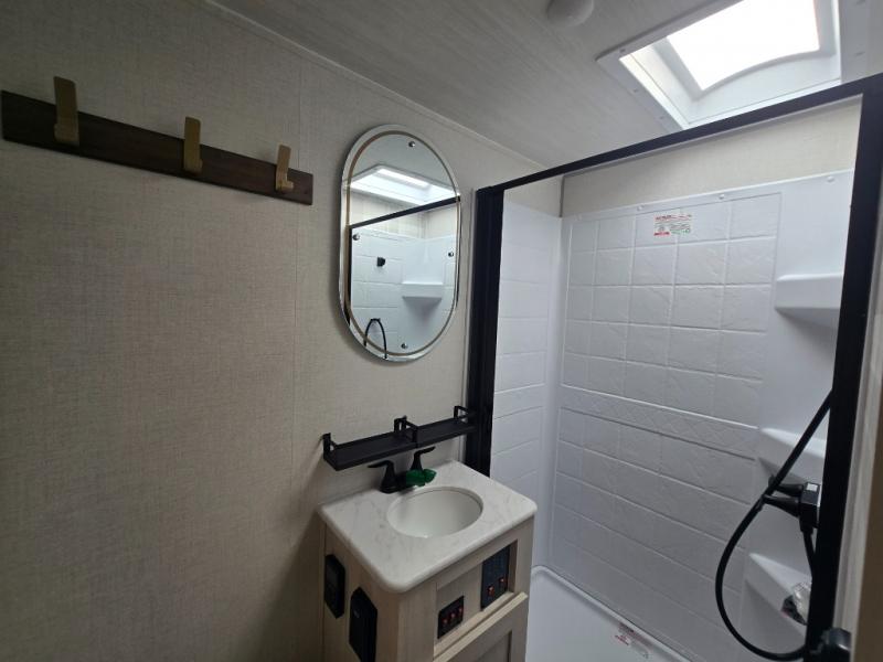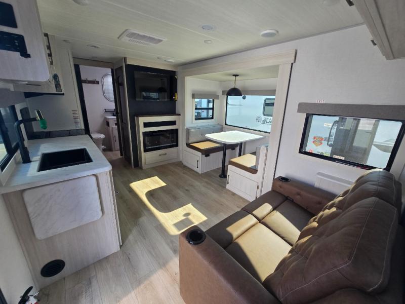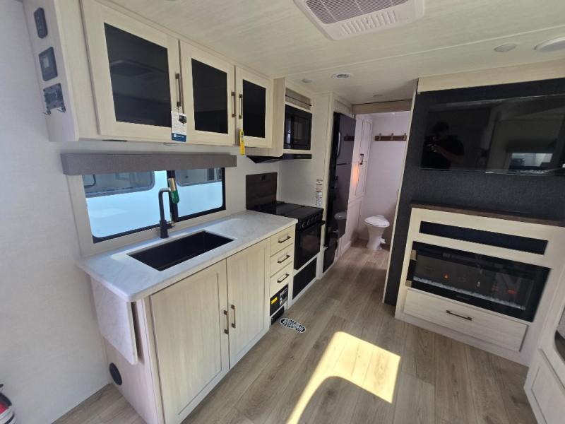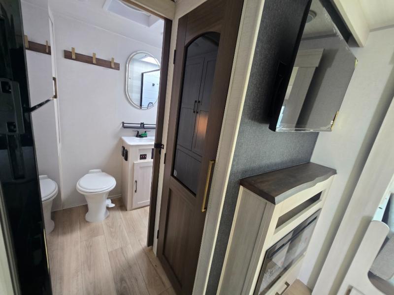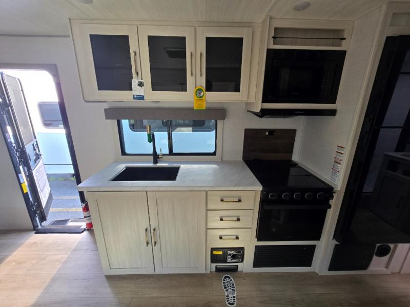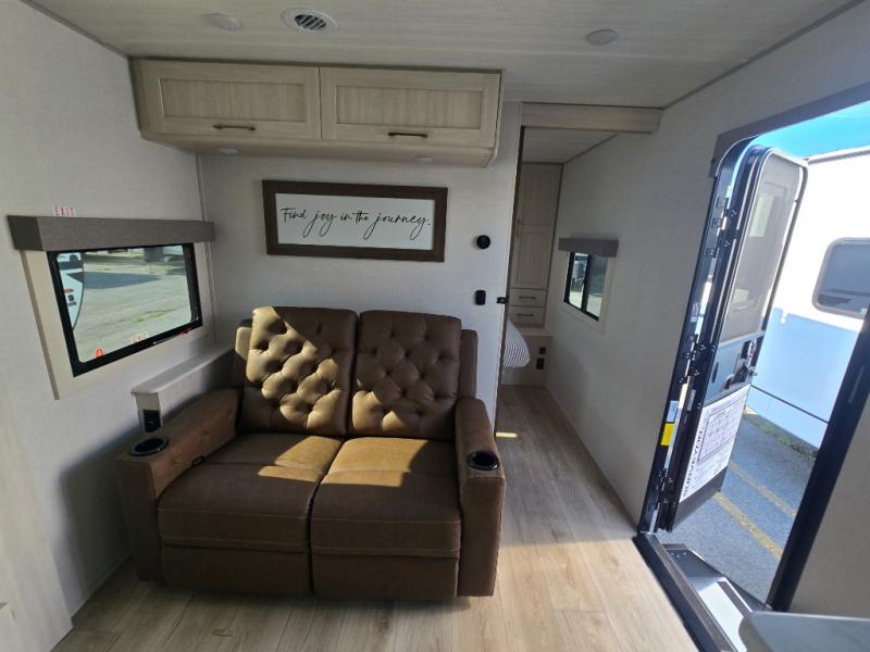 Whether you're camping with friends or family, you'll love the space and comfort found in this travel trailer. The outside kitchen is packed with features, such as a gas griddle, sink, refrigerator, and a shelf, plus there is a 21' electric awning for shade. Head inside to relax on the tri-fold sofa, or play a game at the booth dinette. You will also love the HD TV for your favorite shows at night. This model includes a full rear bath with a linen closet for clean towels and an upgraded slow-close shower door.