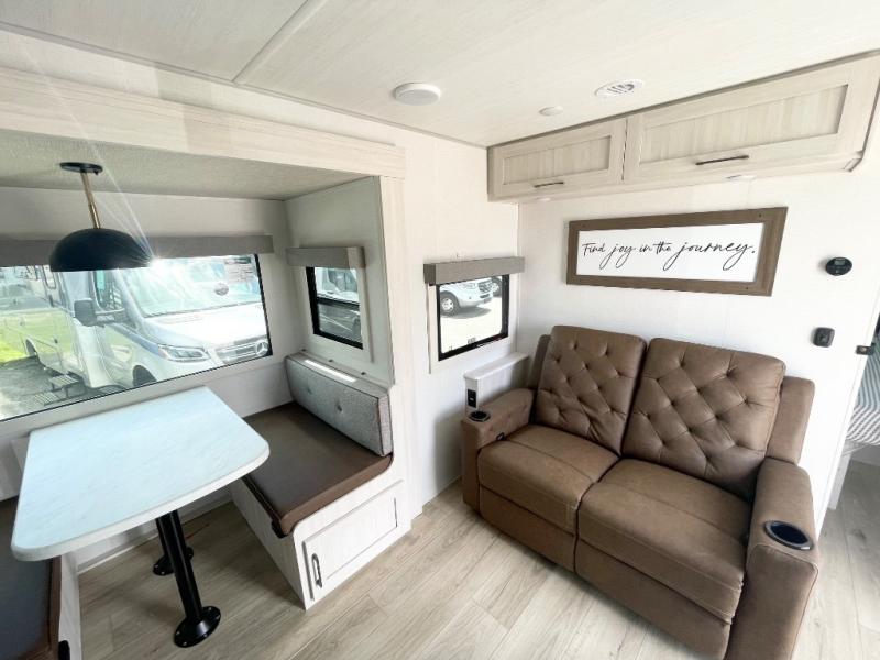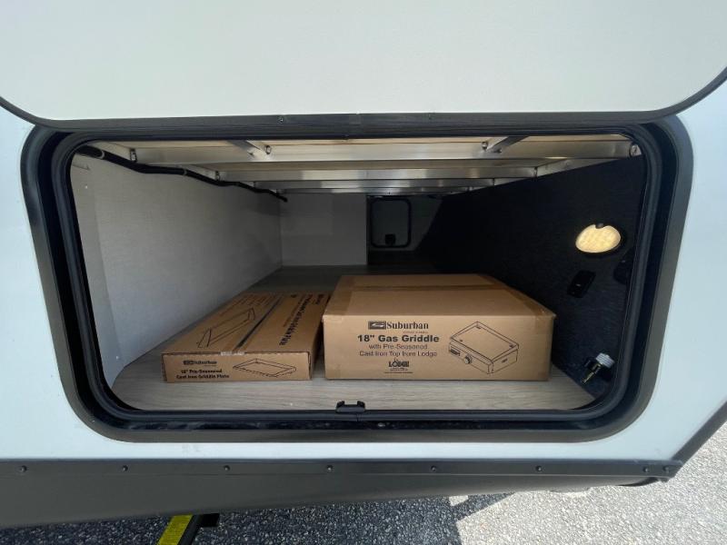 Whether you're camping with friends or family, you'll love the space and comfort found in this travel trailer. The outside kitchen is packed with features, such as a gas griddle, sink, refrigerator, and a shelf, plus there is a 21' electric awning for shade. Head inside to relax on the tri-fold sofa, or play a game at the booth dinette. You will also love the HD TV for your favorite shows at night. This model includes a full rear bath with a linen closet for clean towels and an upgraded slow-close shower door.