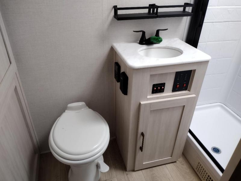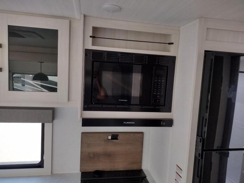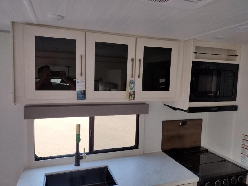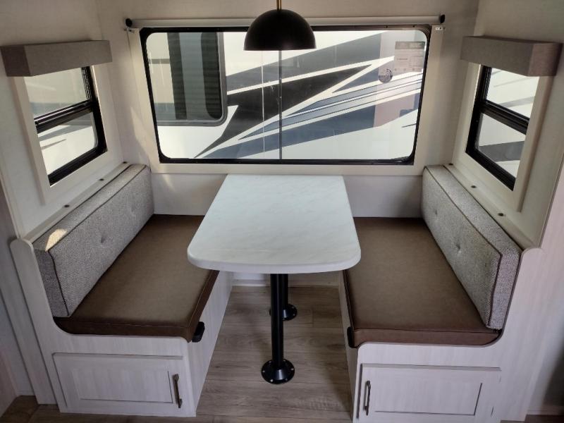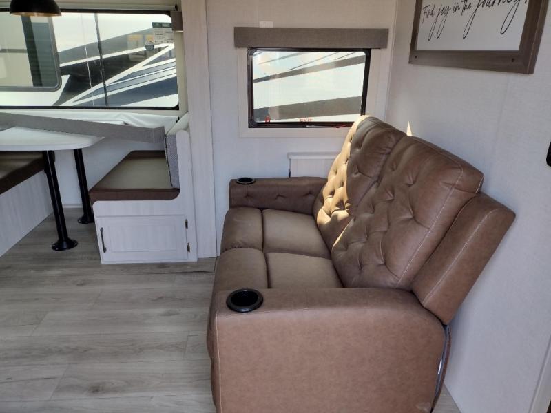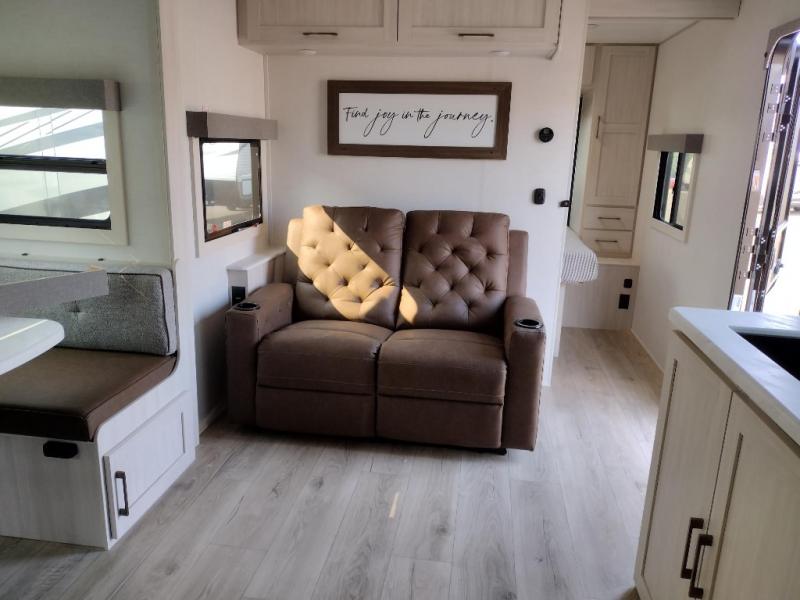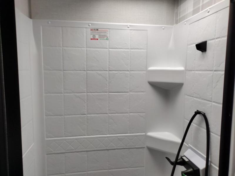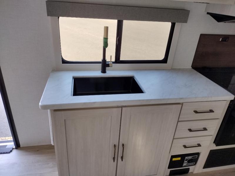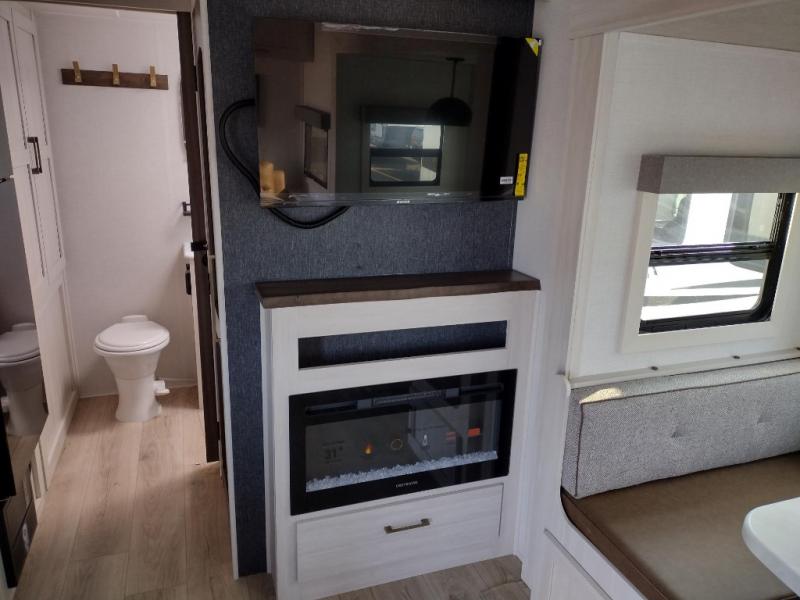Whether you're camping with friends or family, you'll love the space and comfort found in this travel trailer. The outside kitchen is packed with features, such as a gas griddle, sink, refrigerator, and a shelf, plus there is a 21' electric awning for shade. Head inside to relax on the EZ- out sofa, or play a game at the booth dinette. You will also love the HD TV for your favorite shows at night. This model includes a full rear bath with a linen closet for clean towels and an upgraded slow-close shower door.