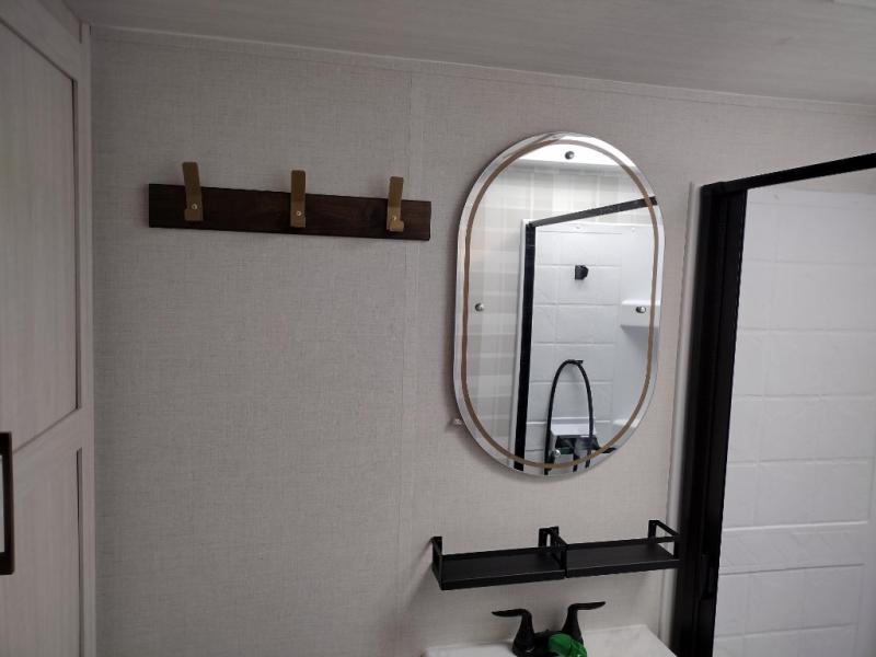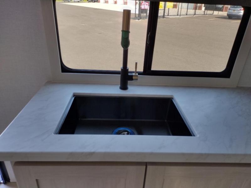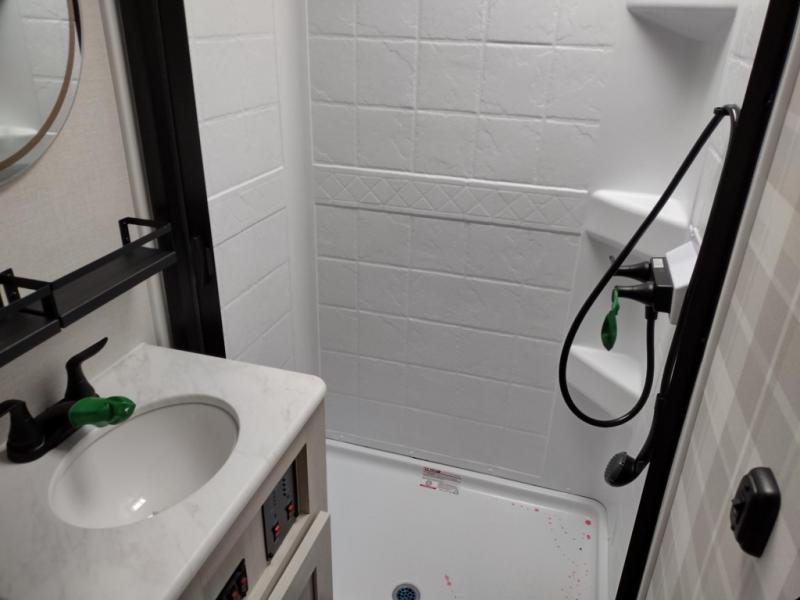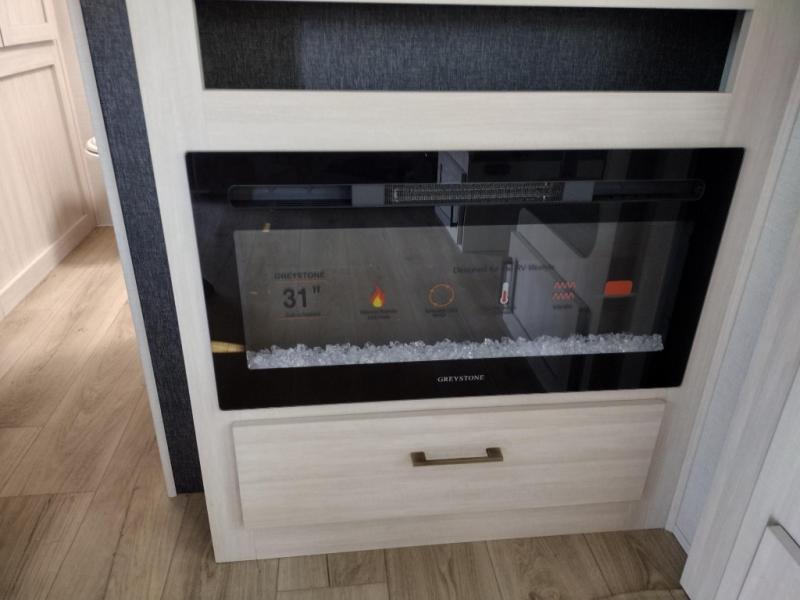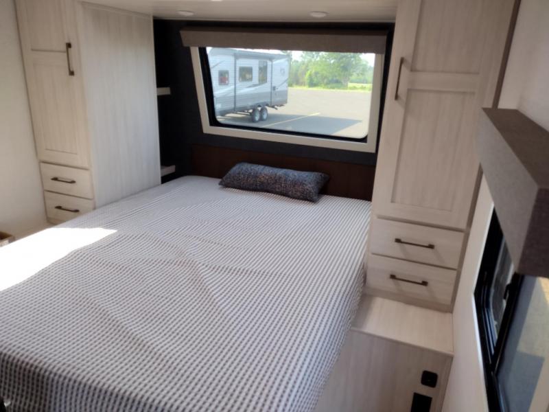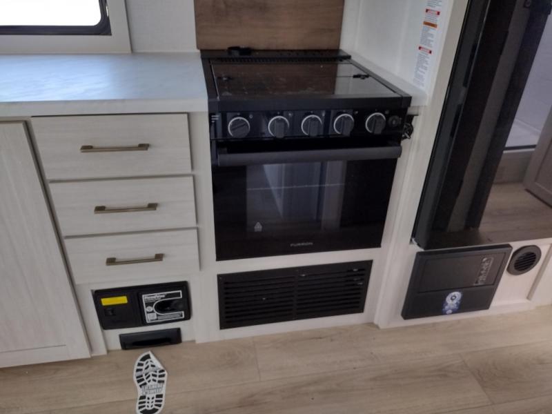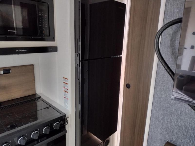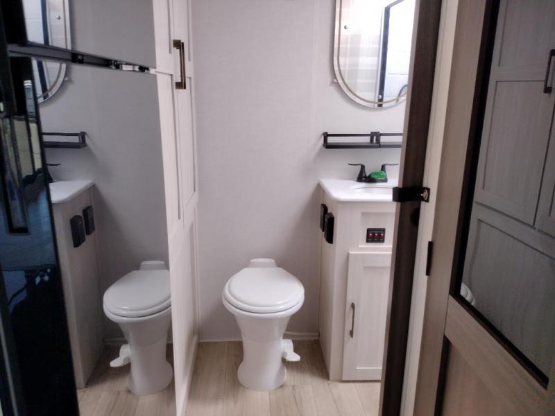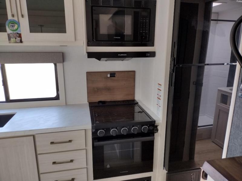 Whether you're camping with friends or family, you'll love the space and comfort found in this travel trailer. The outside kitchen is packed with features, such as a gas griddle, sink, refrigerator, and a shelf, plus there is a 21' electric awning for shade. Head inside to relax on the EZ- out sofa, or play a game at the booth dinette. You will also love the HD TV for your favorite shows at night. This model includes a full rear bath with a linen closet for clean towels and an upgraded slow-close shower door.