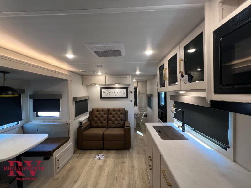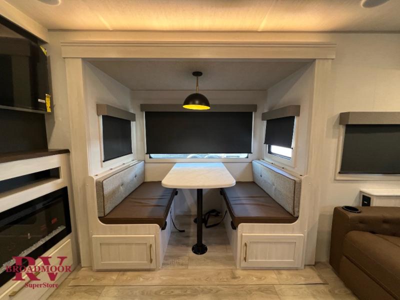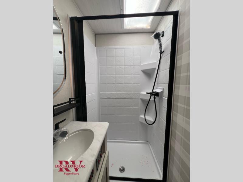 Whether you're camping with friends or family, you'll love the space and comfort found in this travel trailer. The outside kitchen is packed with features, such as a gas griddle, sink, refrigerator, and a shelf, plus there is a 21' electric awning for shade. Head inside to relax on the EZ- out sofa, or play a game at the booth dinette. You will also love the HD TV for your favorite shows at night. This model includes a full rear bath with a linen closet for clean towels and an upgraded slow-close shower door.