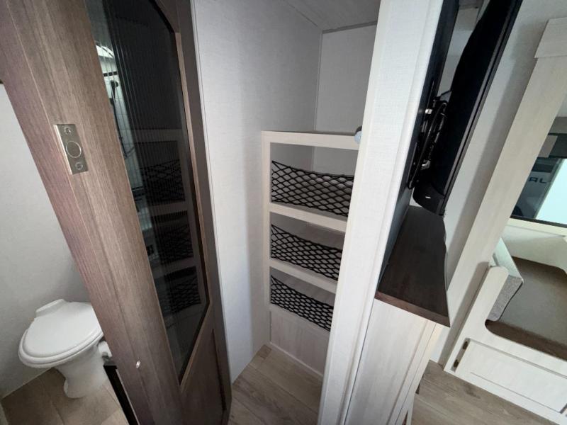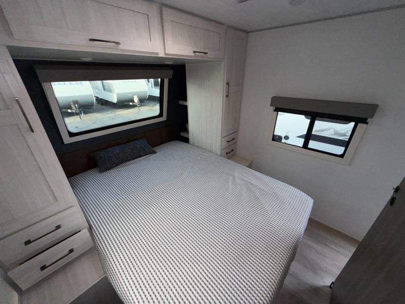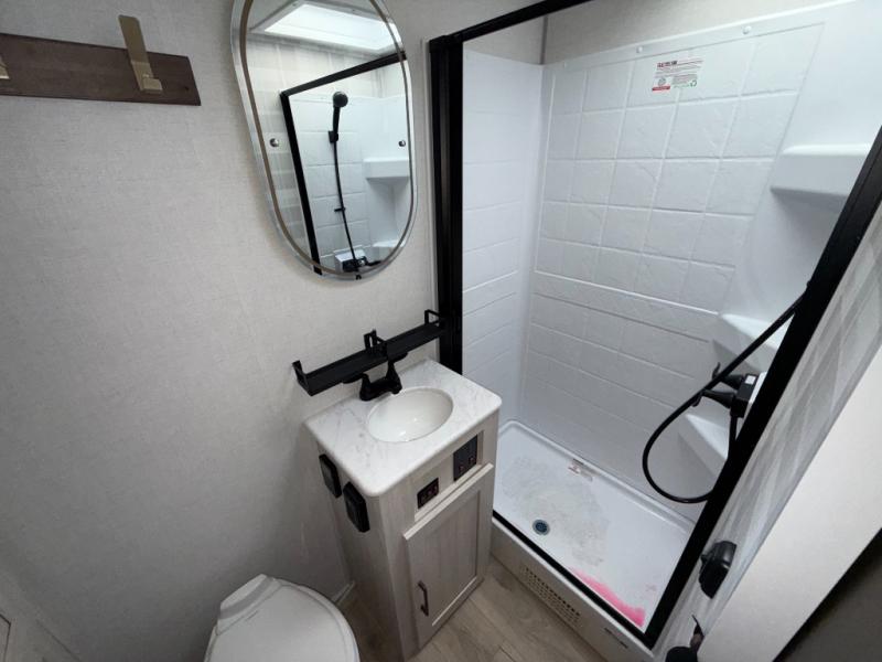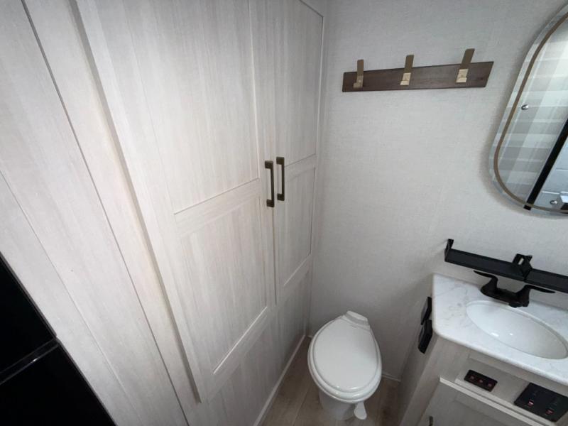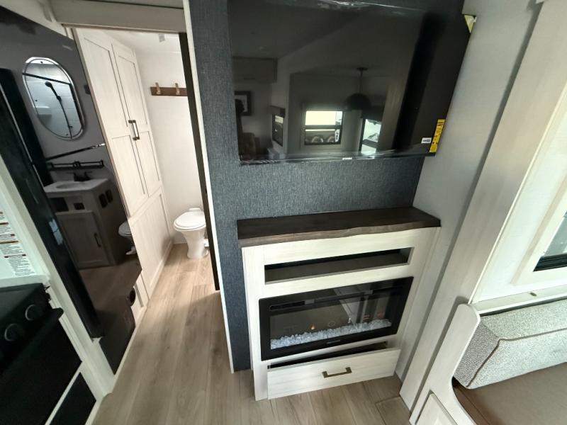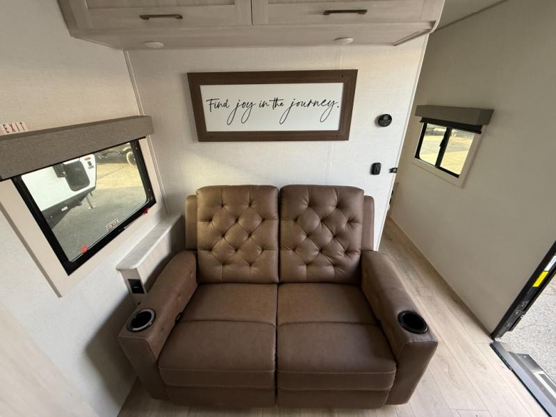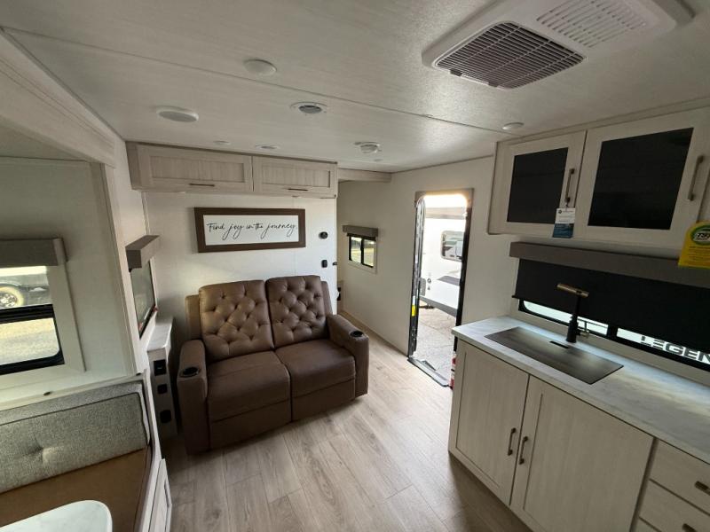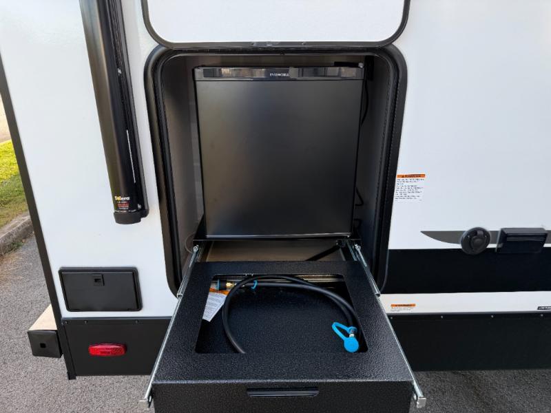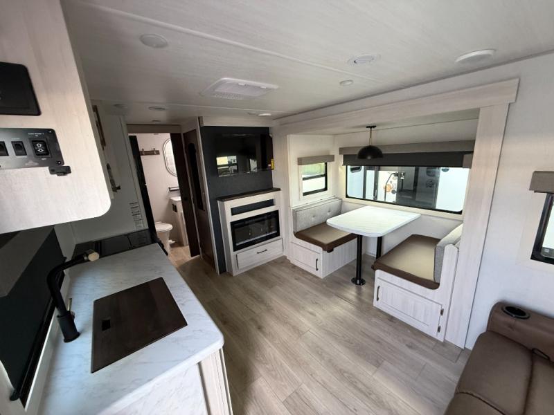 Whether you're camping with friends or family, you'll love the space and comfort found in this travel trailer. The outside kitchen is packed with features, such as a gas griddle, sink, refrigerator, and a shelf, plus there is a 21' electric awning for shade. Head inside to relax on the EZ- out sofa, or play a game at the booth dinette. You will also love the HD TV for your favorite shows at night. This model includes a full rear bath with a linen closet for clean towels and an upgraded slow-close shower door.