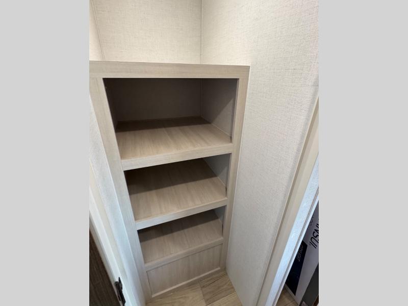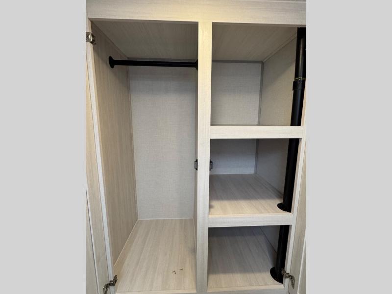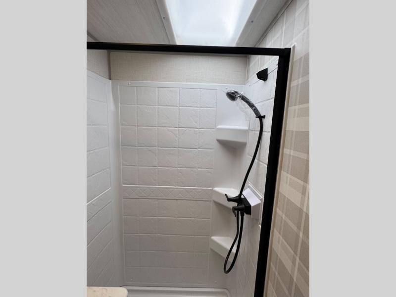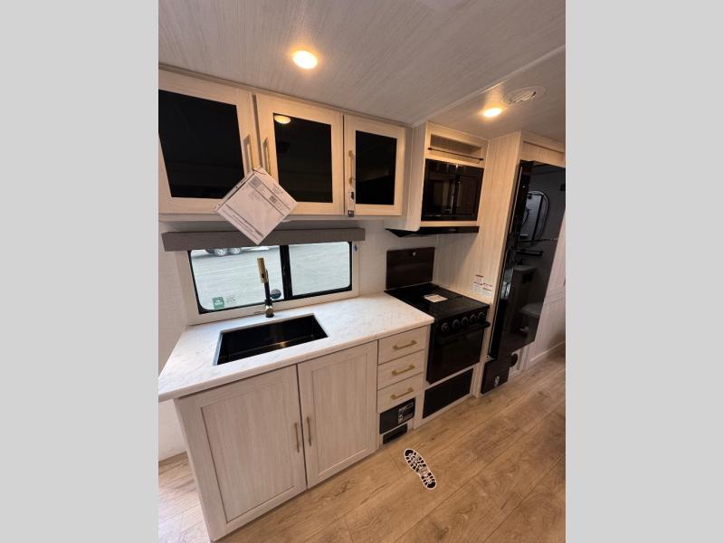 Whether you're camping with friends or family, you'll love the space and comfort found in this travel trailer. The outside kitchen is packed with features, such as a gas griddle, sink, refrigerator, and a shelf, plus there is a 21' electric awning for shade. Head inside to relax on the EZ- out sofa, or play a game at the booth dinette. You will also love the HD TV for your favorite shows at night. This model includes a full rear bath with a linen closet for clean towels and an upgraded slow-close shower door.