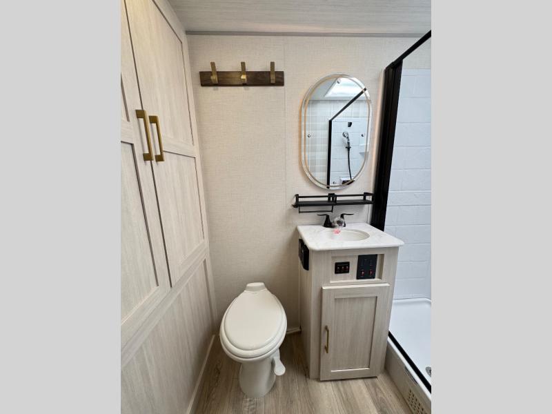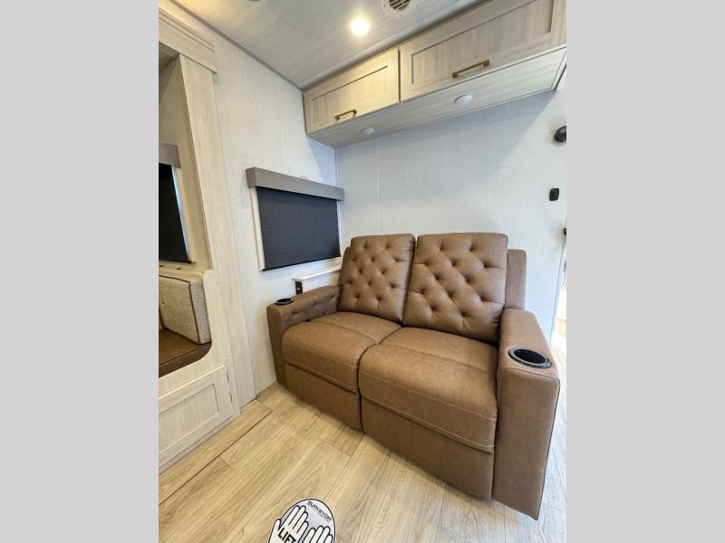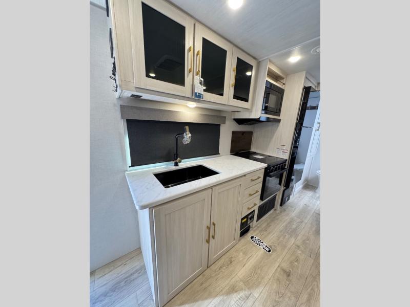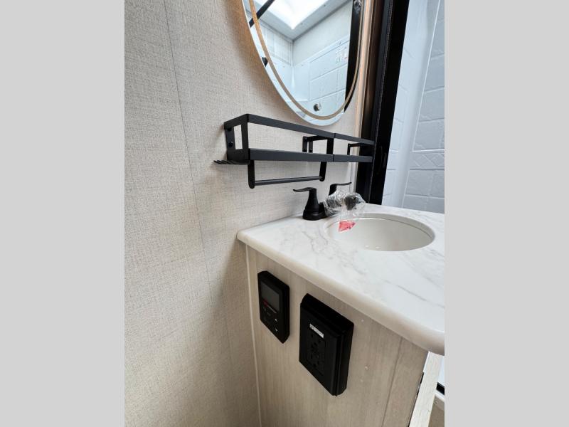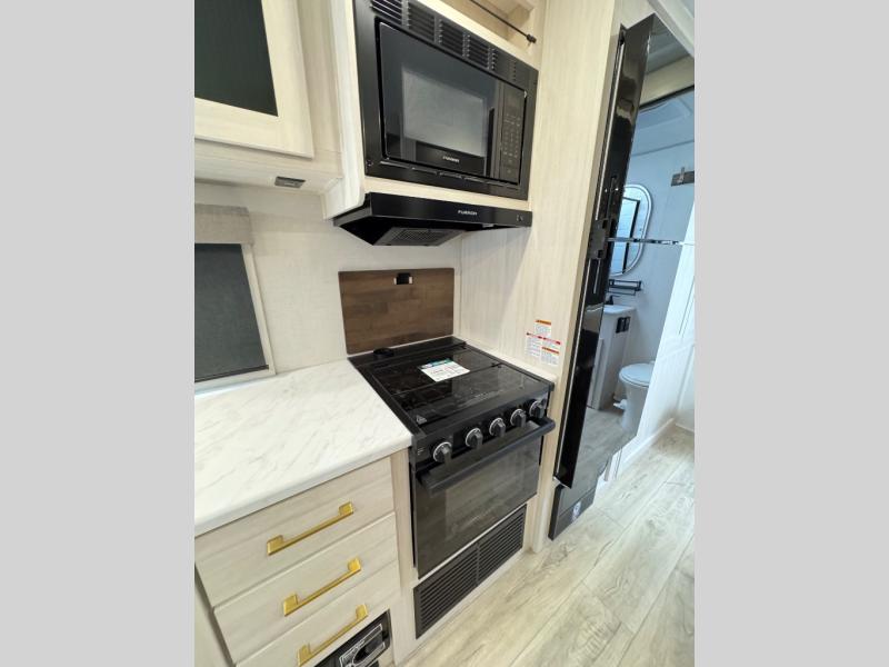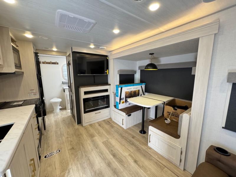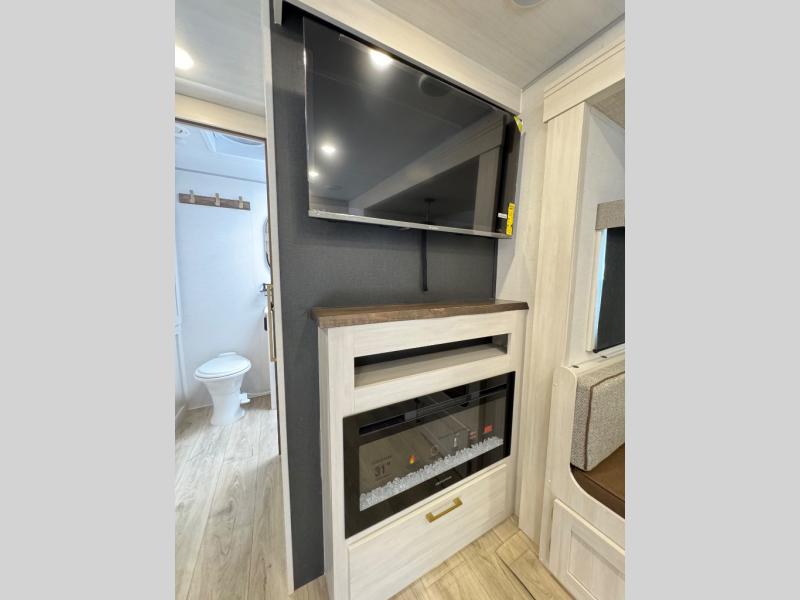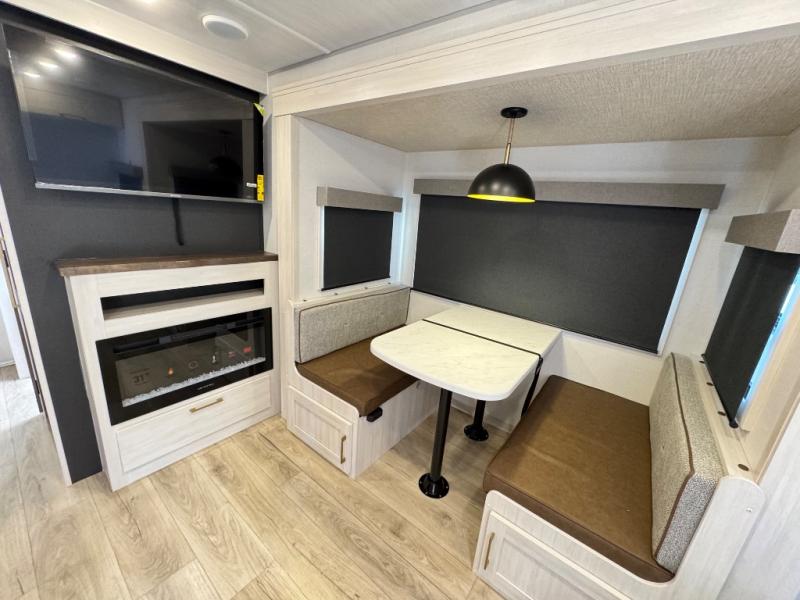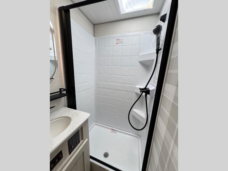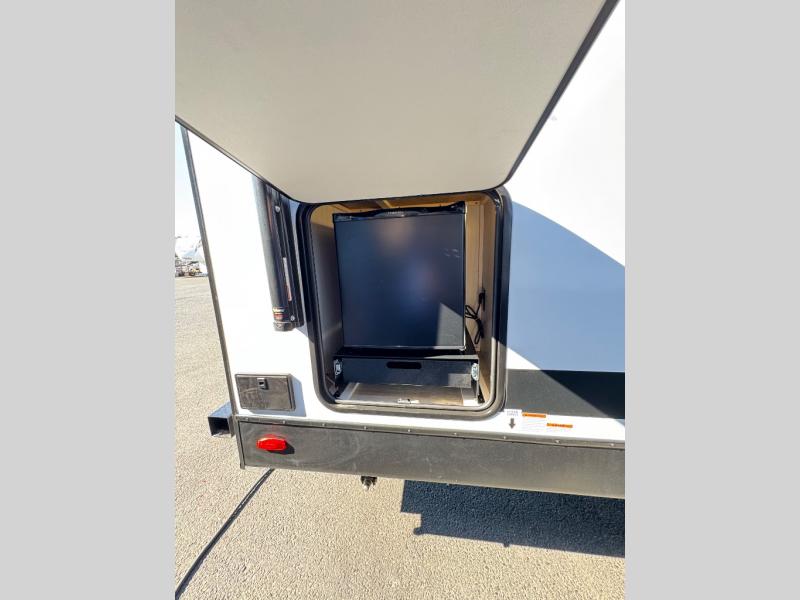Whether you're camping with friends or family, you'll love the space and comfort found in this travel trailer. The outside kitchen is packed with features, such as a gas griddle, sink, refrigerator, and a shelf, plus there is a 21' electric awning for shade. Head inside to relax on the EZ- out sofa, or play a game at the booth dinette. You will also love the HD TV for your favorite shows at night. This model includes a full rear bath with a linen closet for clean towels and an upgraded slow-close shower door.