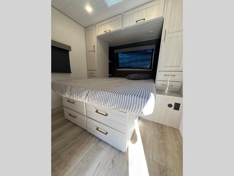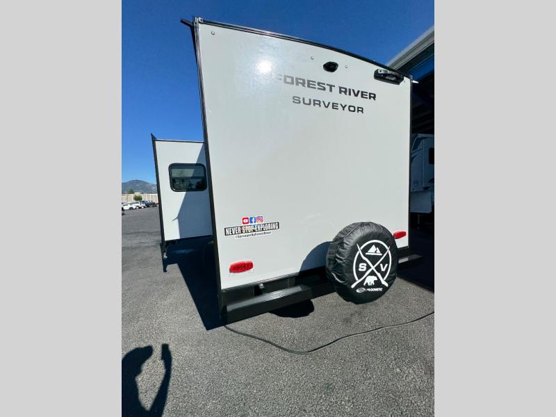 With any Surveyor Legend travel trailer by Forest River you will enjoy quality craftsmanship, convenient amenities, and at-home comforts. The Azdel composite walls provide a longer-lasting trailer, and the power tongue jack with a hitch light will get you back on the road in no-time. There are also Goodyear tires and a tire pressure monitoring system for hassle-free towing. Each model includes the Surveyor Legend Package that comes standard with oversized dinette storage access doors, front slam latch baggage doors, plus an automotive style tinted front windshield. You'll appreciate camping with a tankless water heater for endless hot showers, a 2" accessory hitch to bring bikes along, plus carpet-free interiors and a central vacuum system for easy clean up.