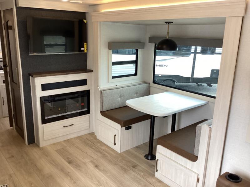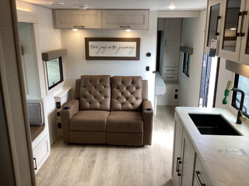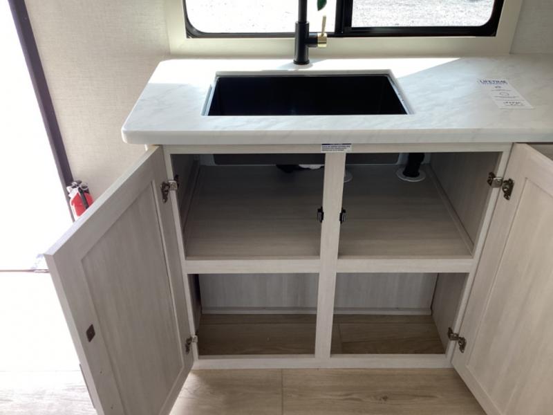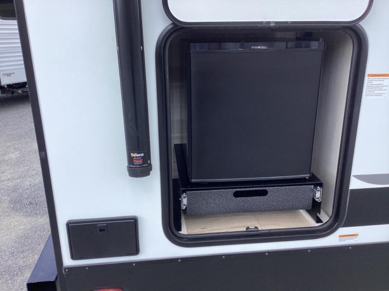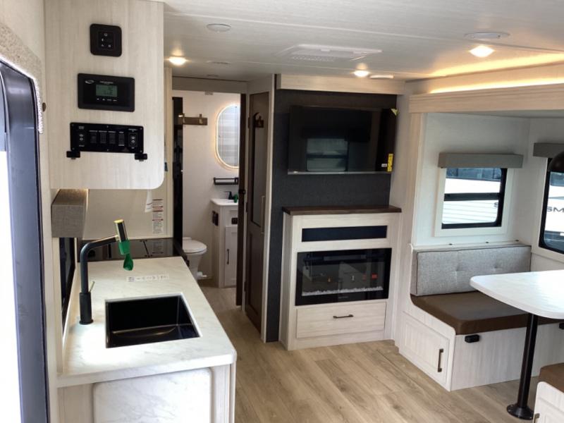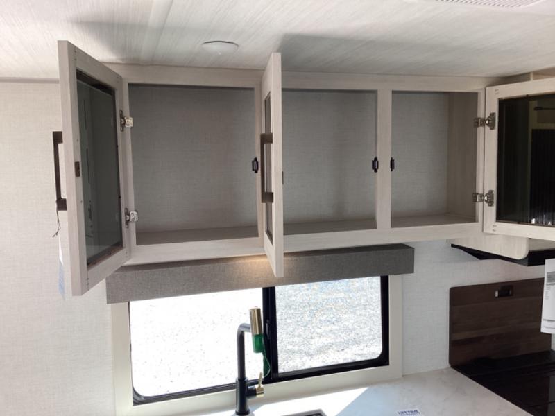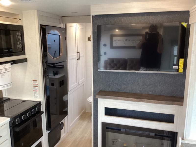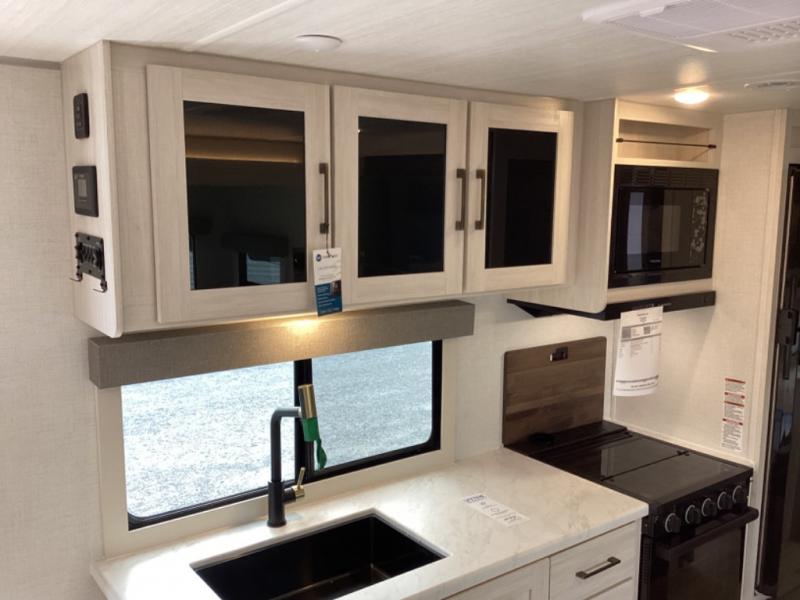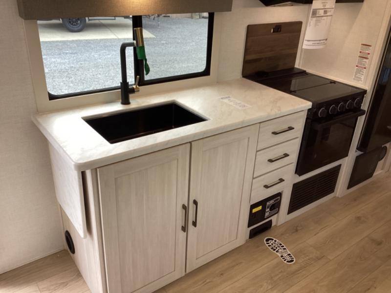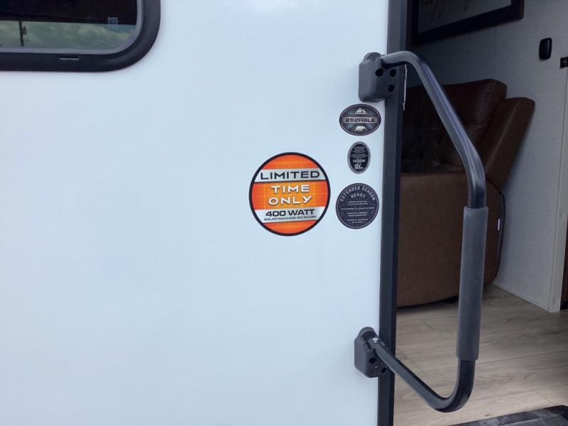 Whether you're camping with friends or family, you'll love the space and comfort found in this travel trailer. The outside kitchen is packed with features, such as a gas griddle, sink, refrigerator, and a shelf, plus there is a 21' electric awning for shade. Head inside to relax on the EZ- out sofa, or play a game at the booth dinette. You will also love the HD TV for your favorite shows at night. This model includes a full rear bath with a linen closet for clean towels and an upgraded slow-close shower door.
