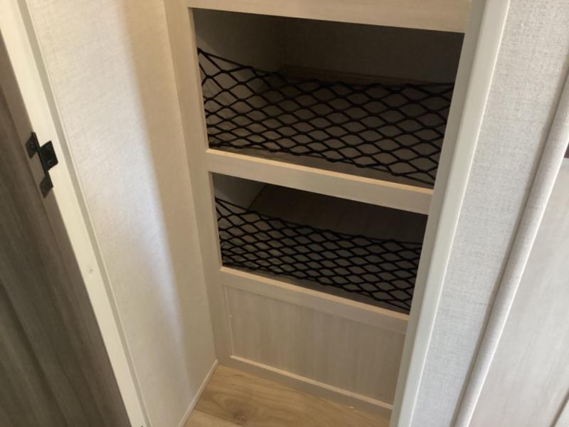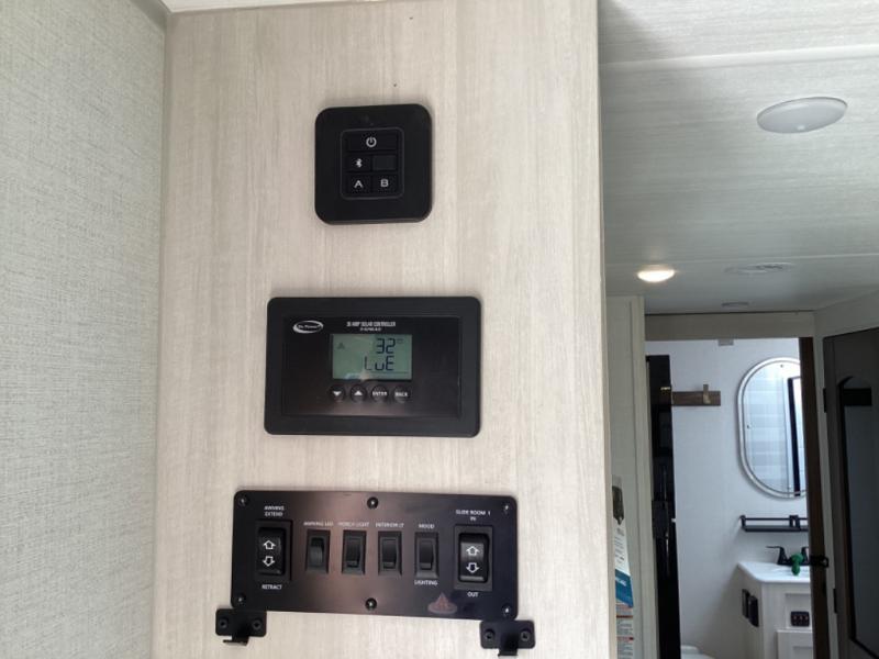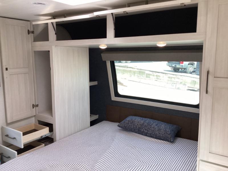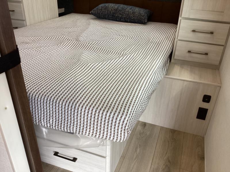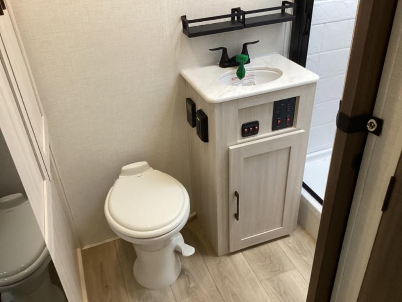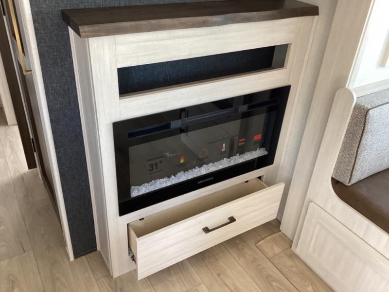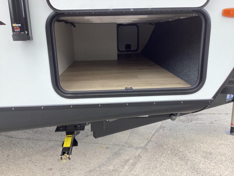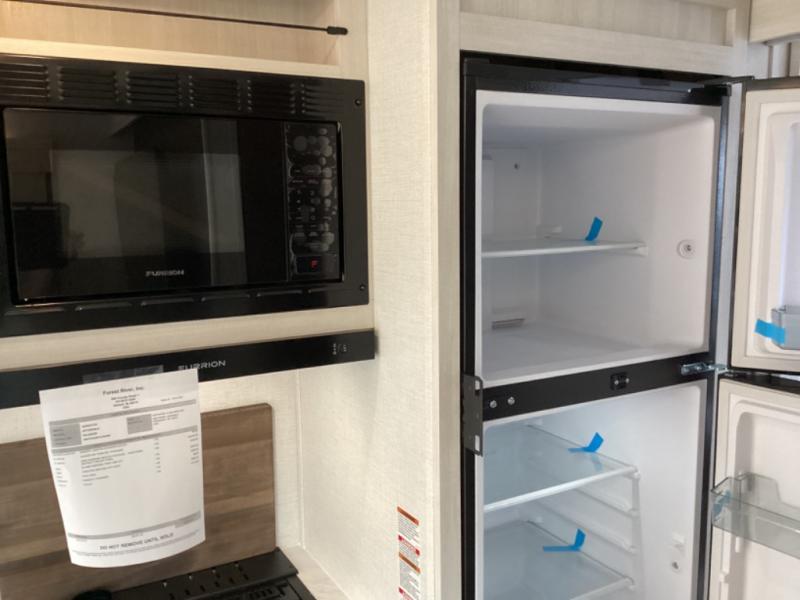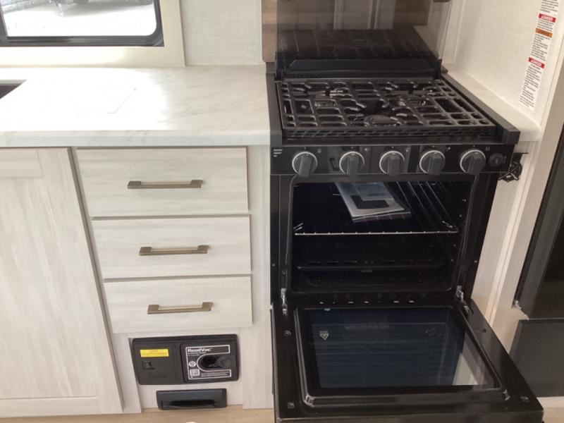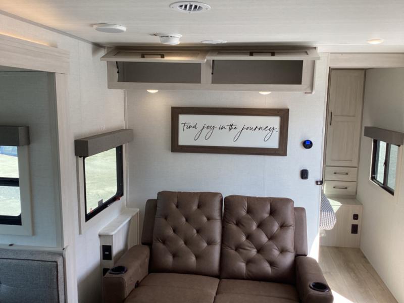 Whether you're camping with friends or family, you'll love the space and comfort found in this travel trailer. The outside kitchen is packed with features, such as a gas griddle, sink, refrigerator, and a shelf, plus there is a 21' electric awning for shade. Head inside to relax on the EZ- out sofa, or play a game at the booth dinette. You will also love the HD TV for your favorite shows at night. This model includes a full rear bath with a linen closet for clean towels and an upgraded slow-close shower door.